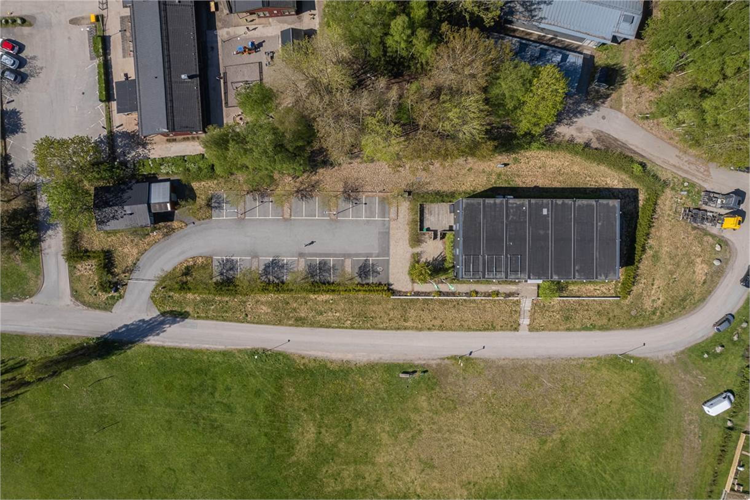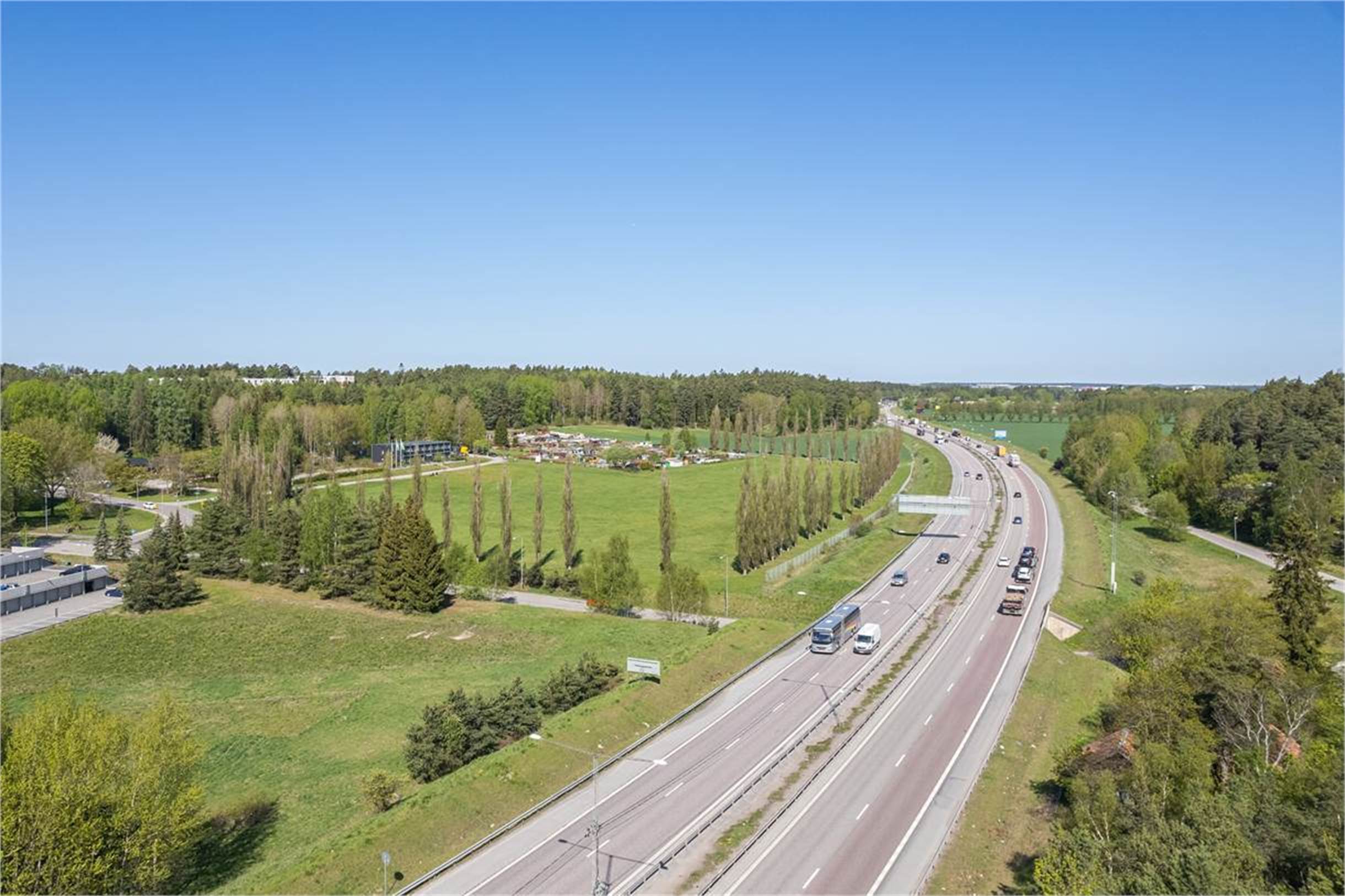 Läget är både naturnära och strategiskt, precis intill en av de mest trafikerade vägarna i området – med upp till 80 000 fordon passerande varje dygn. Det skapar ett exceptionellt skyltläge och stark exponering för verksamheten. På tomten finns dessutom 23 parkeringsplatser, varav flera med elstolpar.