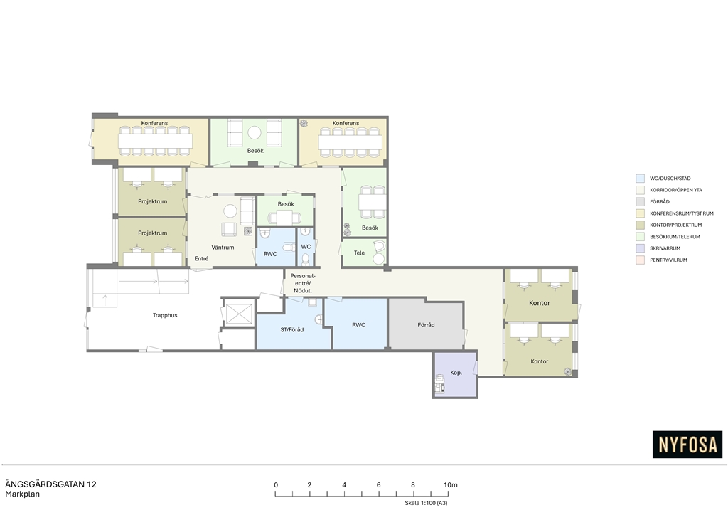 Kontor i markplan med en praktisk planlösning som idag rymmer flera cellkontor och konferensrum perfekt för er som söker tydliga arbetsytor och mötesmöjligheter.