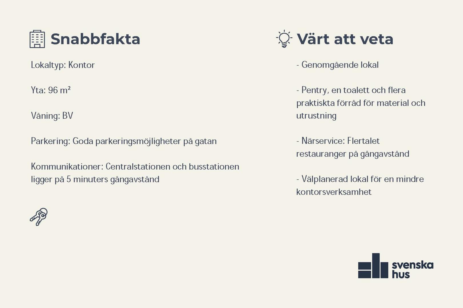 Nu finns en trevlig lokal på 96 kvm tillgänglig i centrala Hässleholm, med kort avstånd till tågstationen och goda kommunikationer. I direkt anslutning till lokalen ligger Hembygdsparken med fina grönområden och promenadstråk. Lokalen erbjuder bland annat ett rymligt rum som kan användas som konferensrum eller öppen kontorsyta, samt ett separat kontorsrum med balkong. Den är även utrustad med pentry och erbjuder goda förvaringsmöjligheter. Tack vare att lokalen är genomgående med fönster på båda sidor får den ett fint ljusinsläpp. Välkommen att kontakta oss för visning!