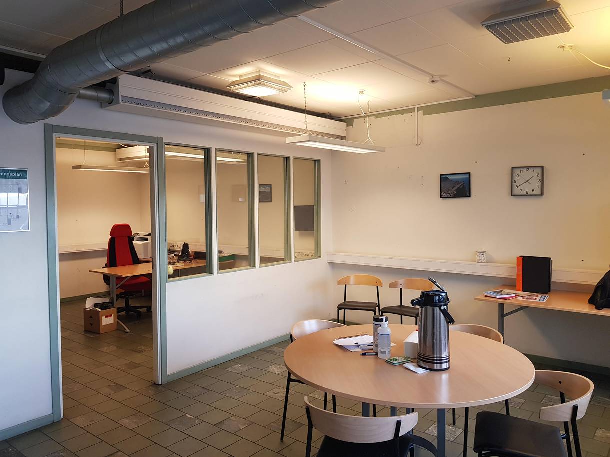 Ca 102 - 220 kvm kontor, omklädningsrum och fikarum på bottenvåning med liten uteplats i väster.