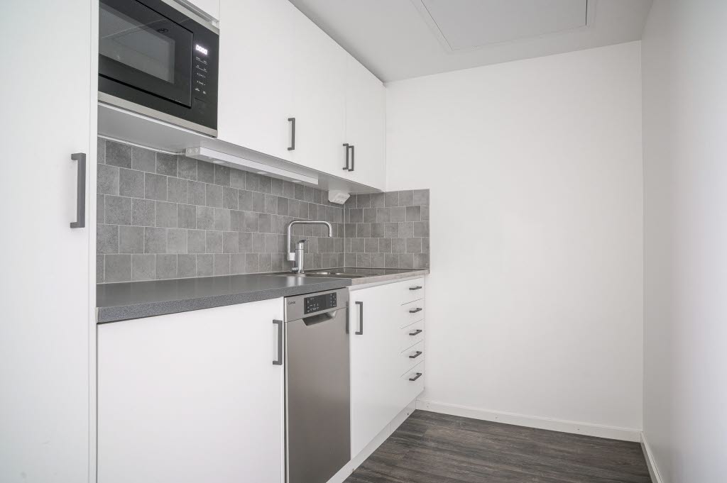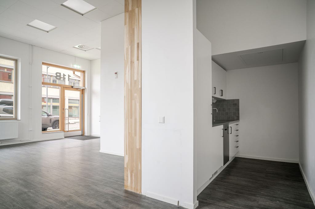 Planlösningen är effektiv och inkluderar städskåp, kyl/frys, diskmaskin samt mikrovågsugn. Det sänkta undertaket skapar en behaglig arbetsmiljö med möjlighet till anpassad belysning. Lokalen passar utmärkt för showroom, butik eller kontor.
