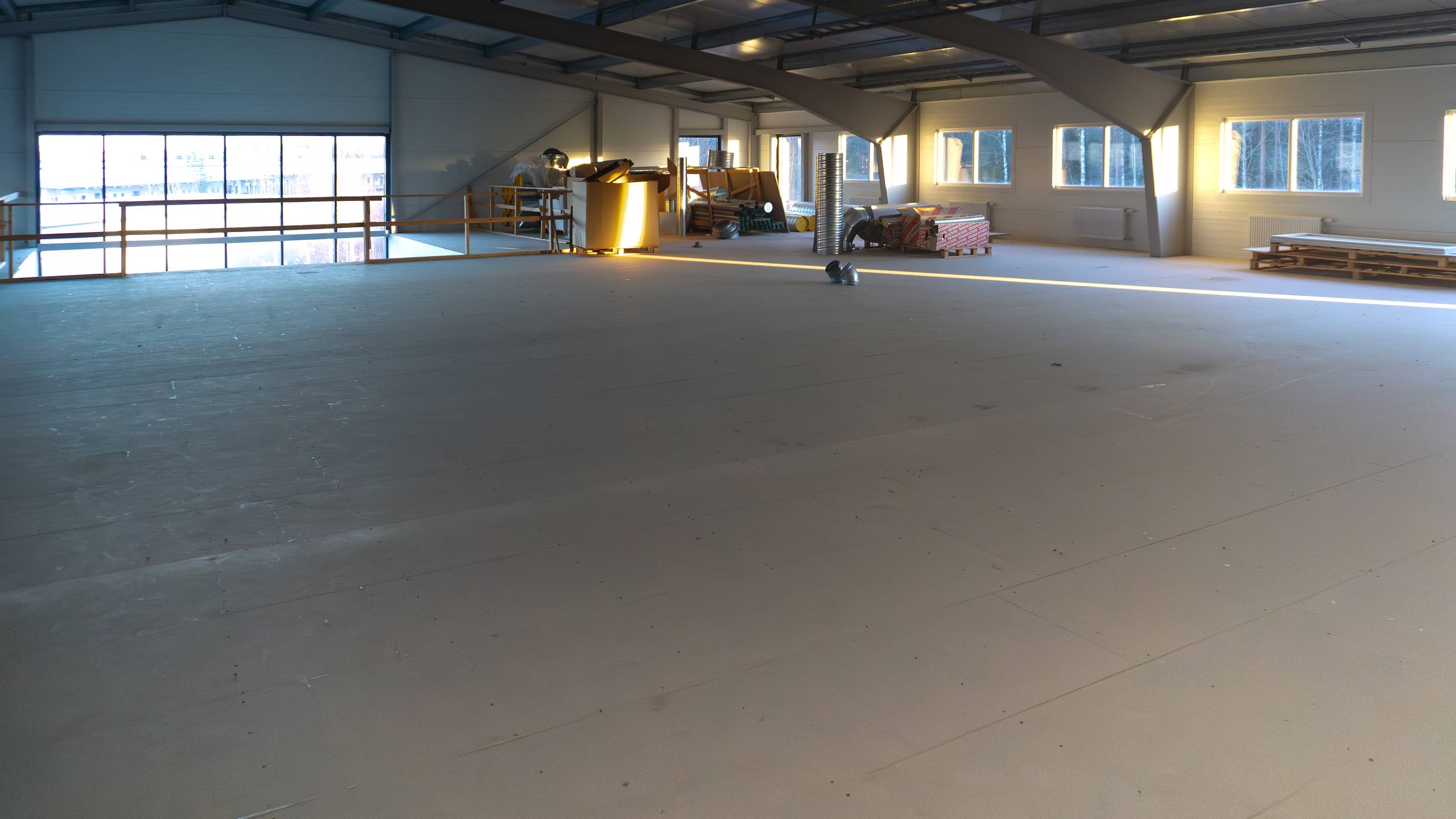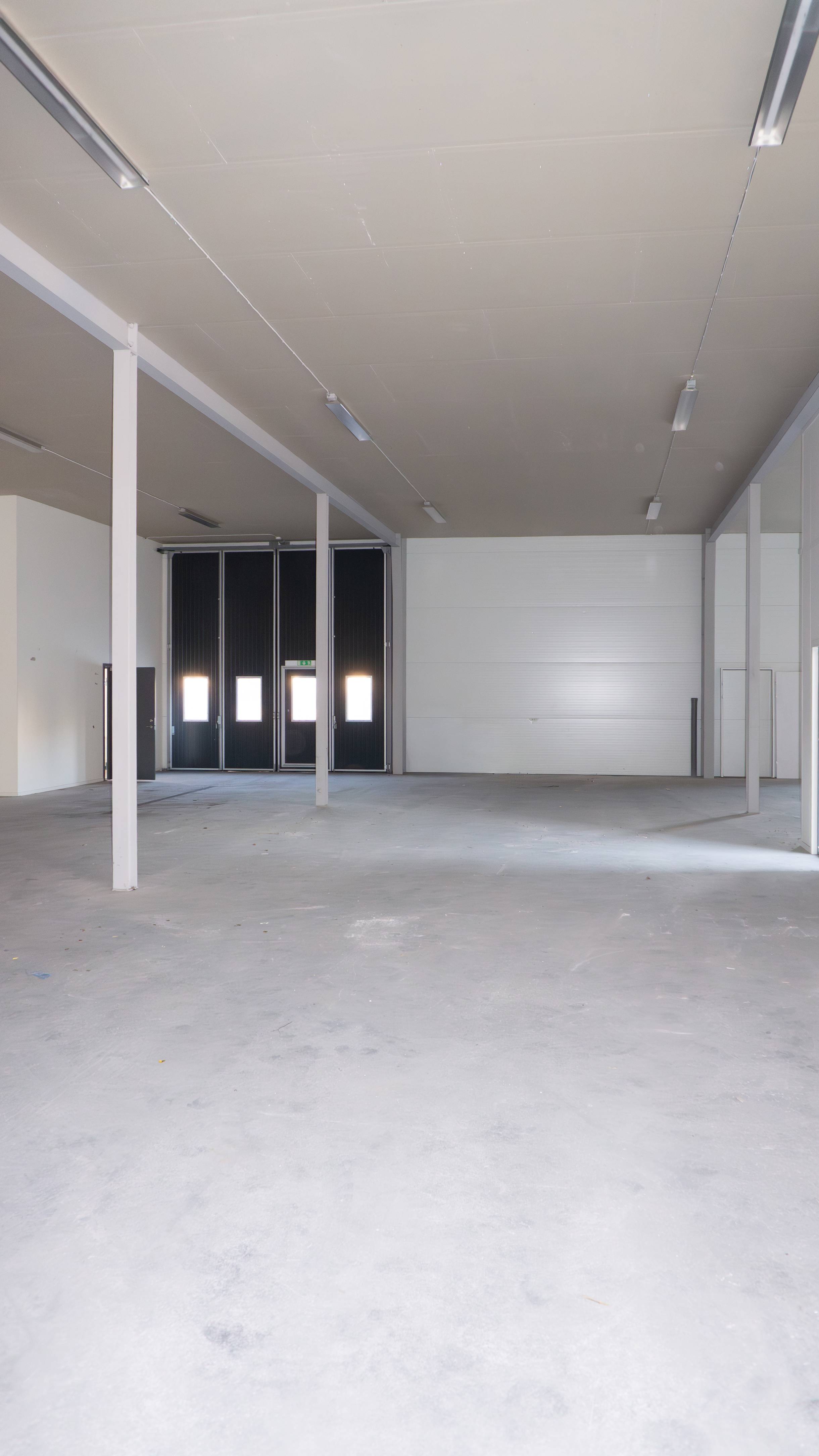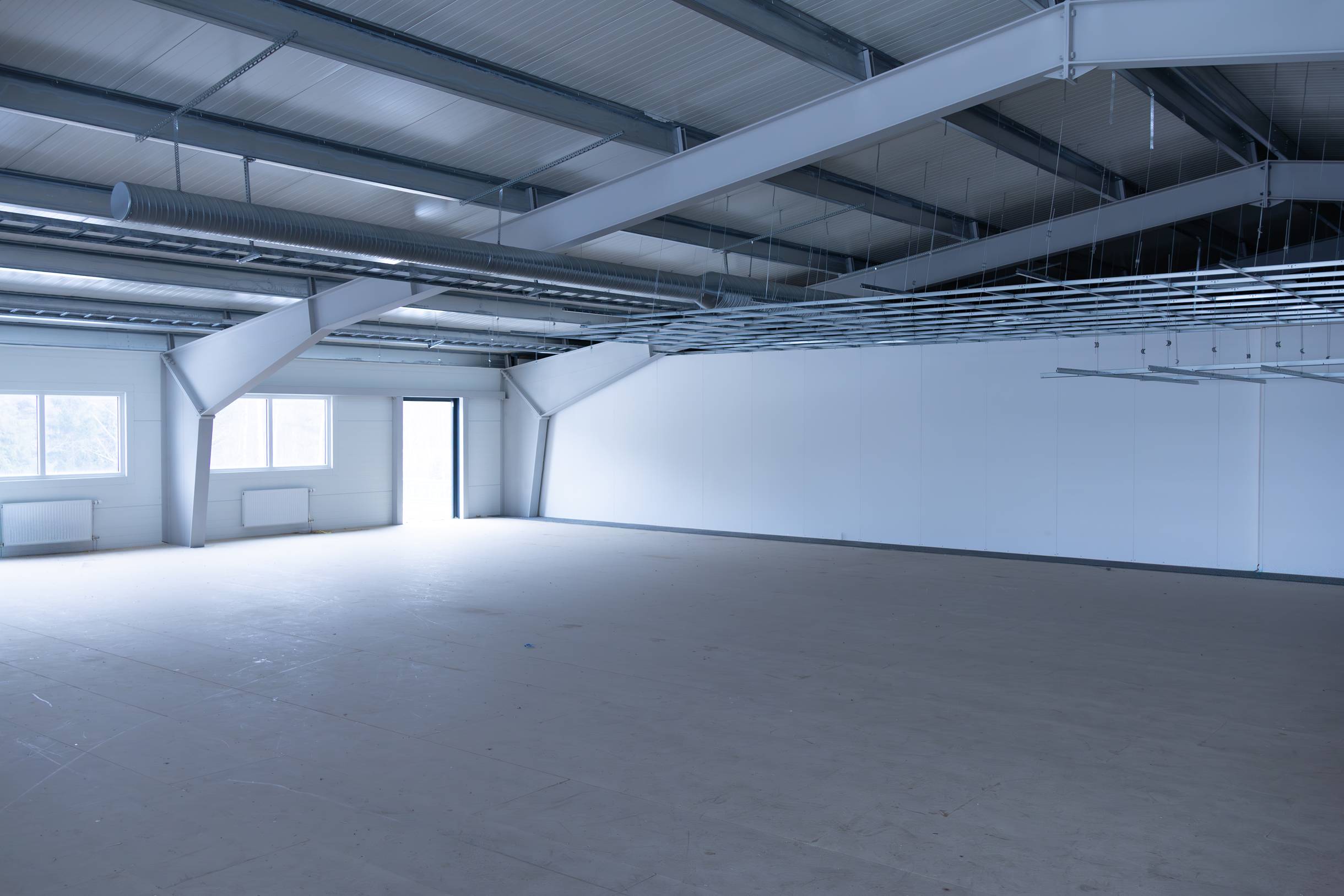 Cirka 5 meter i takhöjd och öppen planyta med stålbjälkar.