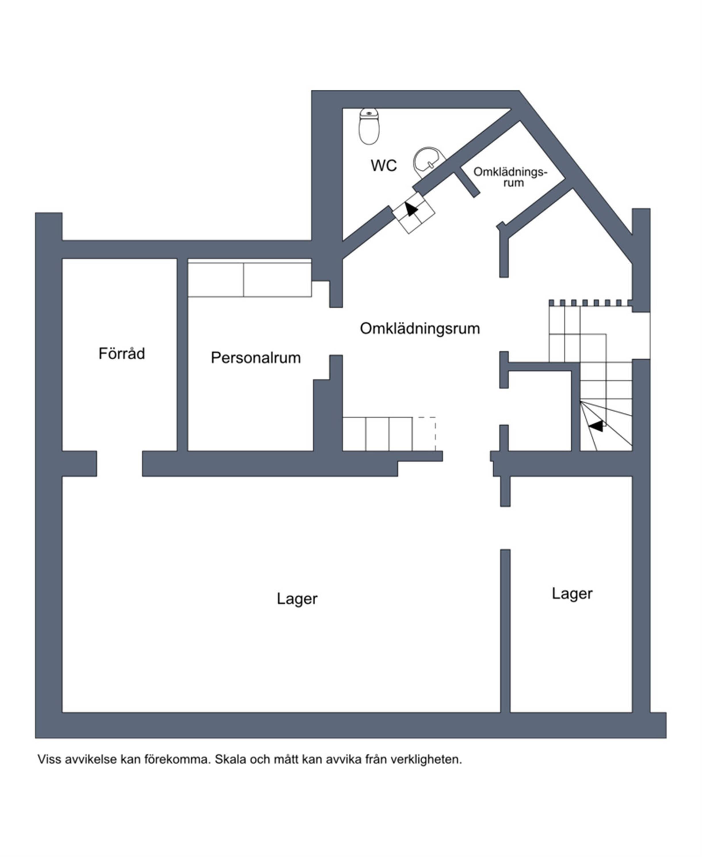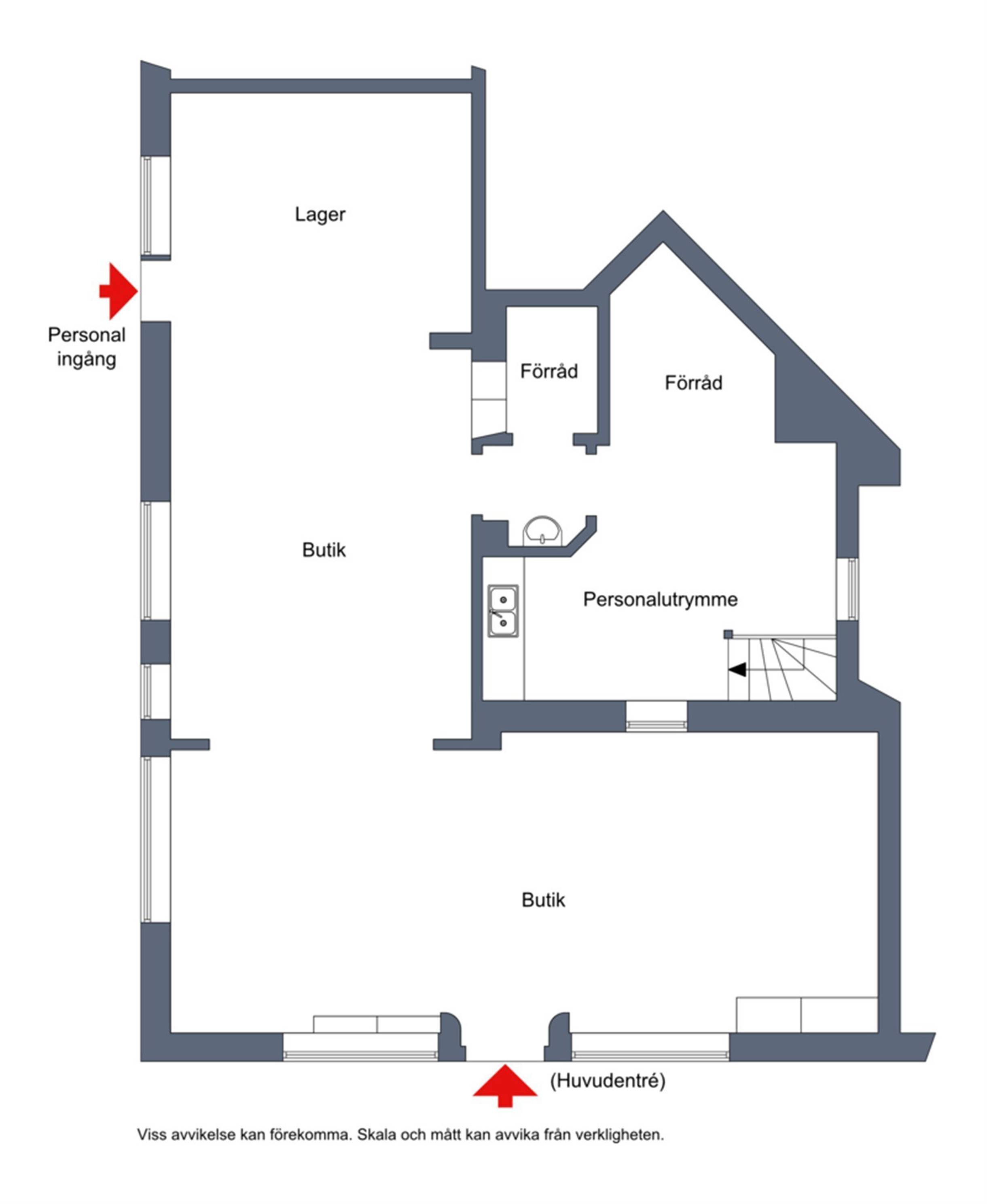 Till lokalen finns två ingångar där entréplanet erbjuder en öppen och fin butiksyta samt personalutrymmen. Källardelen har toalett, omklädning och stora fina lagerytor. Se planlösning. Lokalen är i behov av renovering.