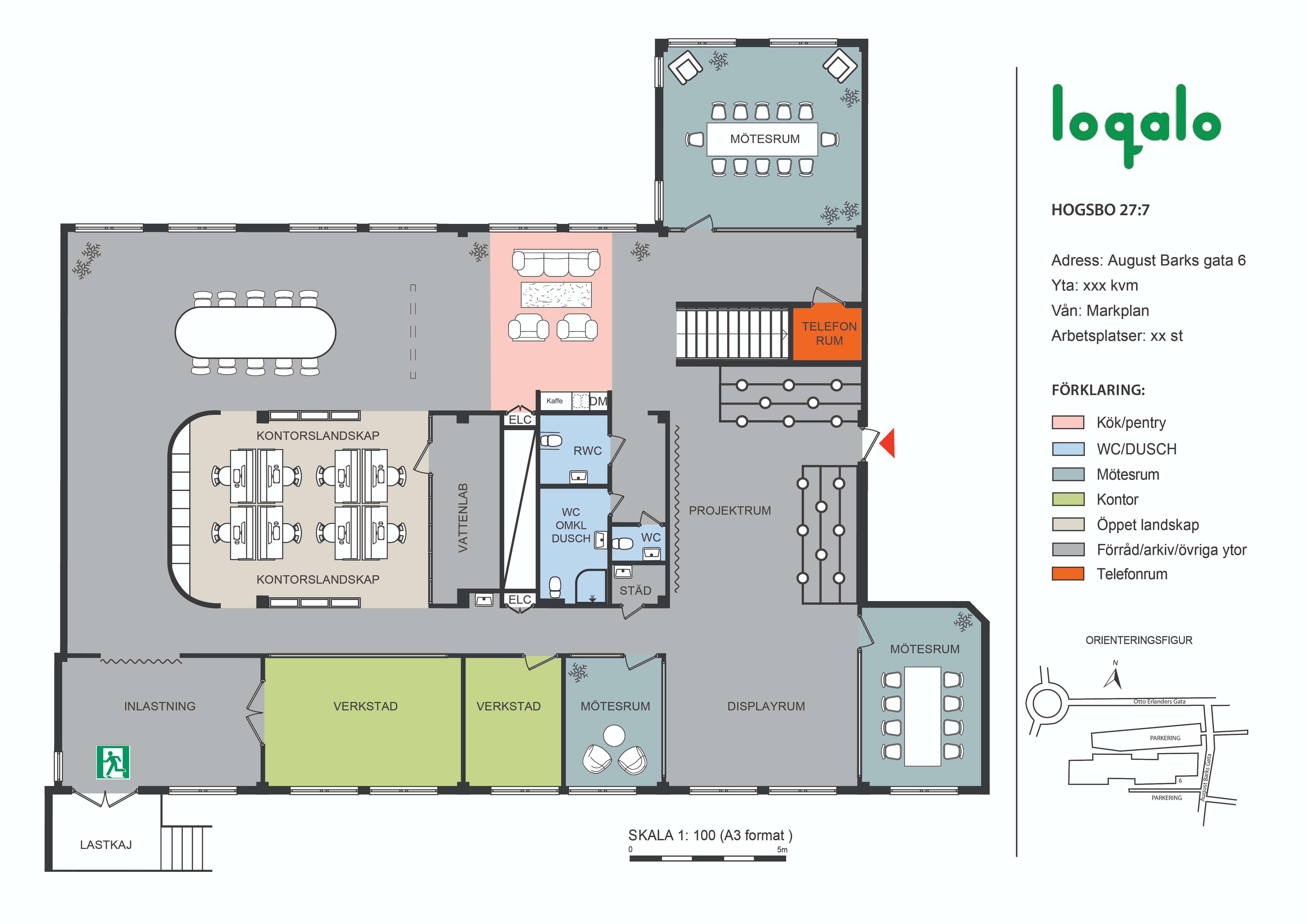 Planlösningen är flexibel och kan anpassas i samråd med hyresgäst för att möta verksamhetens specifika behov.