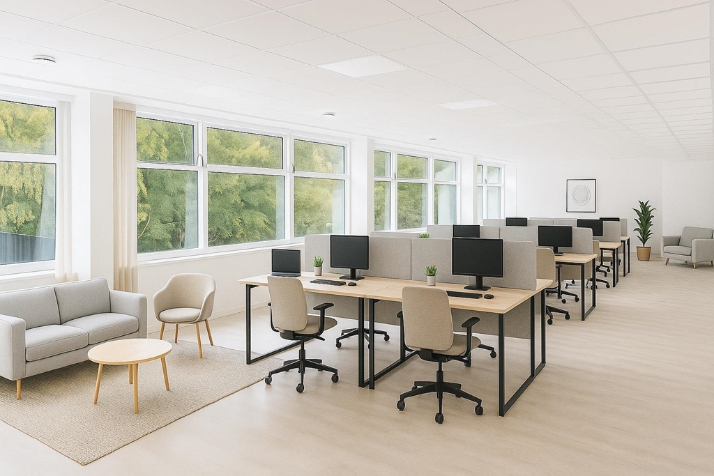 Generösa fönsterpartier bidrar till ett rikligt dagsljusinsläpp som skapar en ljus, trivsam och inspirerande arbetsmiljö. De öppna ytorna tillsammans med ljusinsläppet ger lokalen en luftig känsla som uppskattas av både medarbetare och besökare.