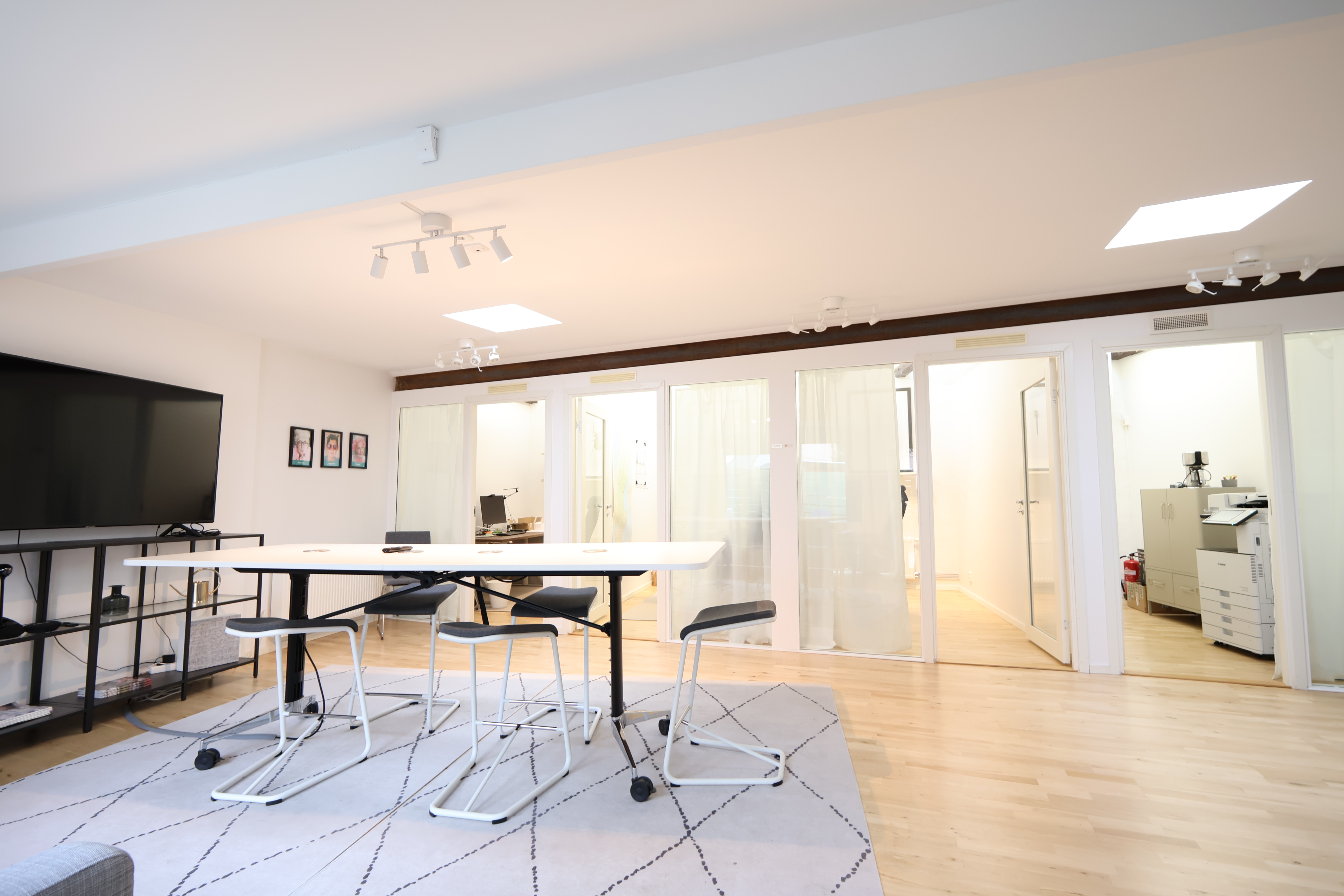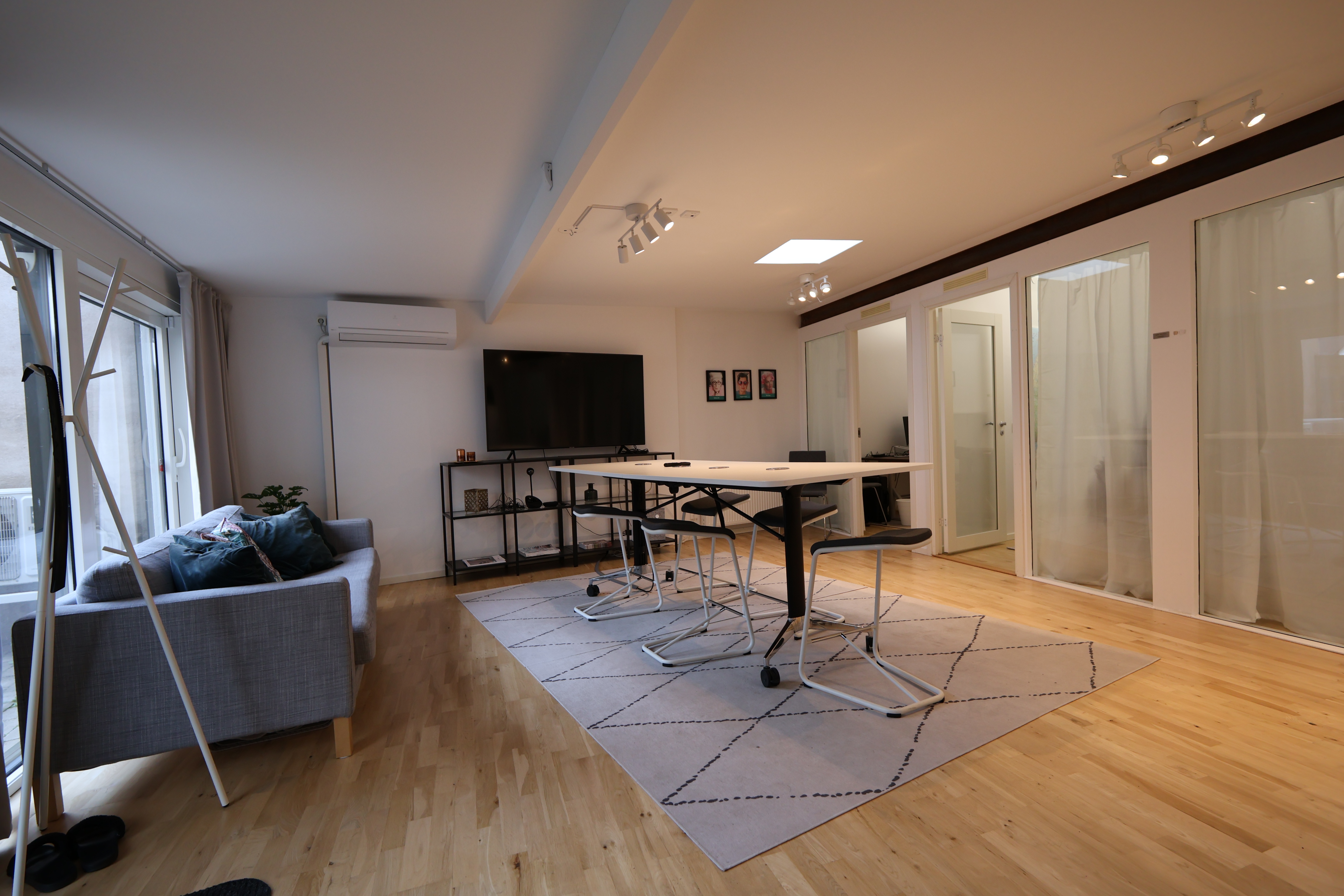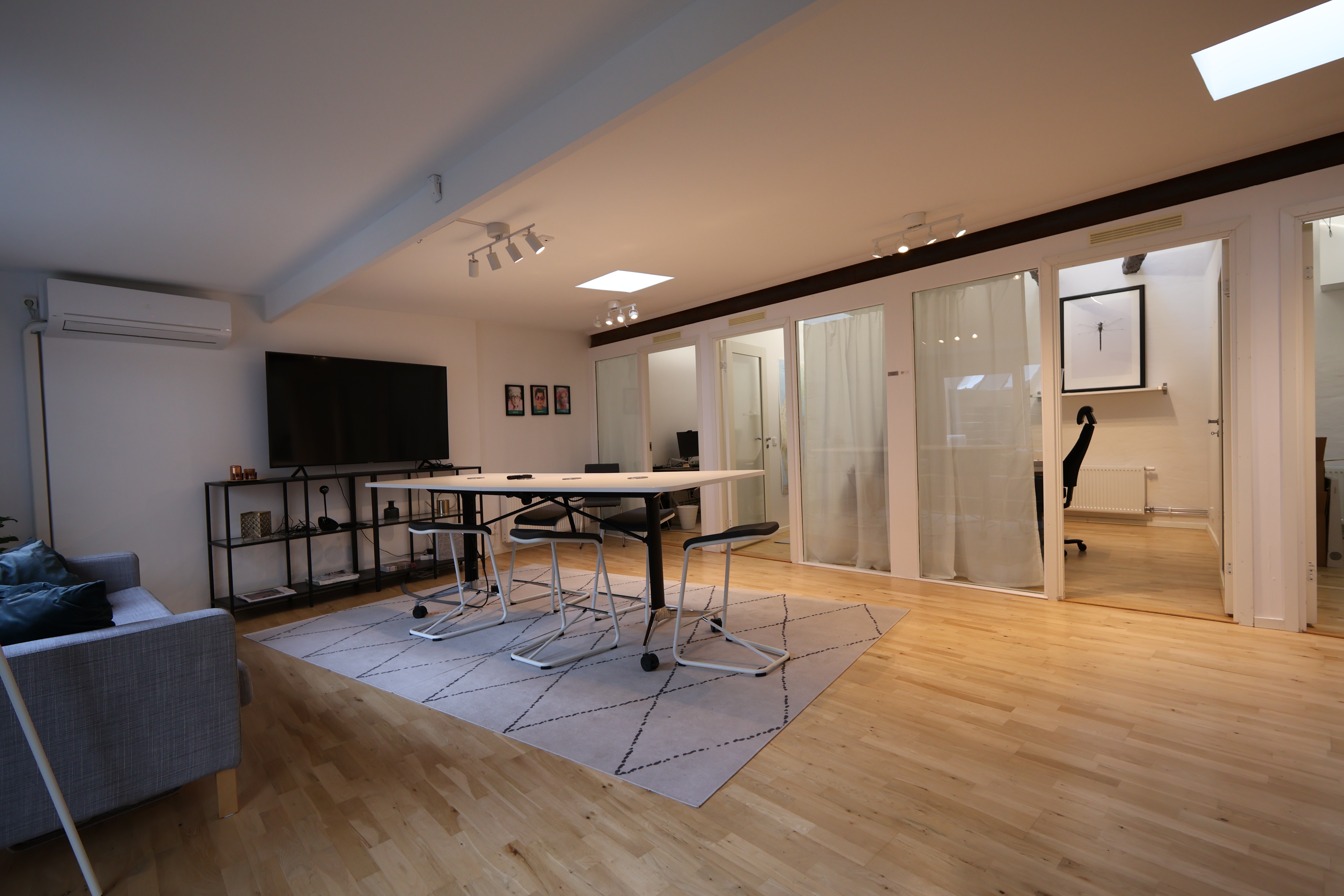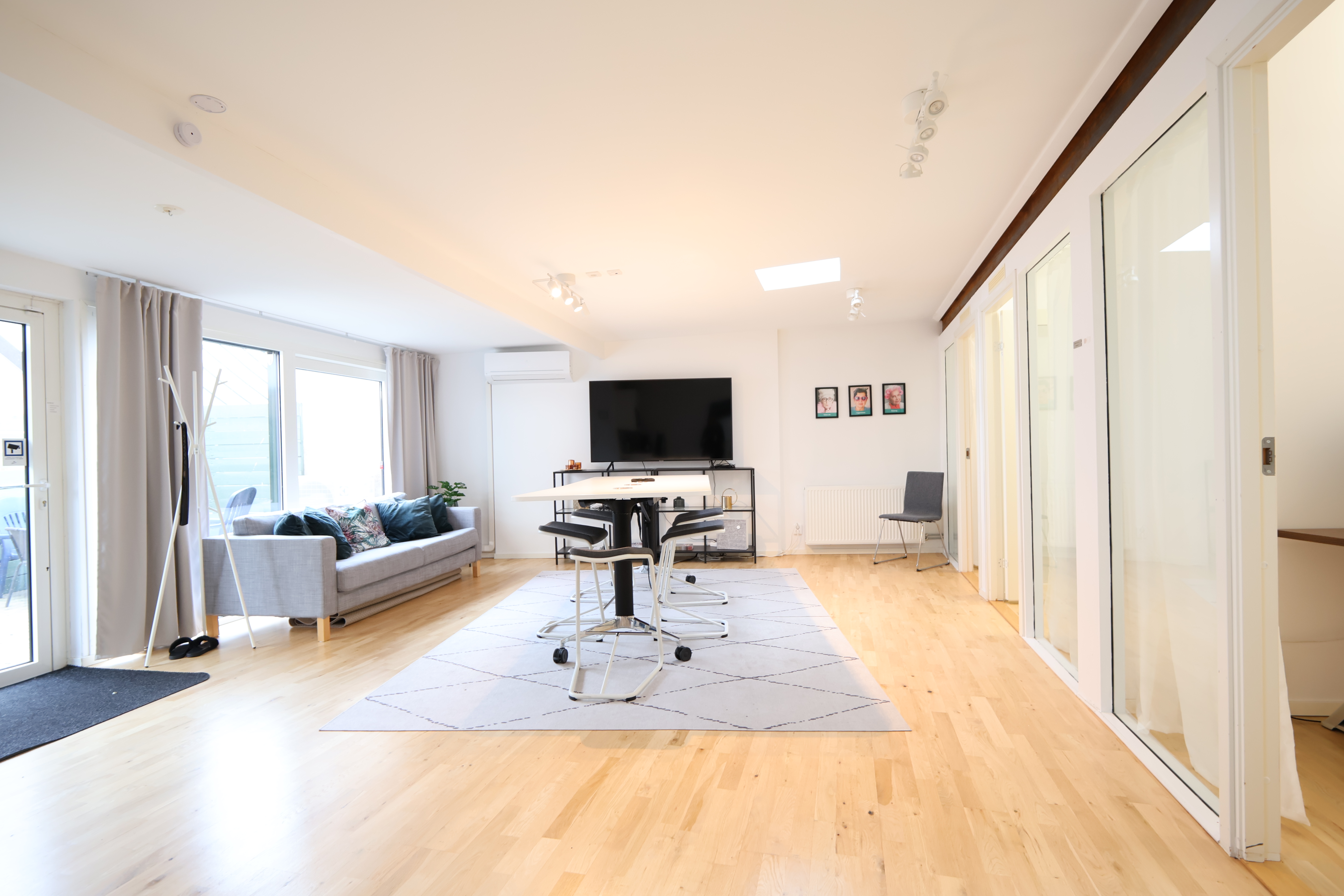 Lokalen består av tre kontorsrum, ett mötesrum samt en öppen yta som med fördel kan användas som kontorslandskap, gemensam arbetsyta eller större konferensyta. De stora fönstren vetter mot innergården och släpper in ett generöst dagsljus, vilket skapar en inspirerande arbetsmiljö.