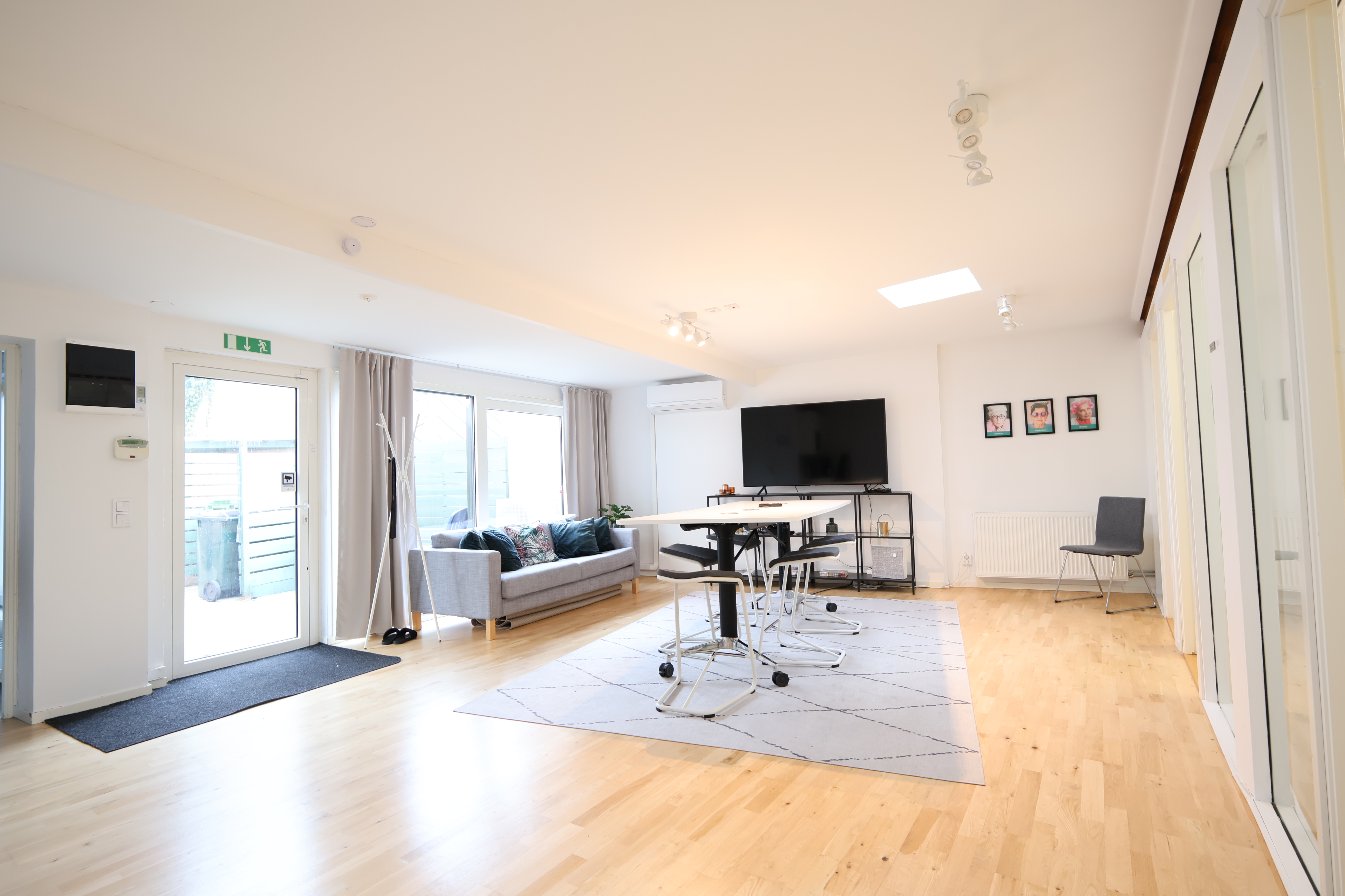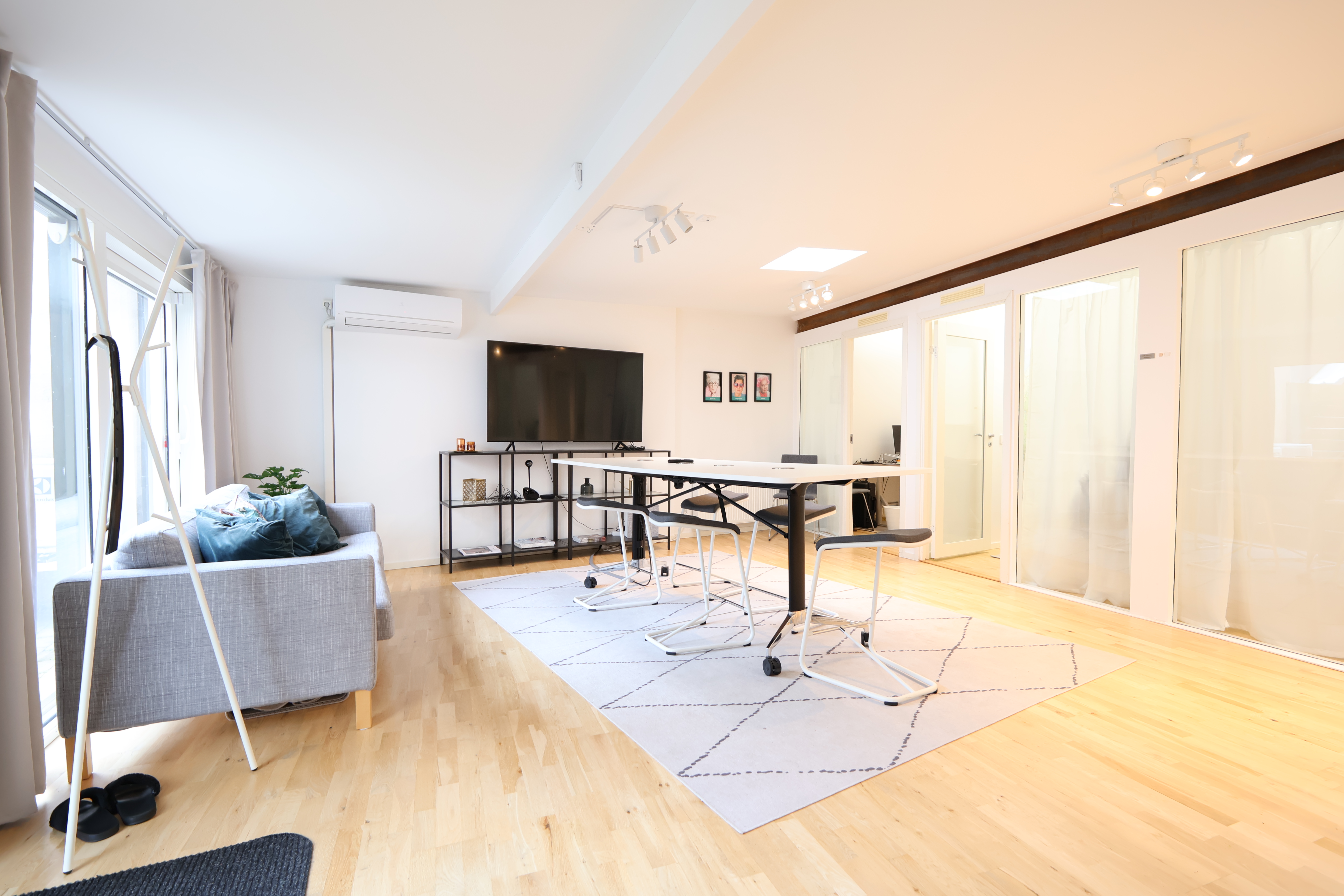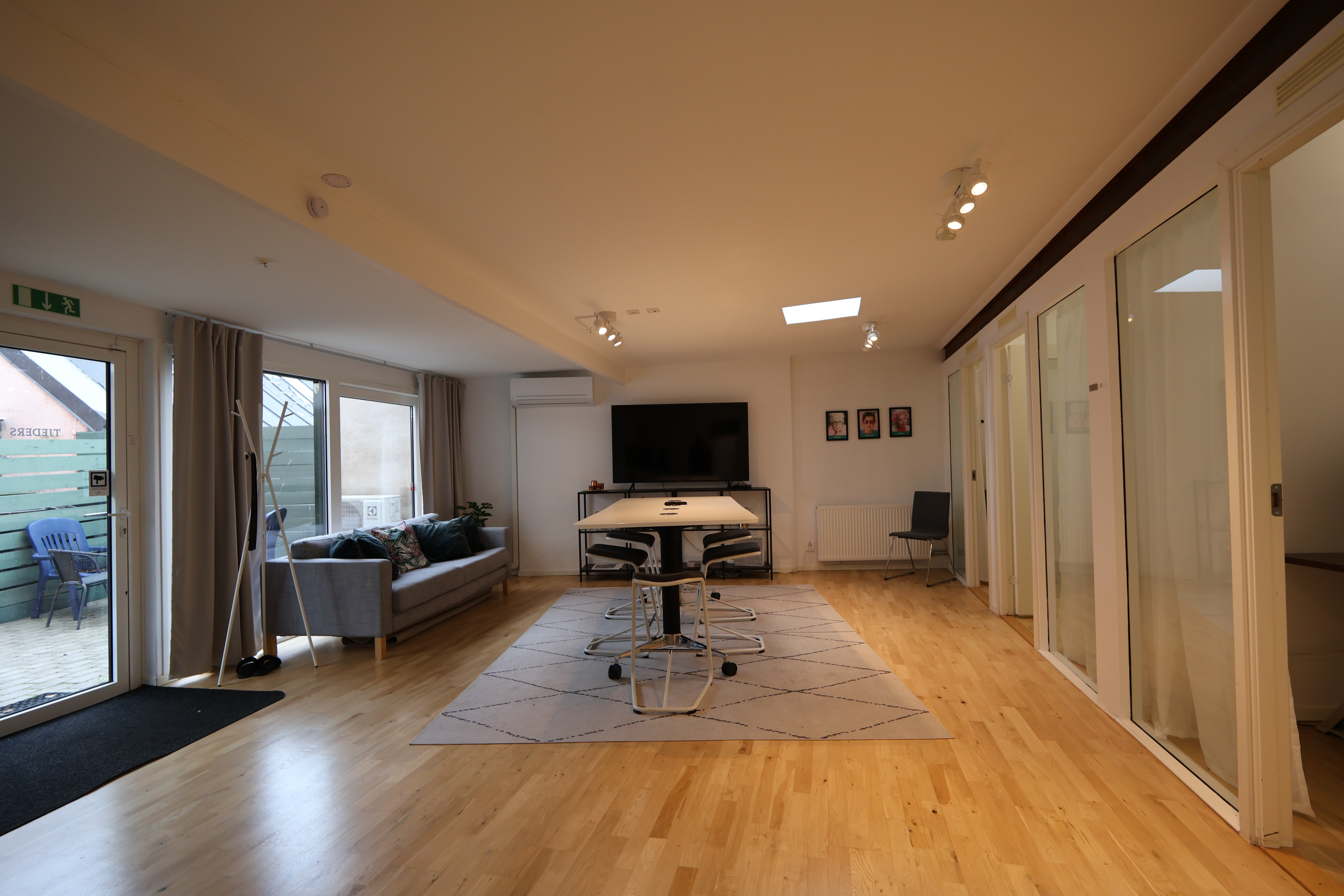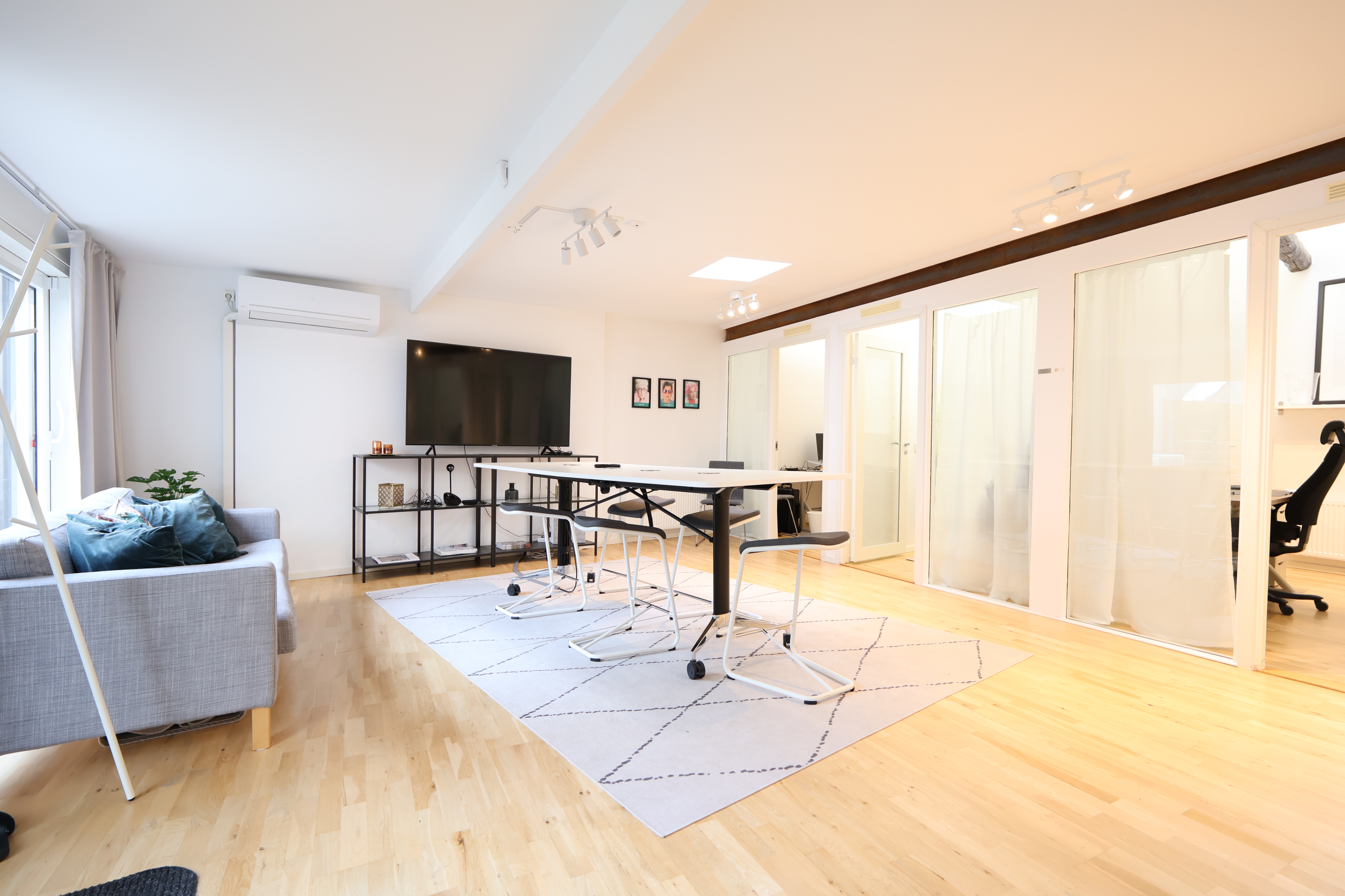 Lokalen består av tre kontorsrum, ett mötesrum samt en öppen yta som med fördel kan användas som kontorslandskap, gemensam arbetsyta eller större konferensyta. De stora fönstren vetter mot innergården och släpper in ett generöst dagsljus, vilket skapar en inspirerande arbetsmiljö.