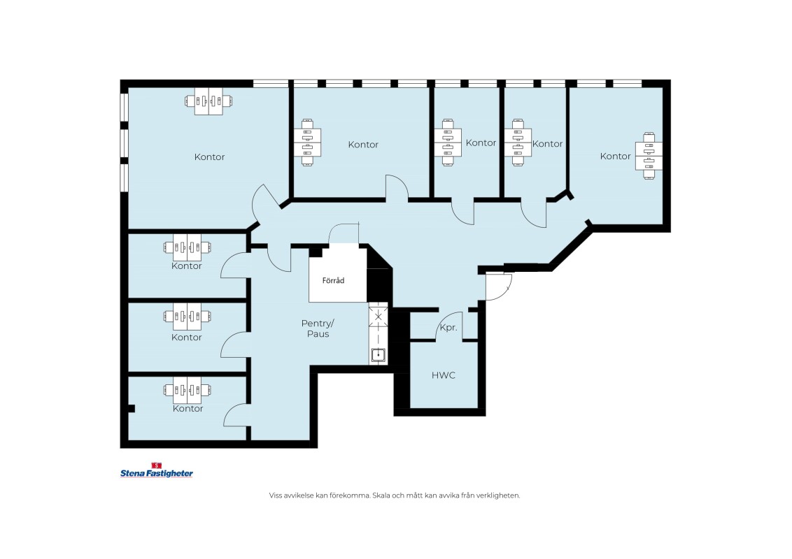 Den rymliga layouten med åtta rum erbjuder gott om plats för att skapa olika arbetsområden, konferensrum eller teamrum. Det stora förrådet möjliggör enkel förvaring av dokument och utrustning, medan pentryt är perfekt för pauser och luncher. Ta nästa steg och utforska möjligheterna i denna dynamiska stadsdel.