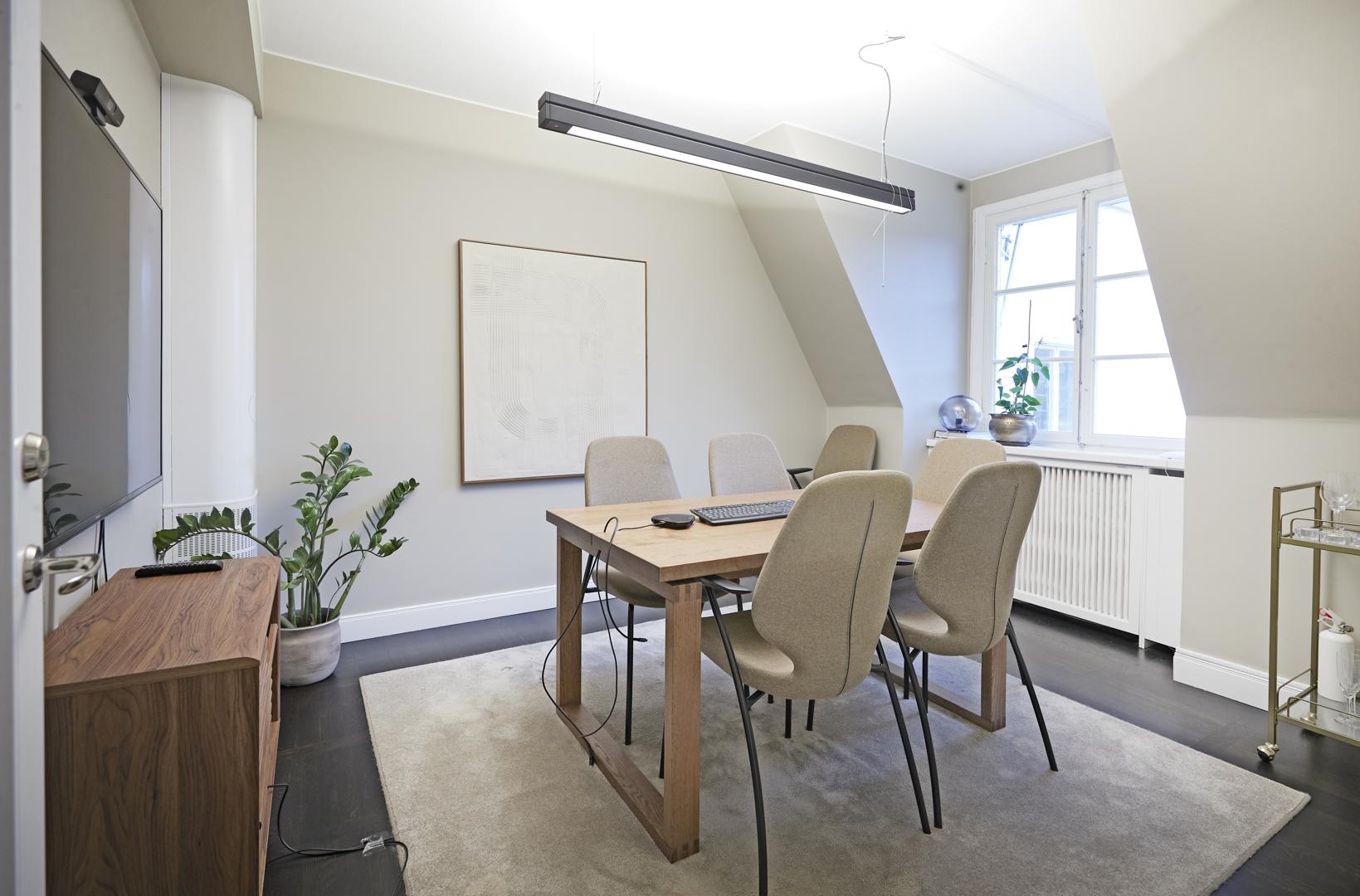 Planlösningen består av ett öppet arbetslandskap och ett separat kontor, kompletterat med mötesrum i varierande storlekar som passar allt från snabba avstämningar till större möten.