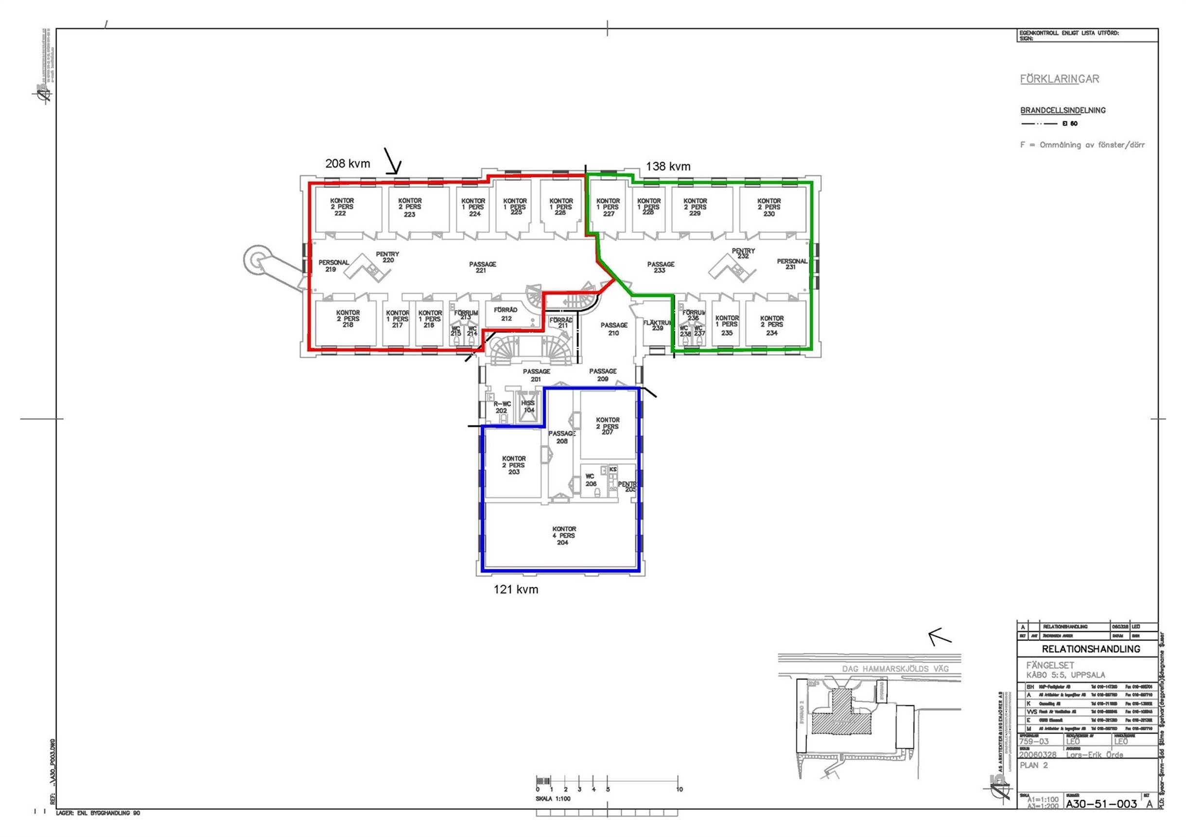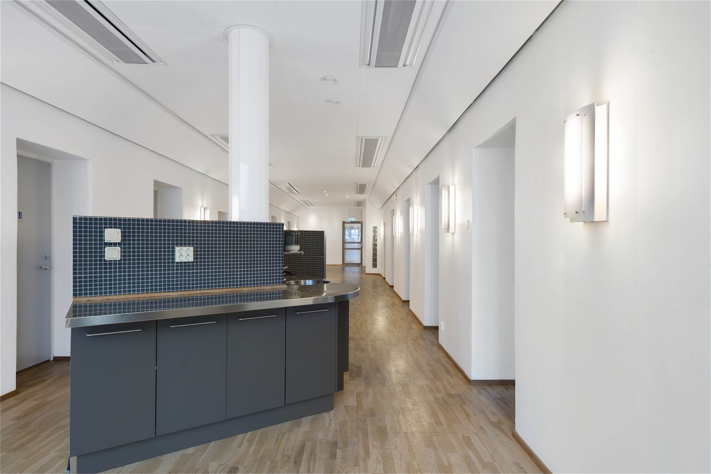 Lokalen om 208 kvm är belägen på plan 2 och rymmer åtta kontorsrum, varav tre är större och lämpar sig utmärkt som konferensrum eller mötesrum. Samtliga rum är placerade längs en bred och ljus passage som fungerar som en naturlig samlingspunkt med personalutrymme, pentry och plats för gemenskap. Här finns även två WC samt ett förrådsutrymme. Hiss finns i huset för enkel tillgänglighet.