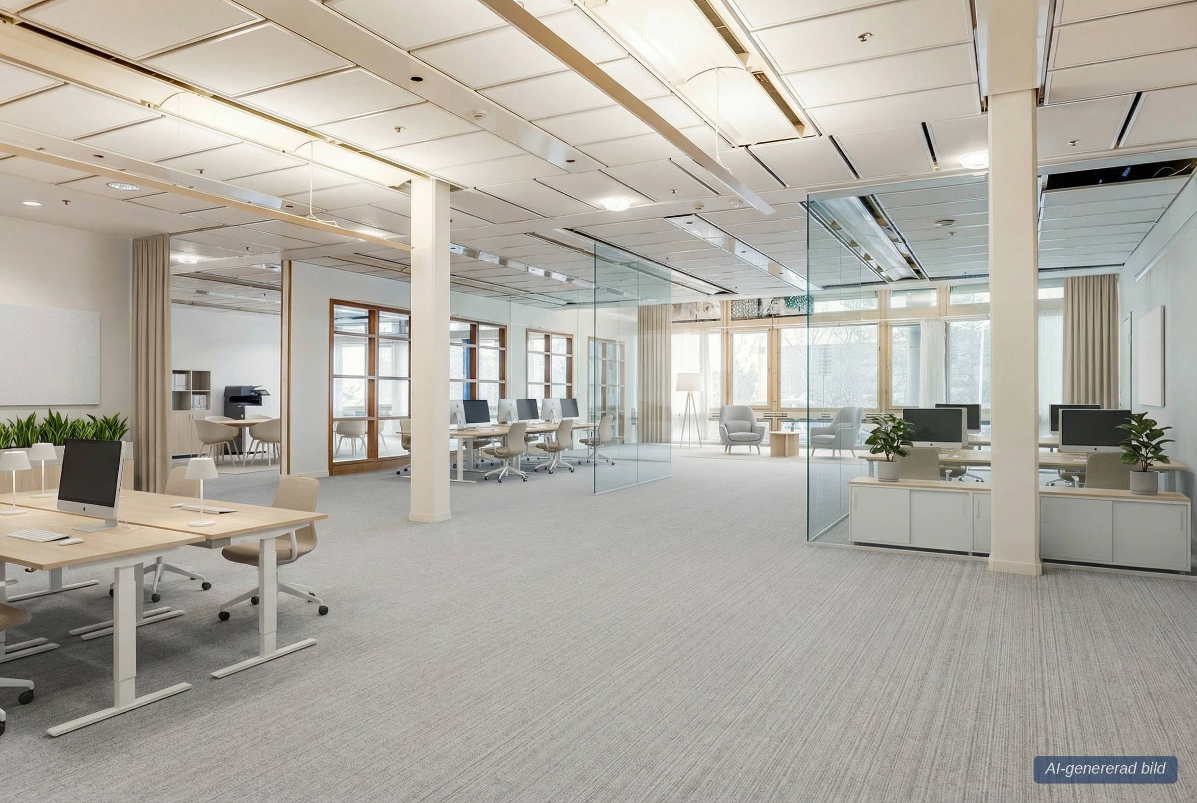 • Ytor och planlösning: Lokalerna har en varierad planlösning som kombinerar separata kontorsrum i olika storlekar med öppna kontorslandskap, vilket ger möjlighet till både flexibla arbetsplatser och privata utrymmen.