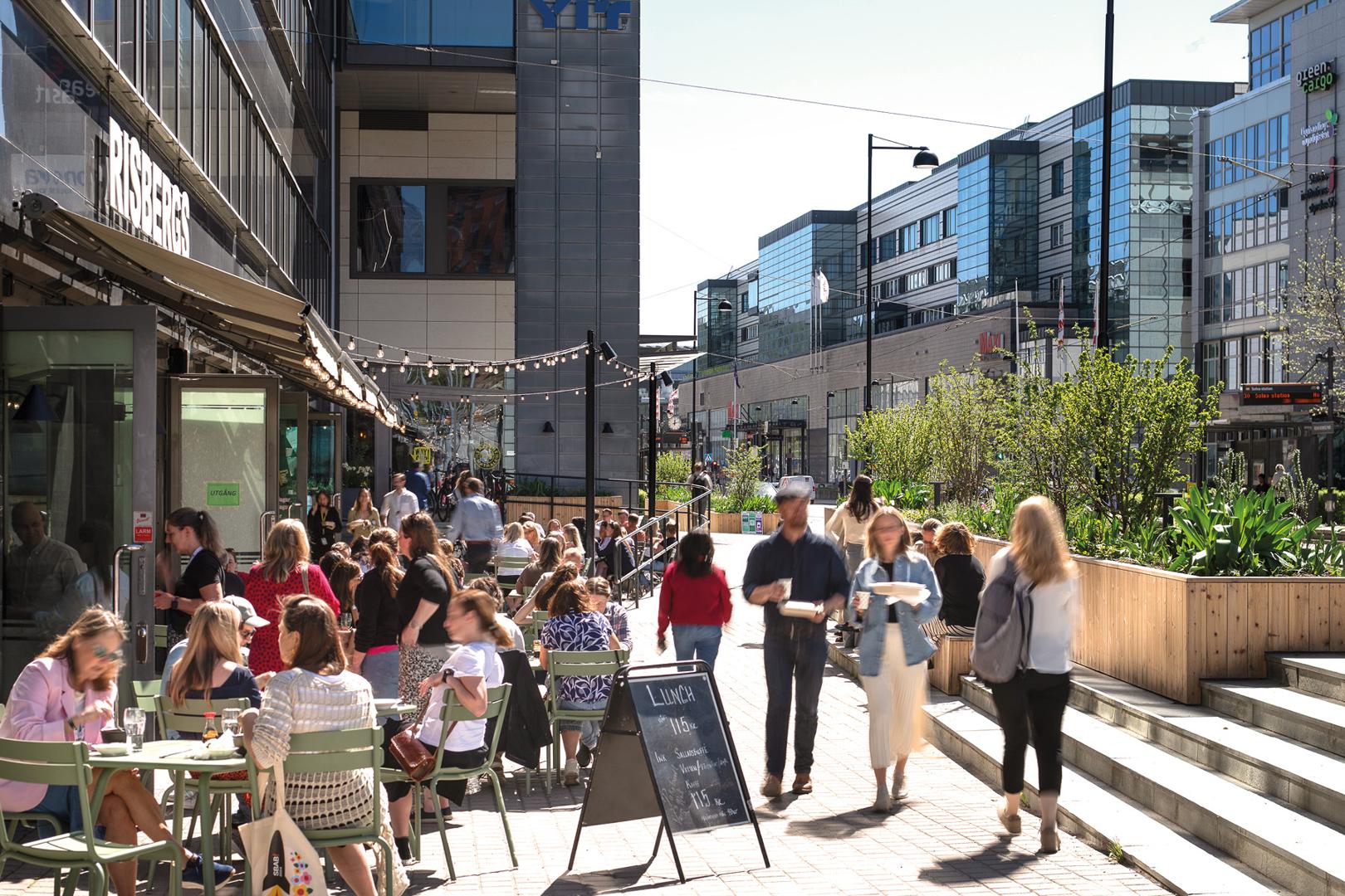 Här erbjuds ett brett serviceutbud med restauranger, caféer, gym, padel och pickleball, ICA Maxi med apotek, samt frisör och kemtvätt.