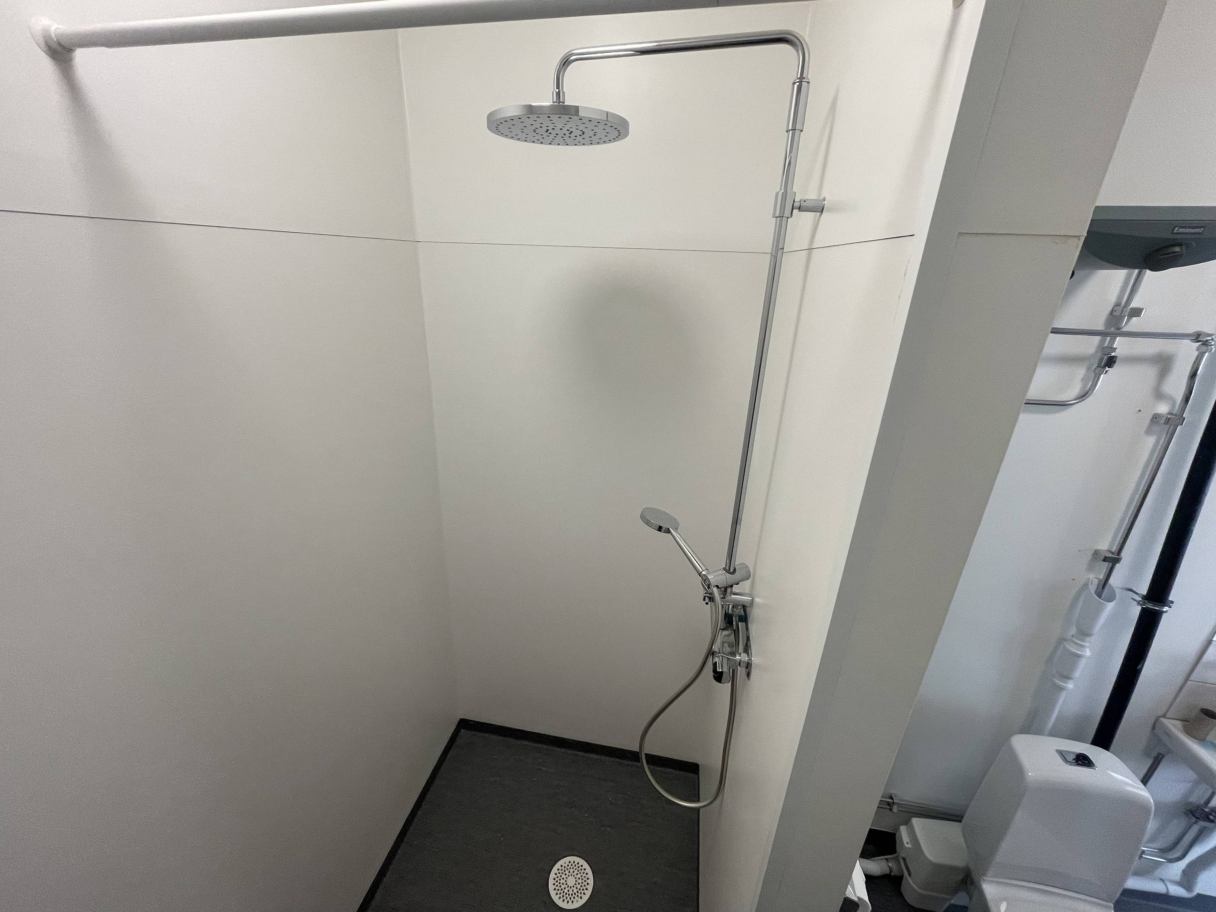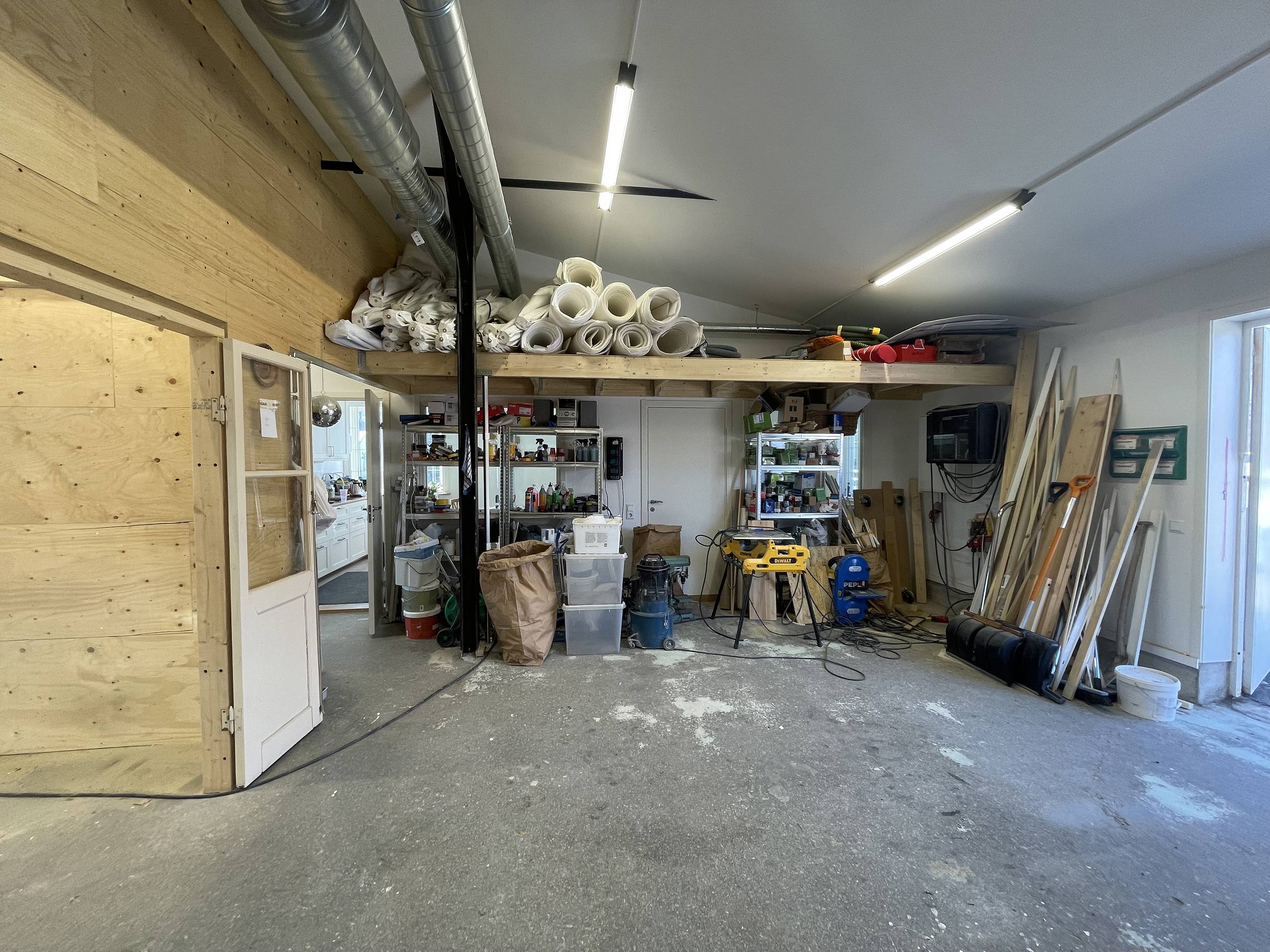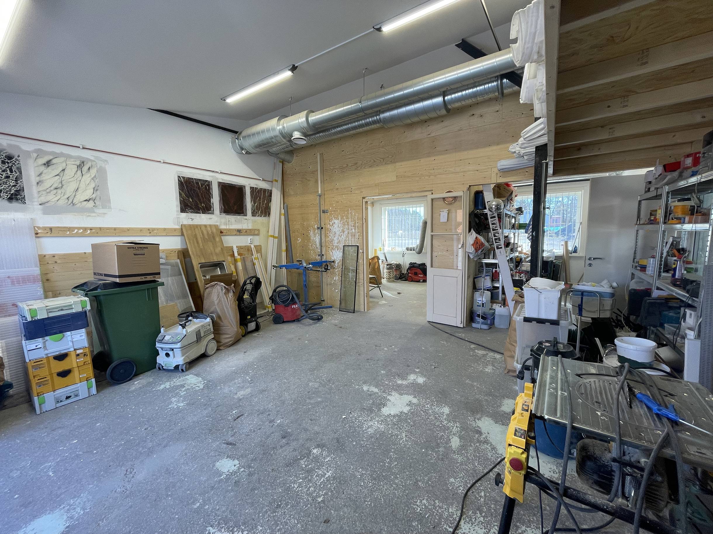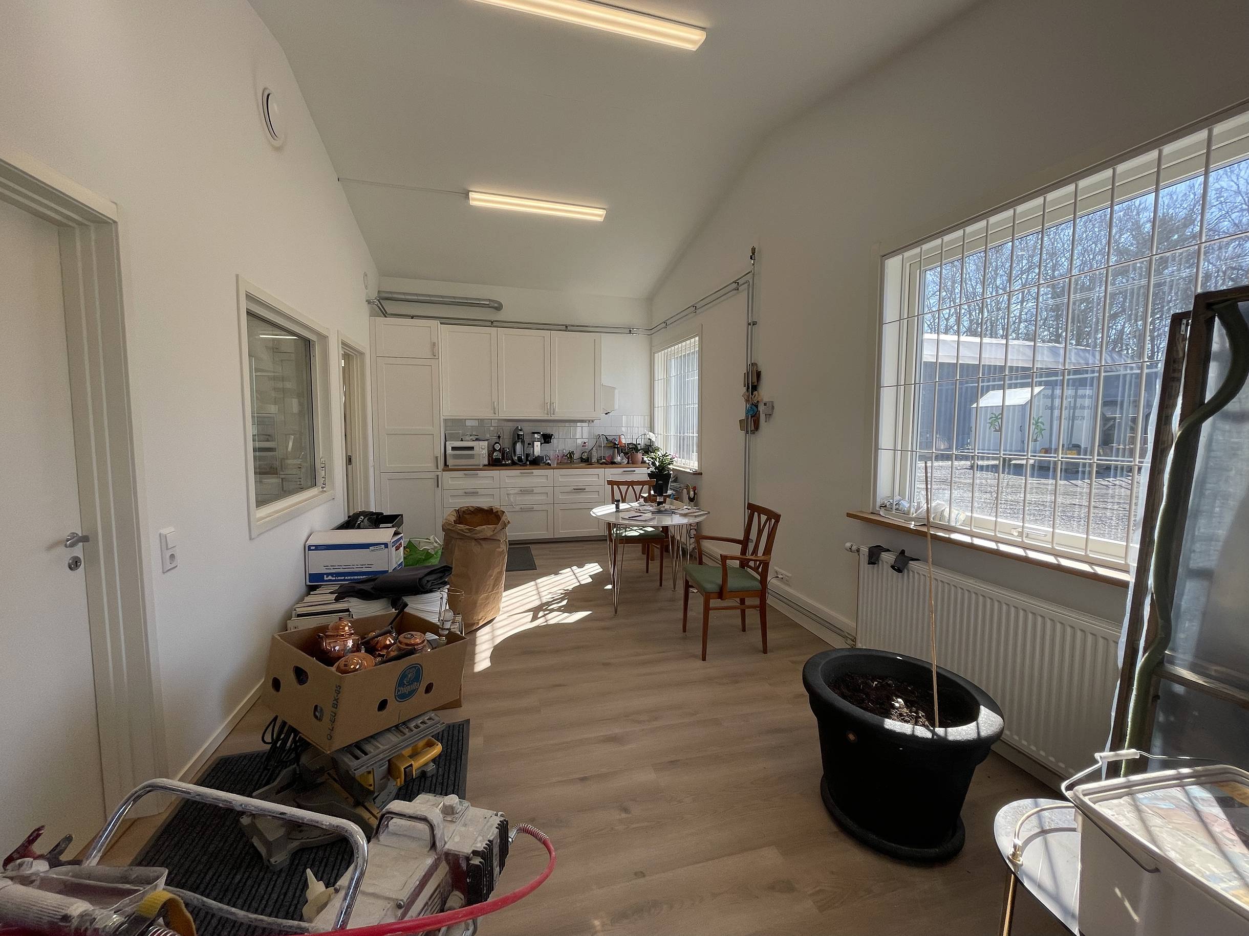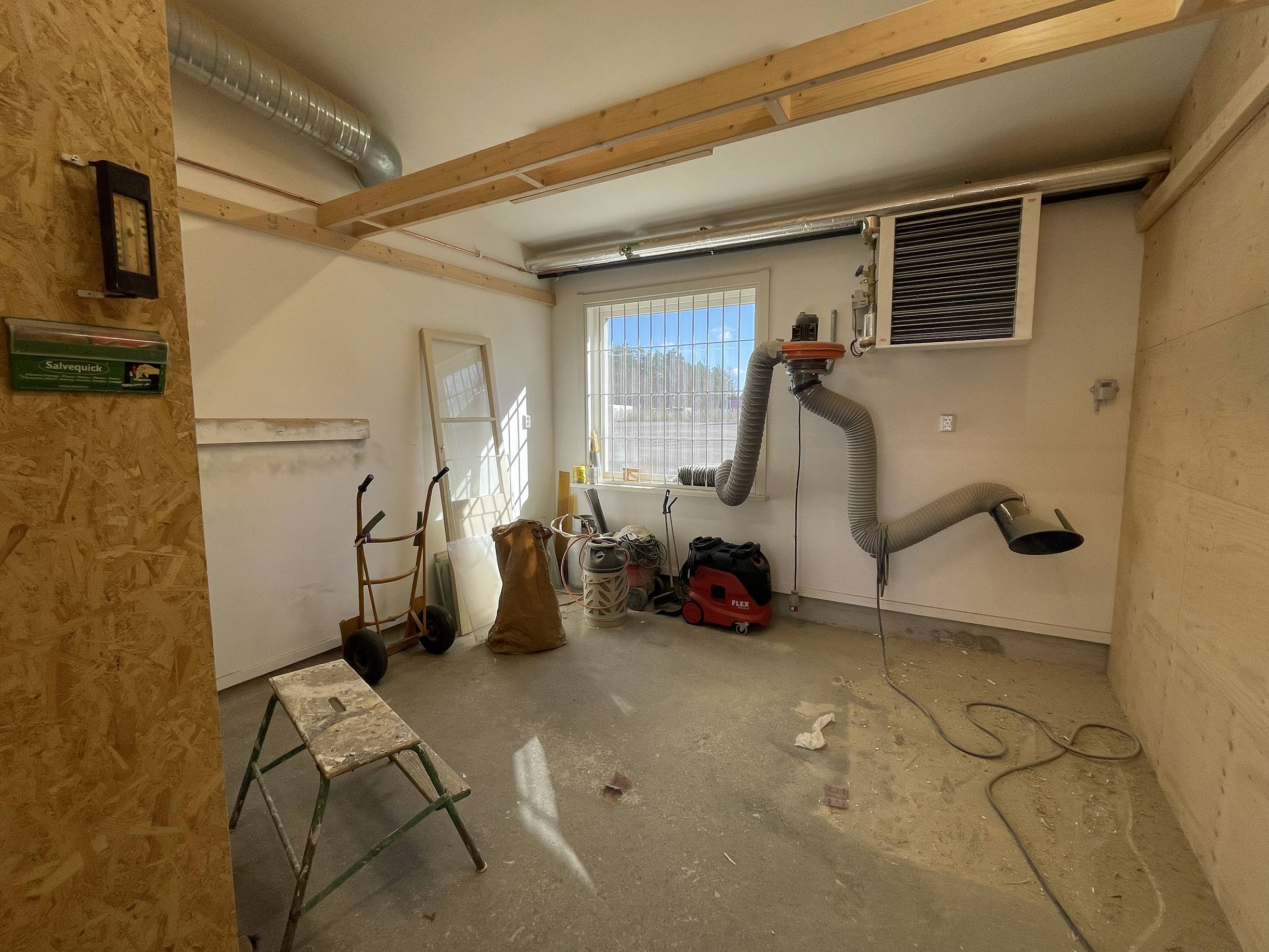 Takhöjden varierar mellan 2,7 och 3,6 meter. Lokalen kompletteras med kök, dusch och toalett samt tillhörande parkeringsplatser.