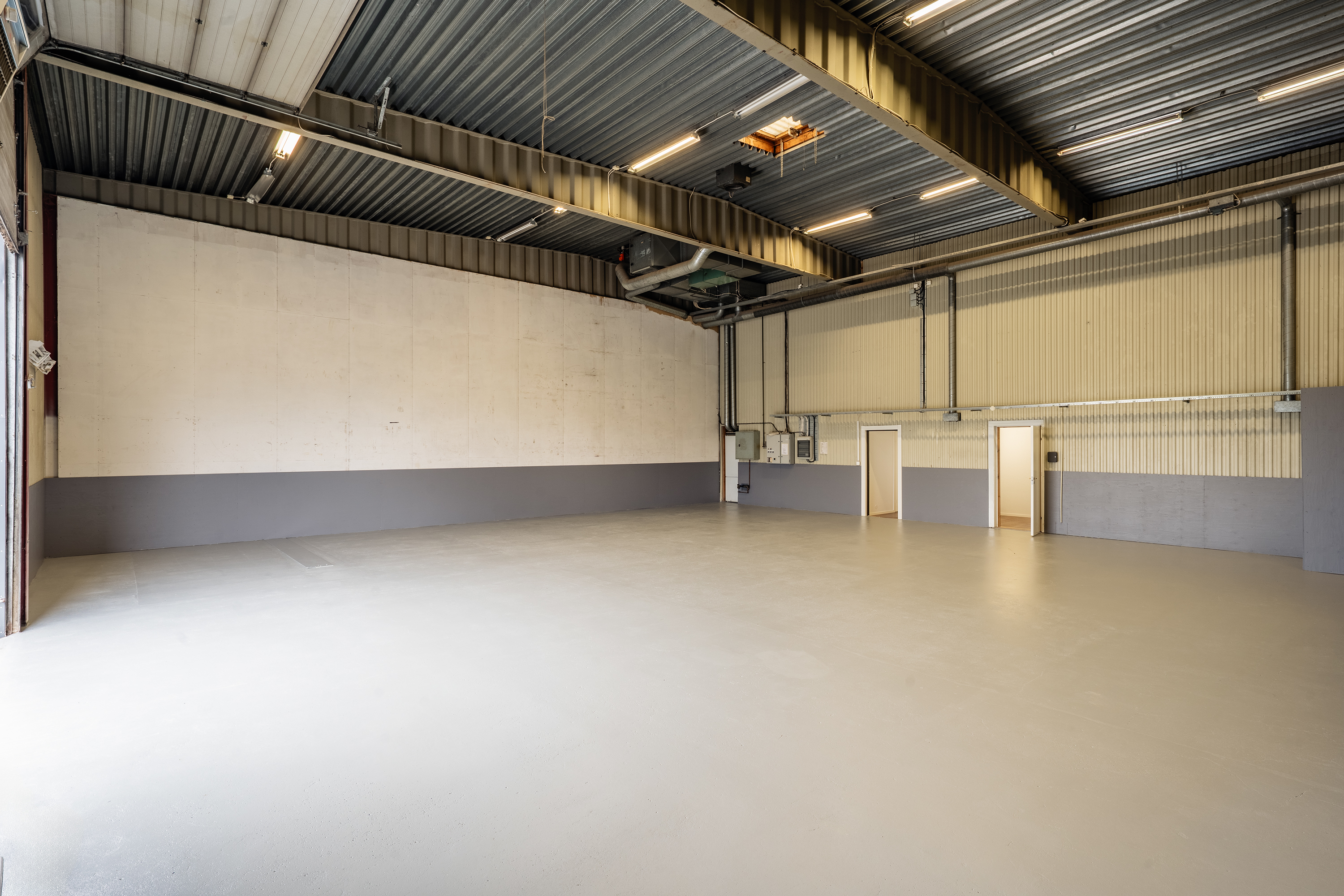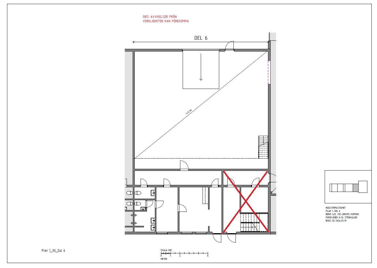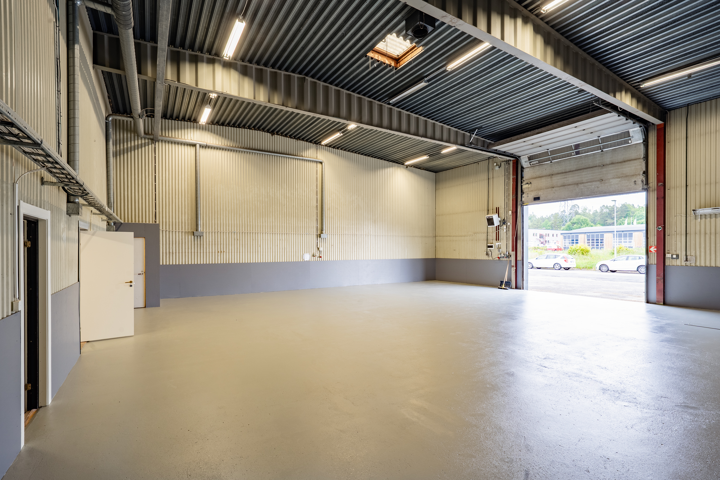 Lagerdelen utgör ca 181 kvm av totalytan och har en högsta takhöjd om ca 6 meter. Lagret nås via den rejäla porten alternativt från personaldelen på byggnadens baksida där parkeringsytor finns tillgängliga. Personaldelen är utrustad med omklädningsrum, dusch, wc och kontor.