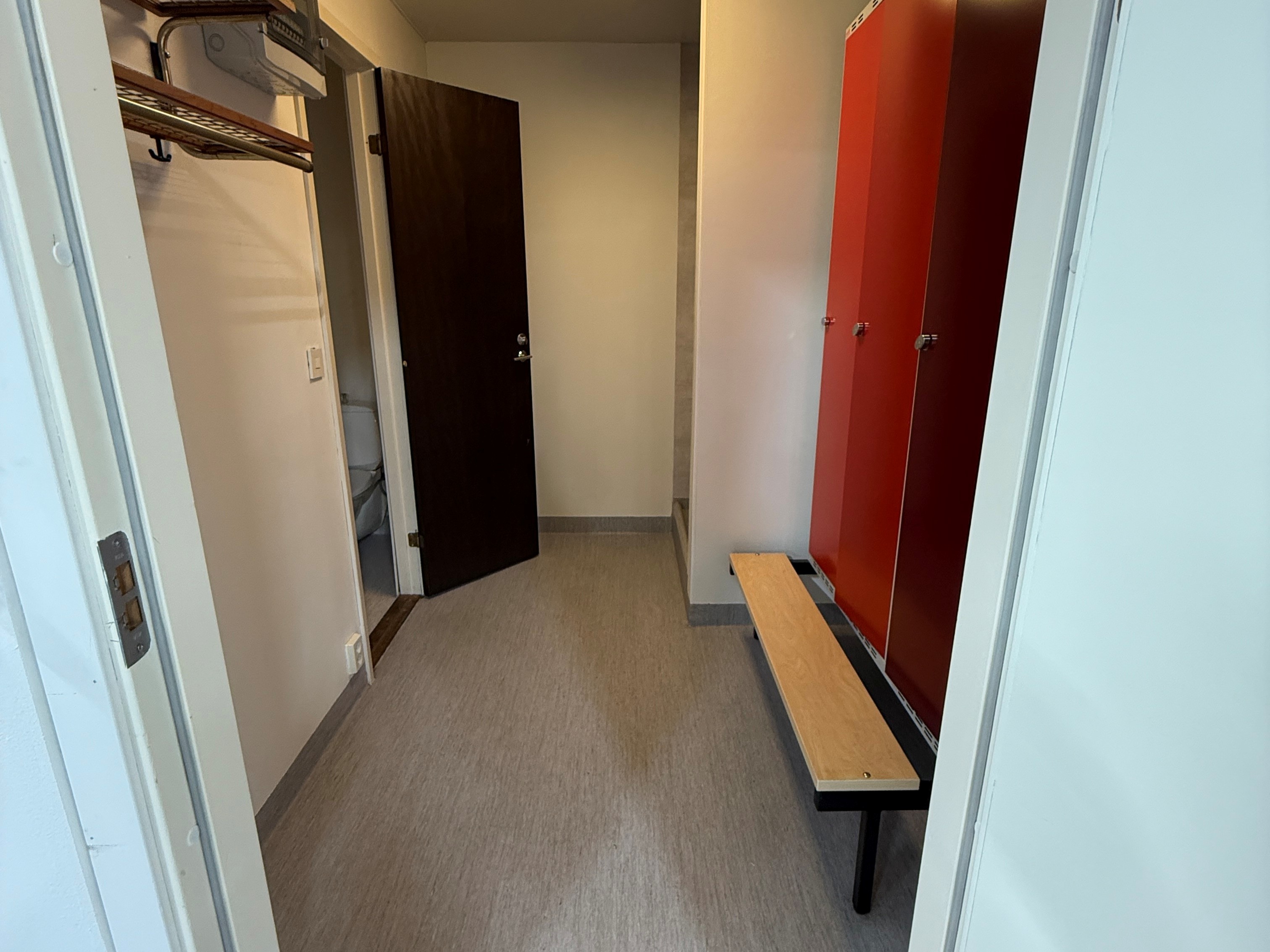 Lokalen är utrustad med omklädningsrum med dusch och toalett samt ett praktiskt kök, vilket ger en bekväm och komplett arbetsmiljö för både personal och verksamhet.