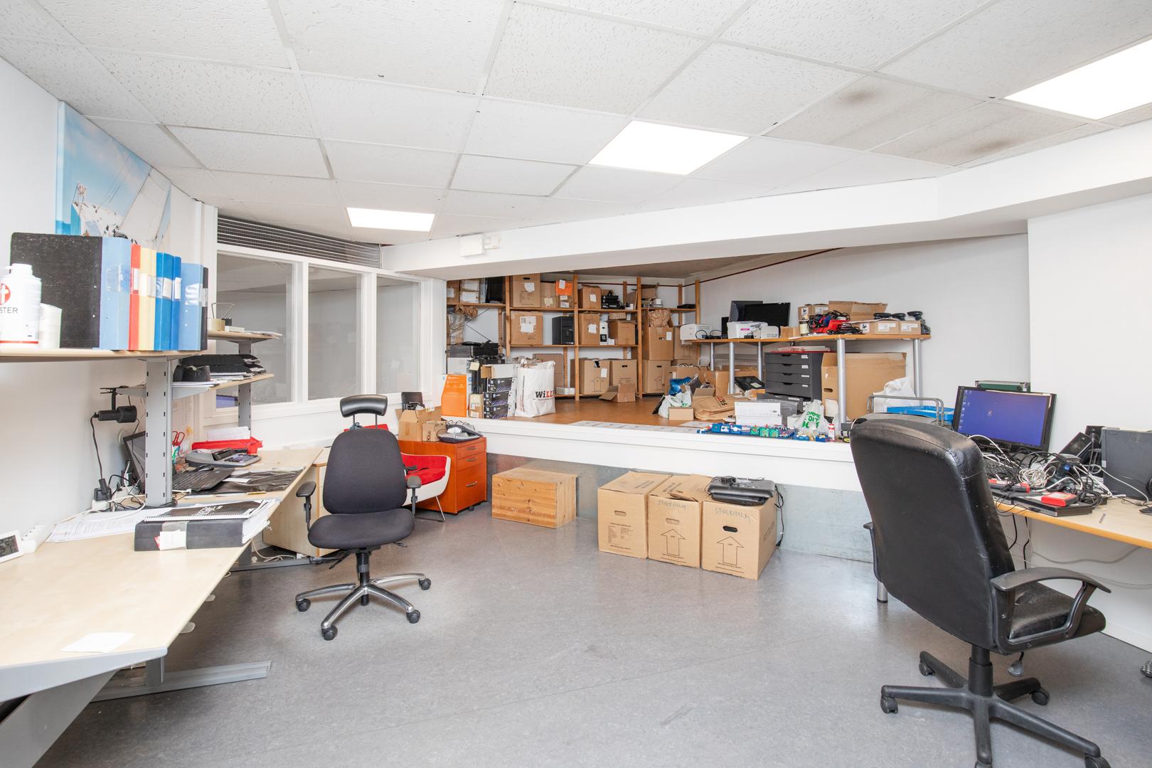 Det övre planet är utformat för kontorsverksamhet och inkluderar ett pentry samt toaletter, vilket ger de anställda alla bekvämligheter de behöver för en produktiv arbetsdag. Den flexibilitet som denna lokal erbjuder gör den idealisk för företag som söker en modern och funktionell arbetsmiljö.
