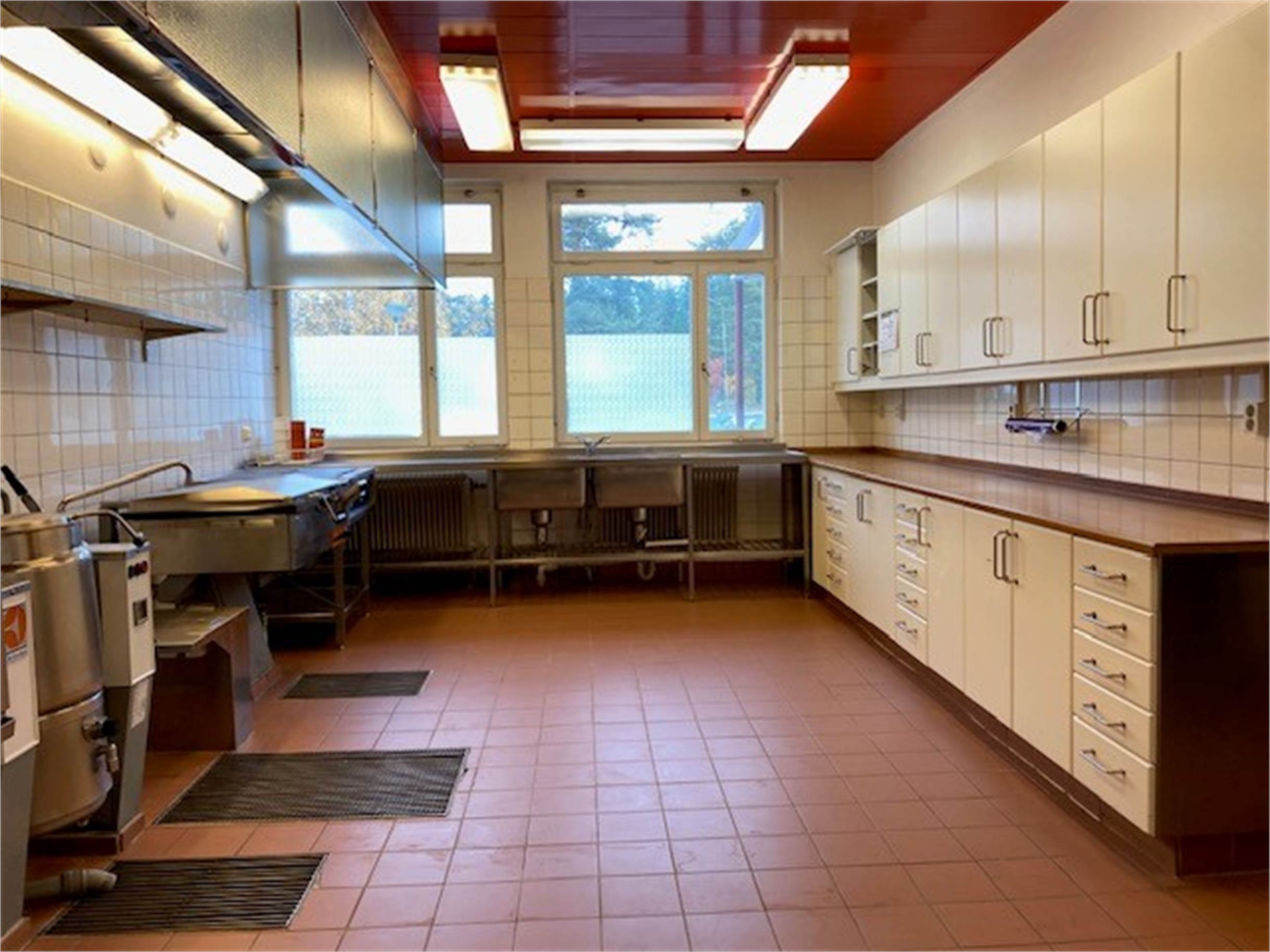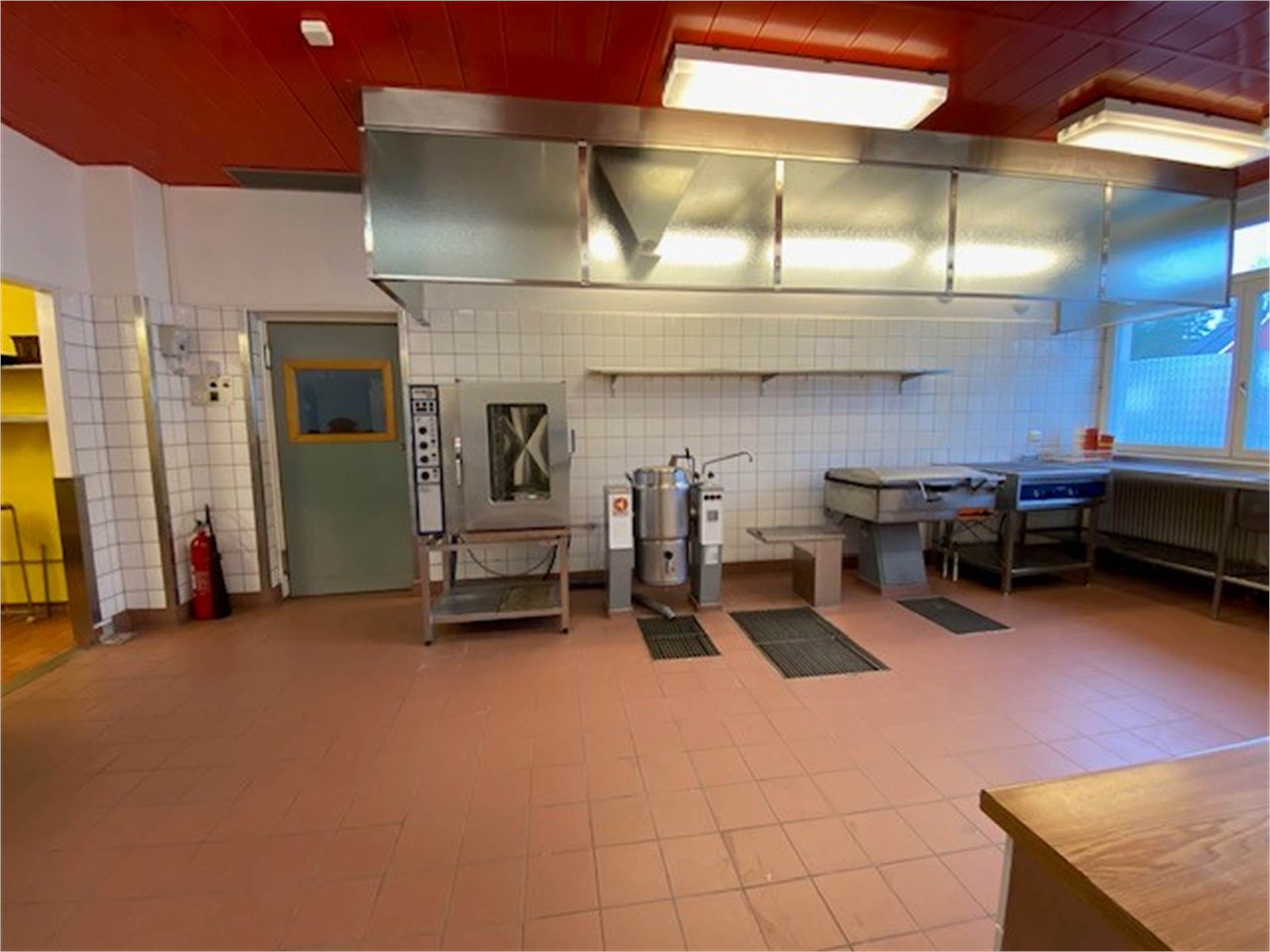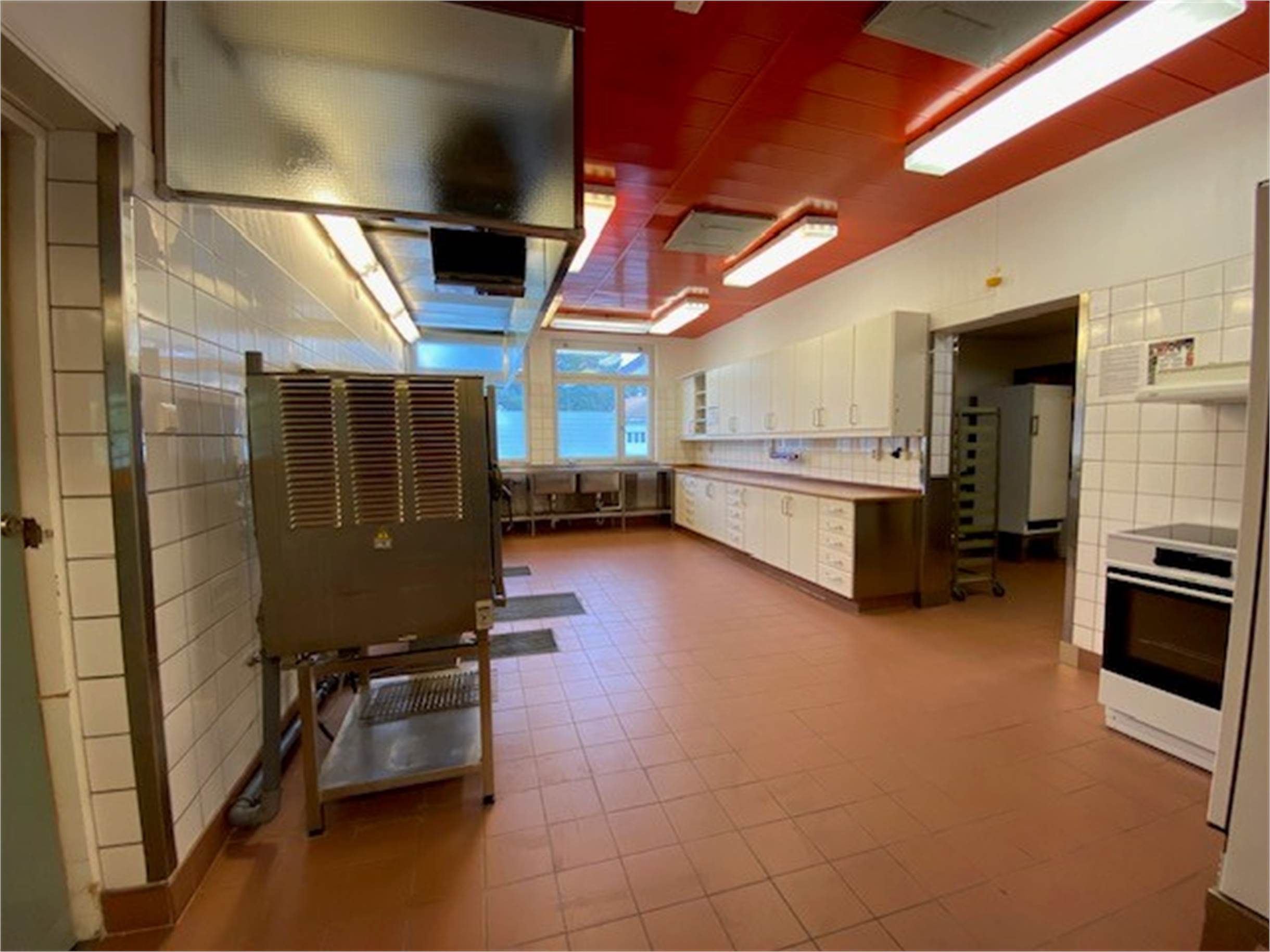 • Kök på ca 30 m2; varmluftsugn, tryckkok (?), djupt stekbord, spis med 4 hällar, 1 vanlig spis, 1 kyl, arbetsytor och