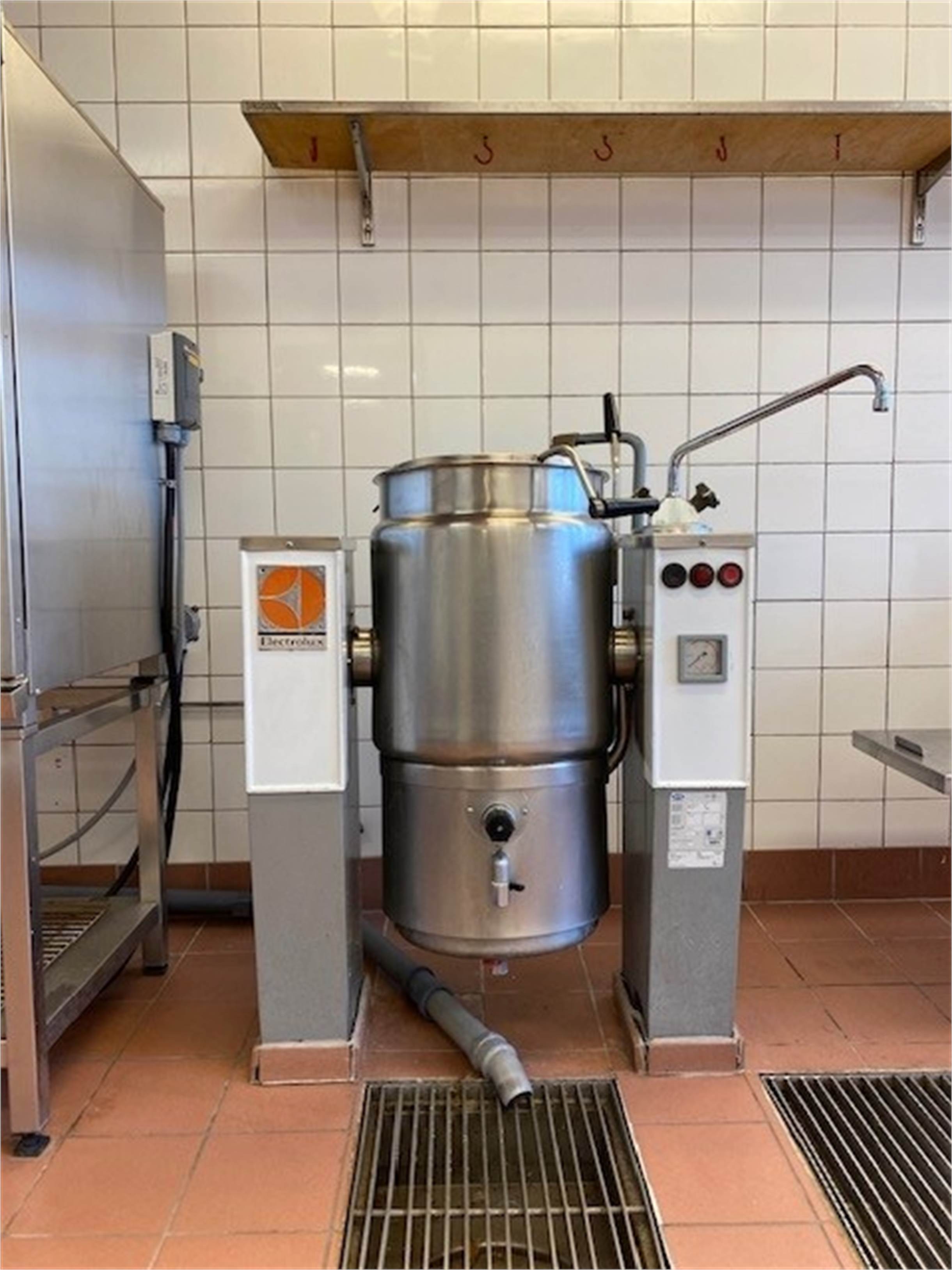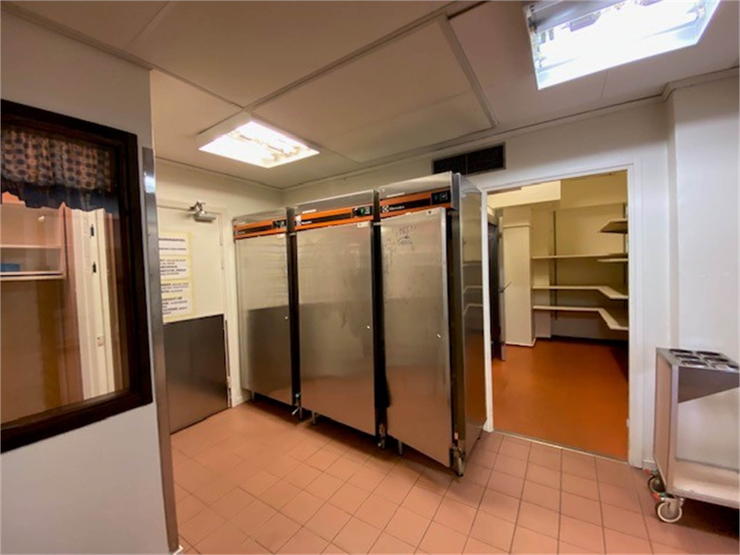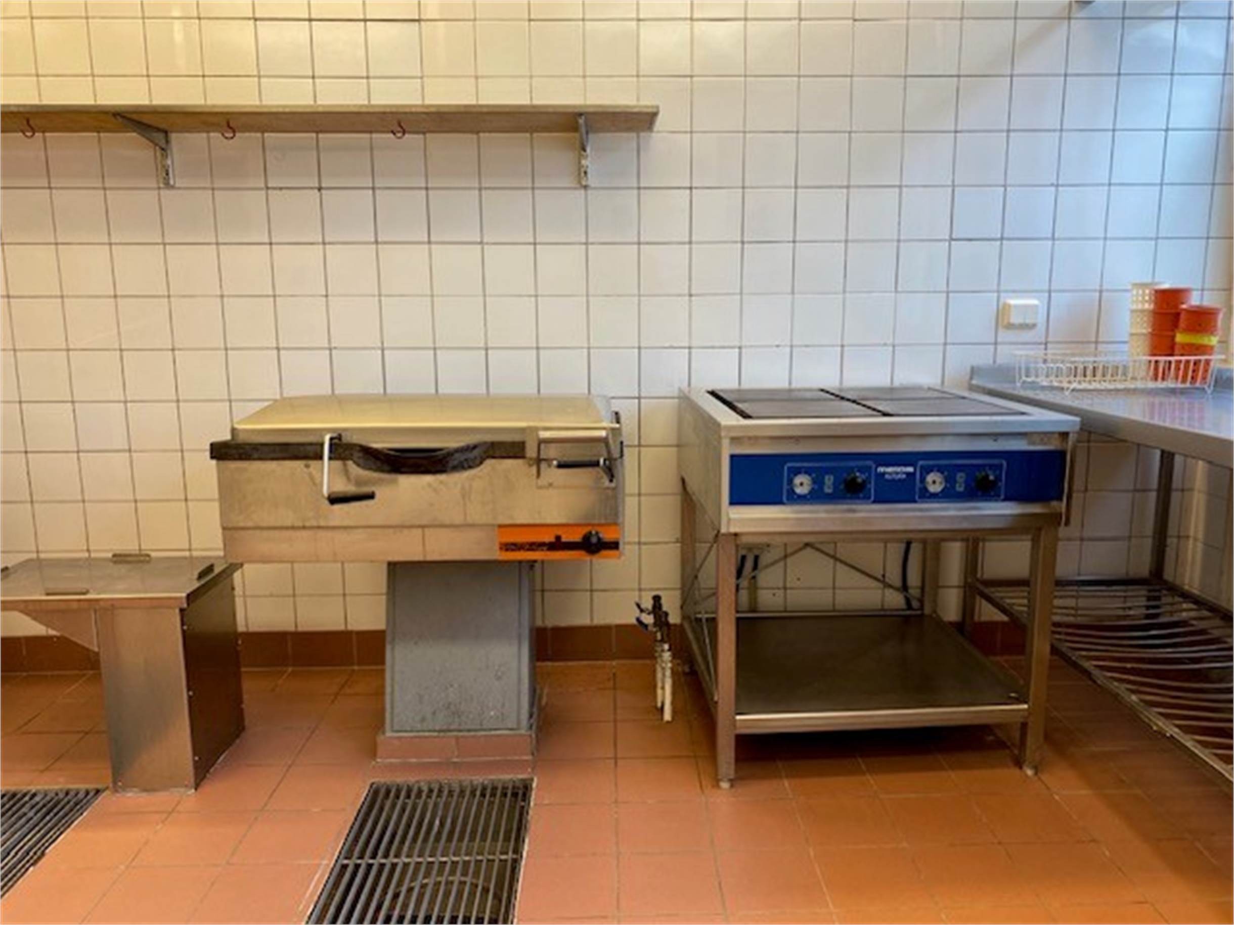 • Kök på ca 30 m2; varmluftsugn, tryckkok (?), djupt stekbord, spis med 4 hällar, 1 vanlig spis, 1 kyl, arbetsytor och