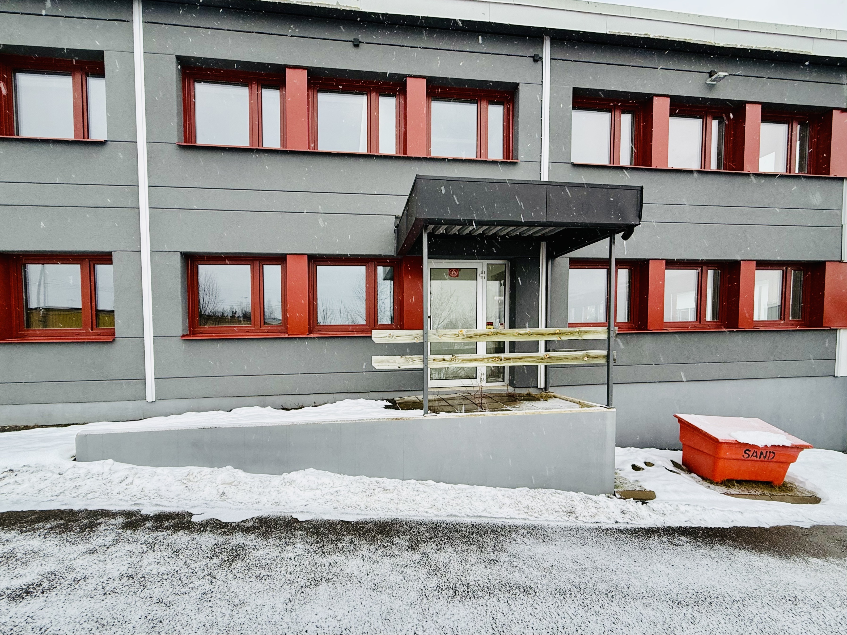 Fastigheten är inhägnad med staket samt två grindar på vardera sida av byggnaden. Detta möjliggör att även större lastbilar kan köra runt bygganden.