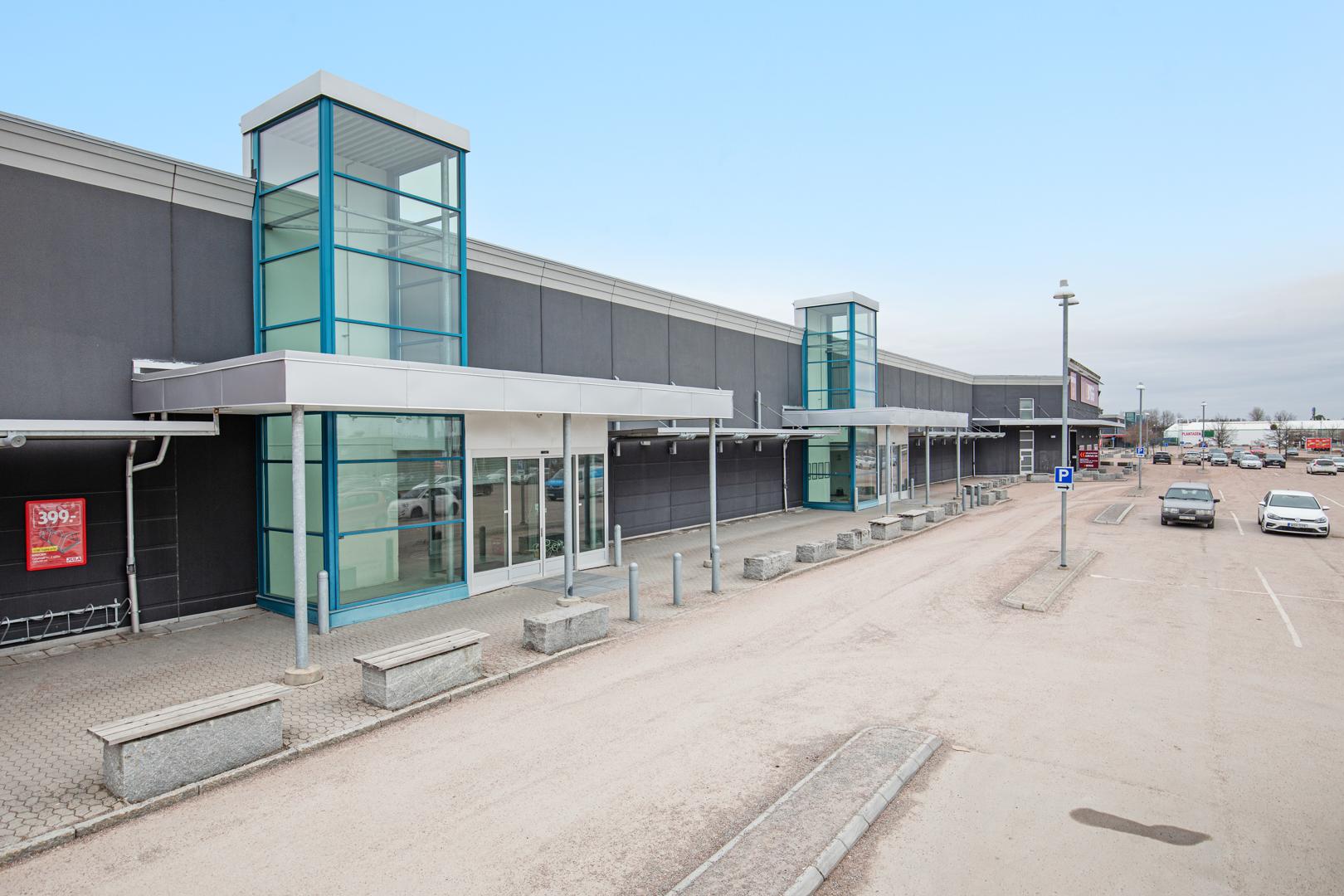 Området erbjuder generösa parkeringsmöjligheter i direkt anslutning till butikerna.