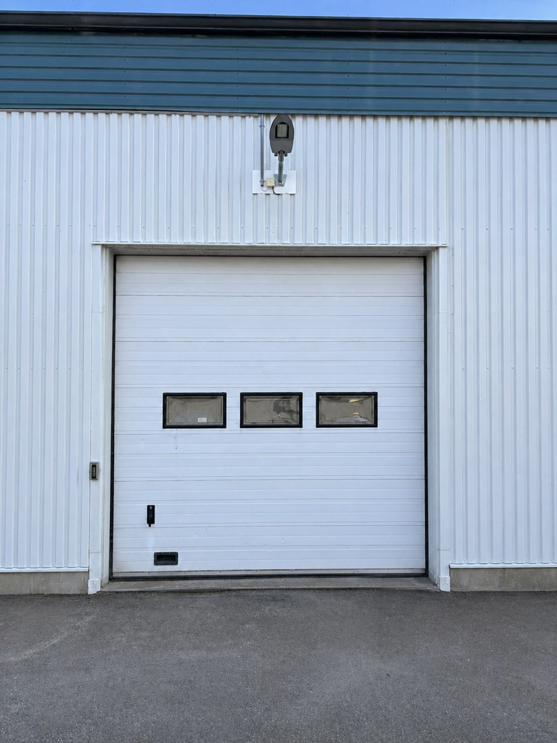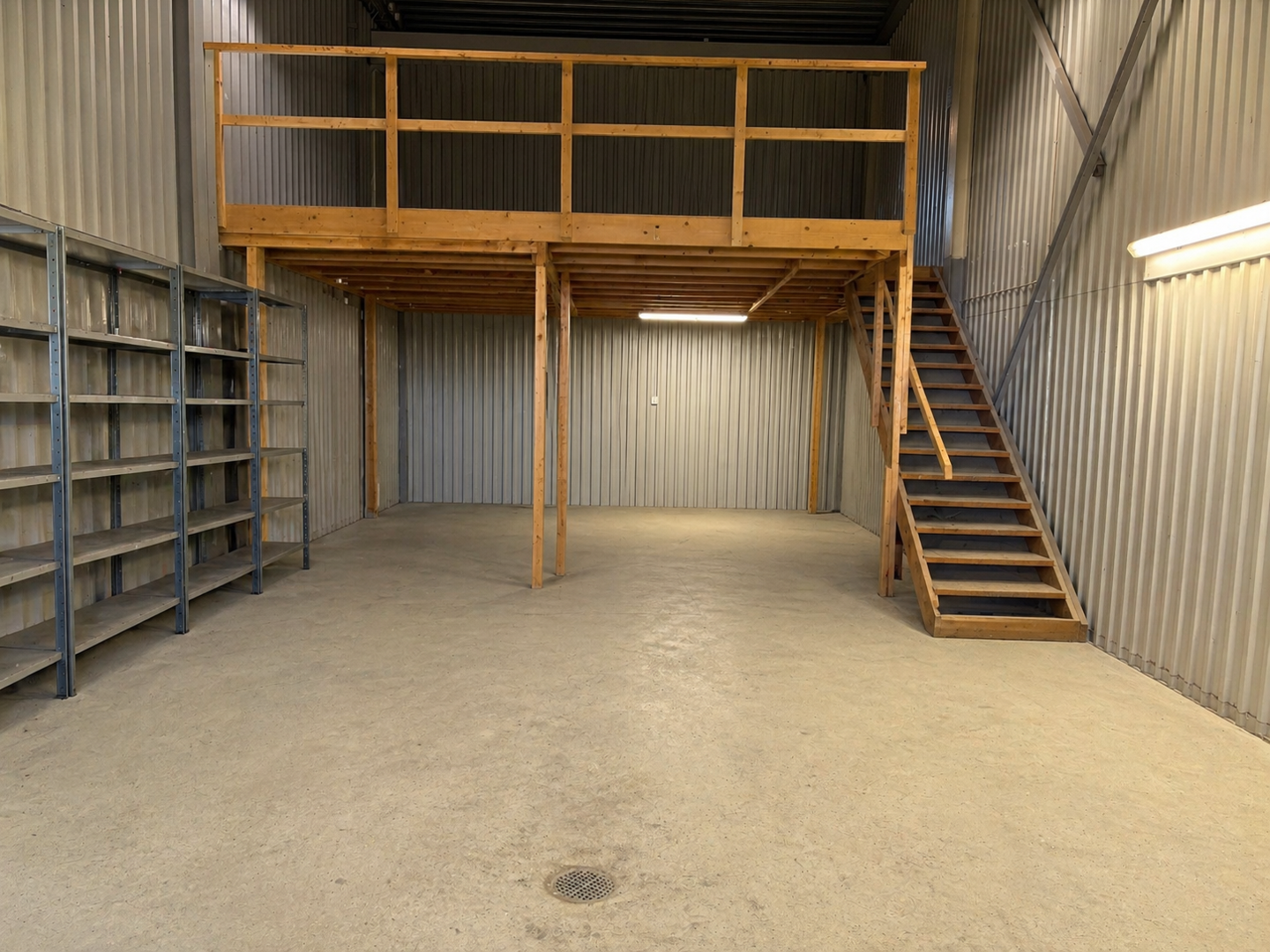 Garage/lager med högt i tak och ett entresol med personalutrymmen.