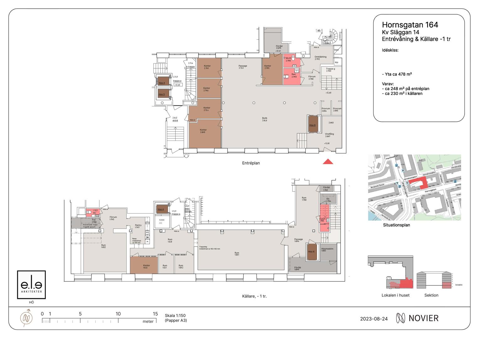 Lokalen har 248 kvm i gatuplan och 230 kvm i källarplan.