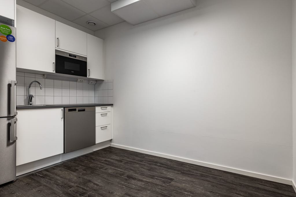 Lokalen har fina ytskikt, amticogolv (merchant wood), undertak med grundbelysning, handikapptoalett samt pentry med micro, diskmaskin och kyl. Här finns tre separata rum samt förrådsutrymme inom lokalen.