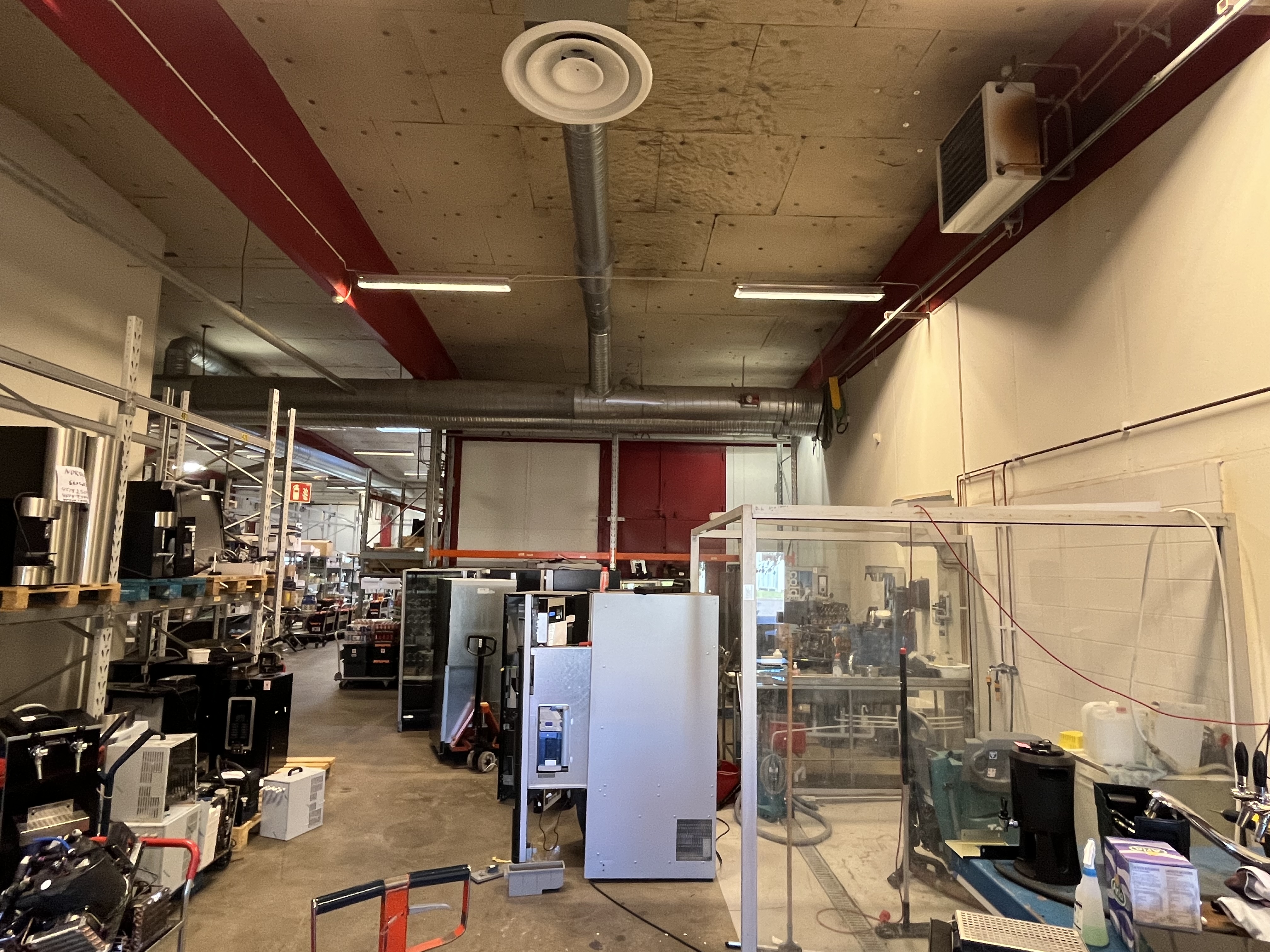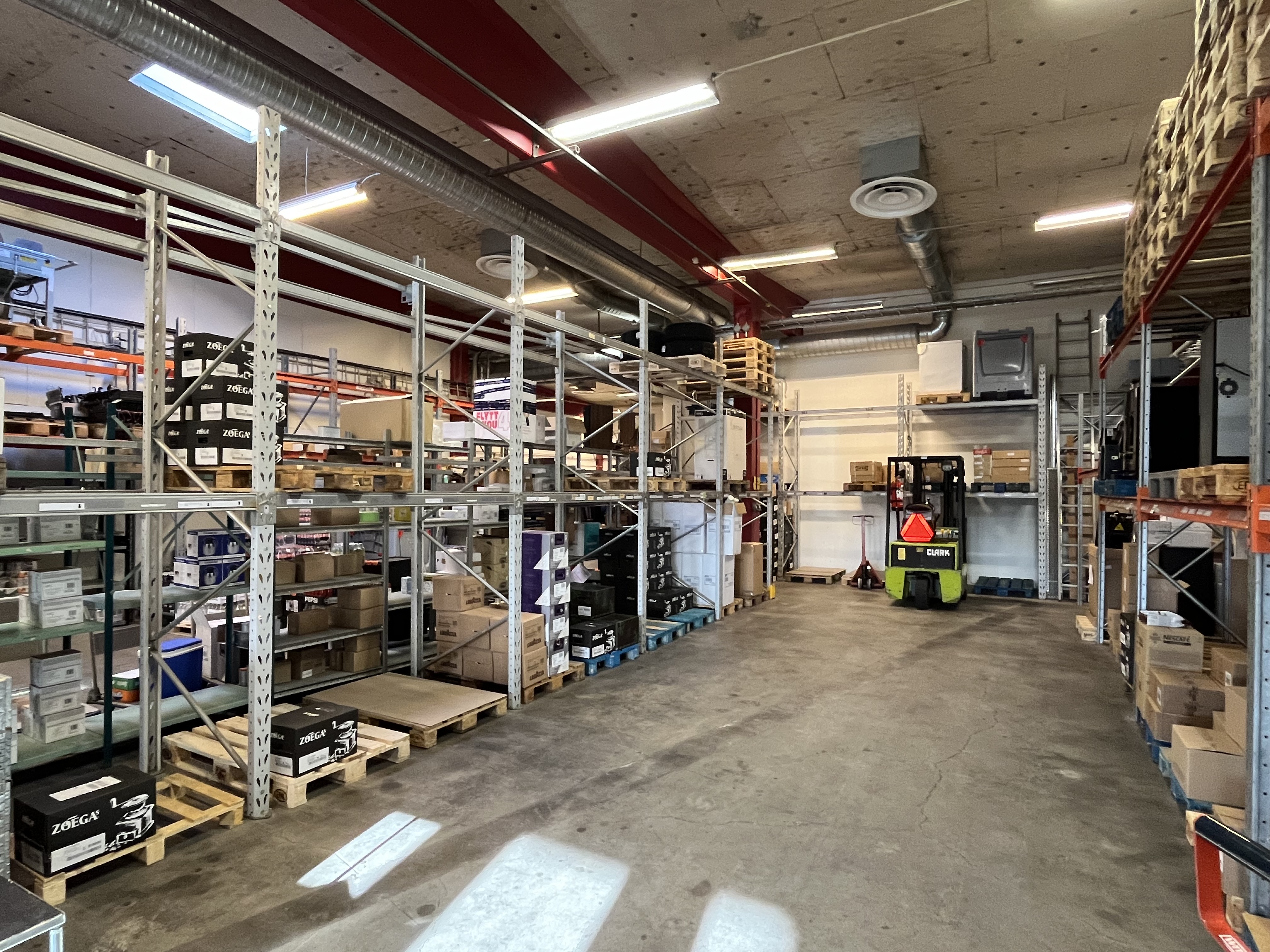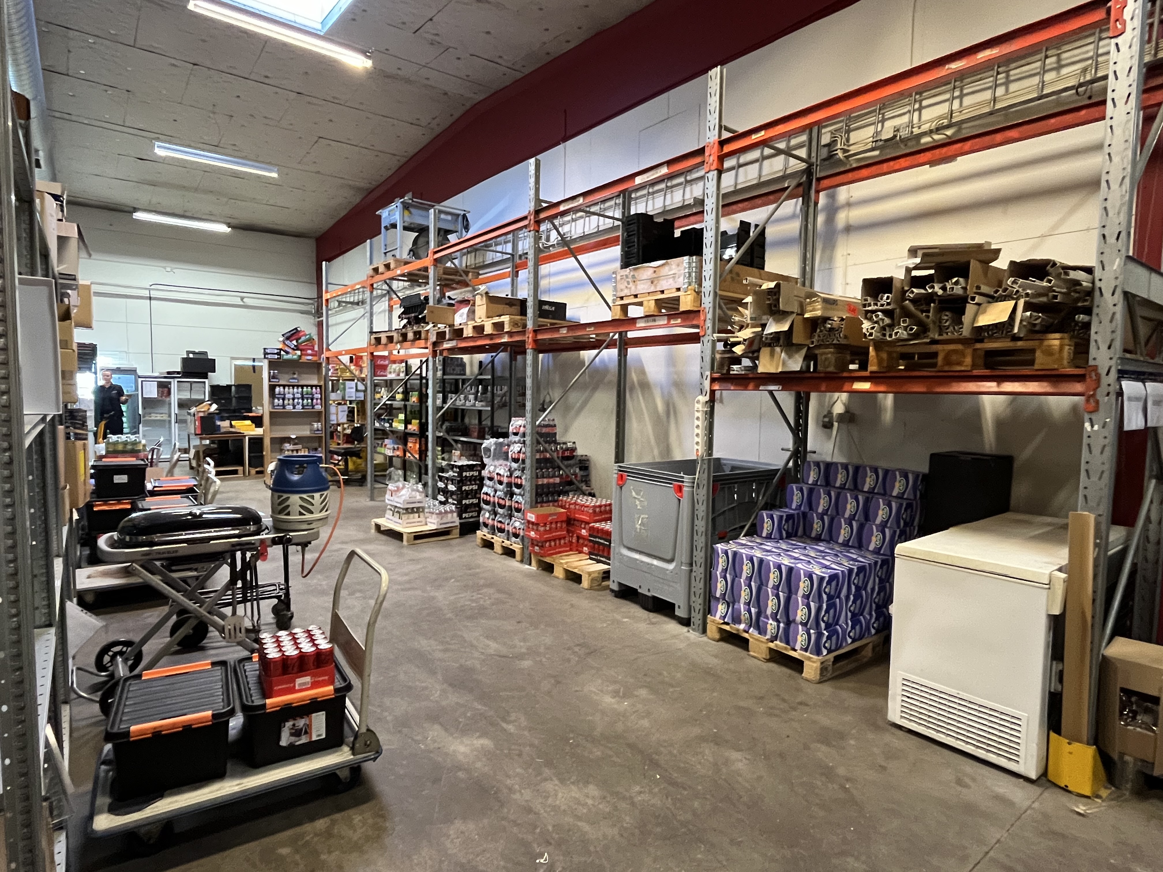 Lager: Markport med höjd 4M och bredd 3,5M. Fri takhöjd om 5,2M och 4,4M till balk. Lagret består av en större öppen yta som idag avänds till hyllstallage och en mindre del som har avlopp och vatten för avspolning av maskiner.