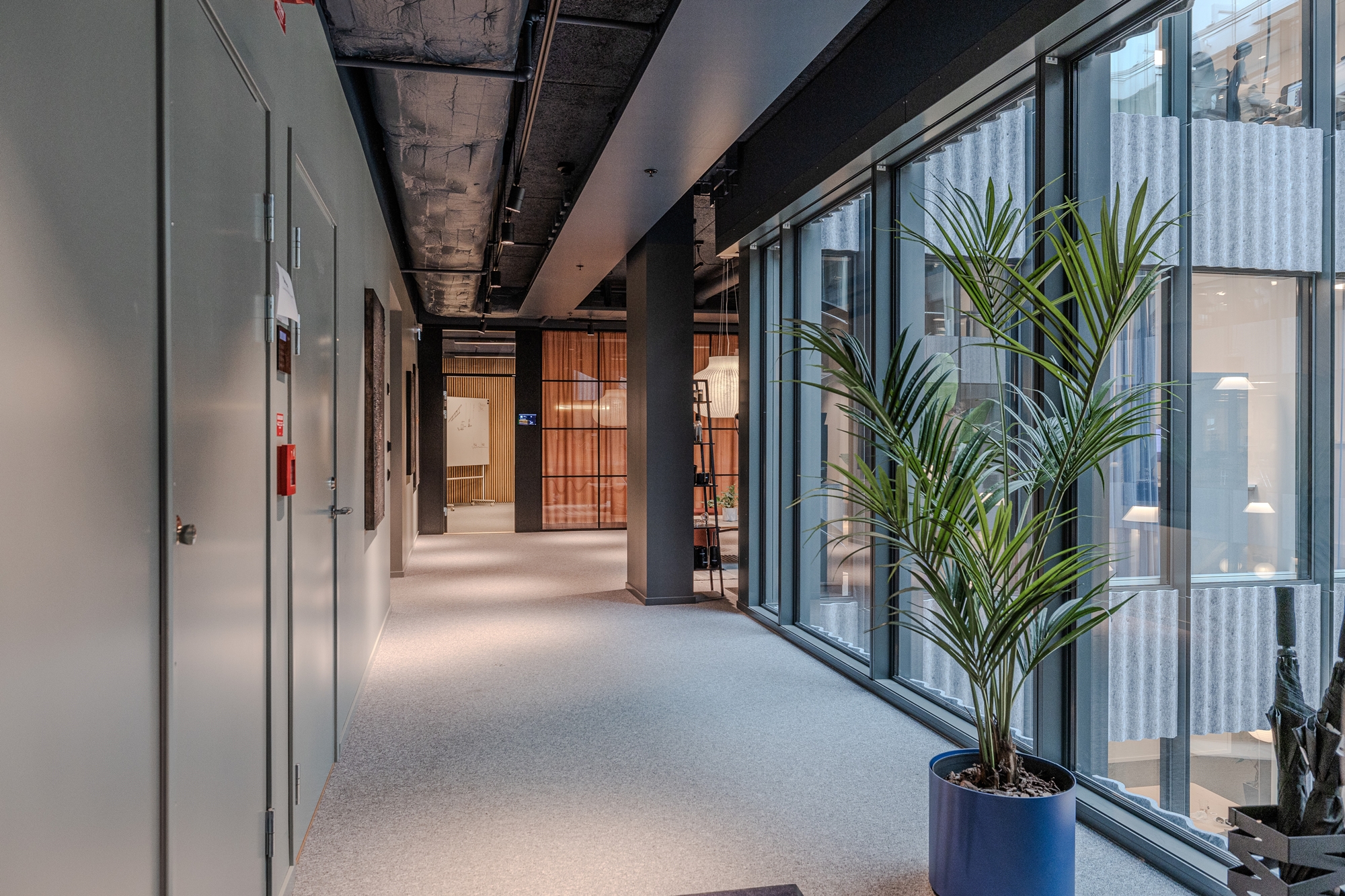 När du kliver in i fastigheten möts du direkt av en representabel entré med högt i tak. Lokalen har en bra mix av öppen planlösning/till viss del rumsindelat vilket skapar en ljus och luftig atmosfär. Lokalen har 7 mindre kontorsrum, flertalet konferens/mötesrum och mindre telefon/samtalsrum i effektiva storlekar.