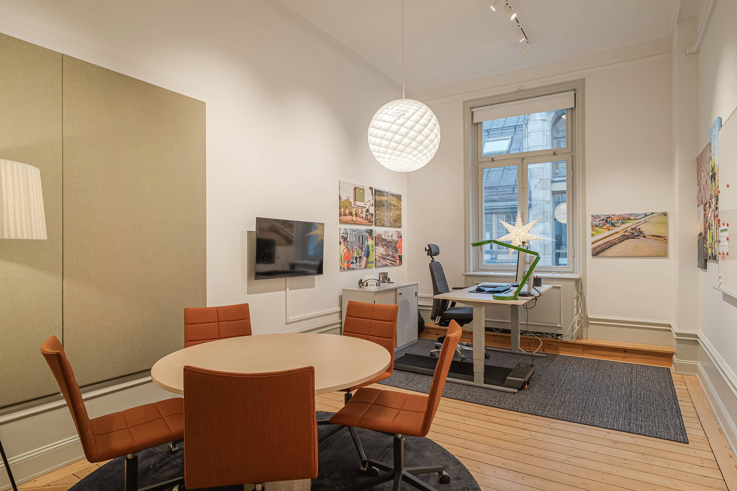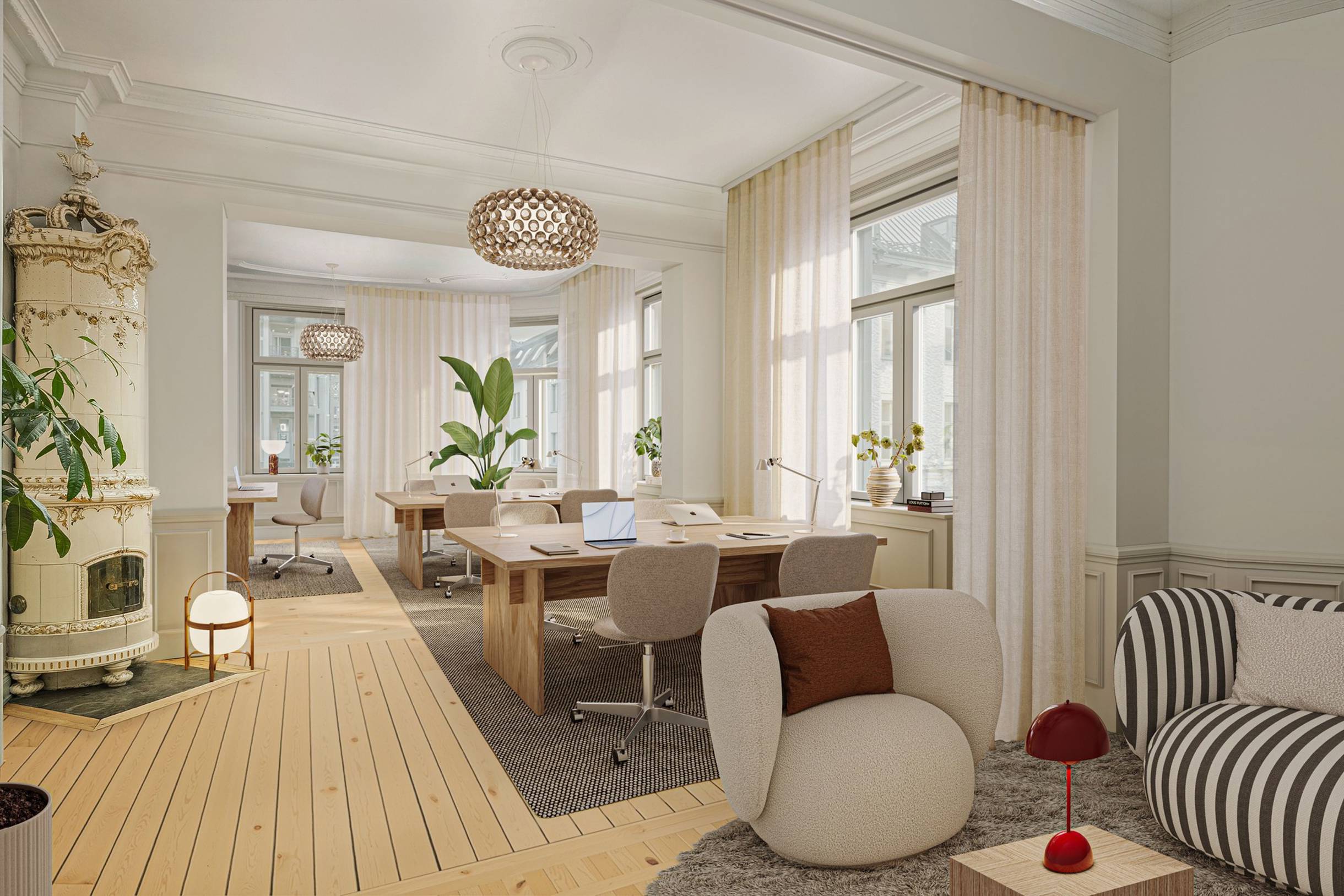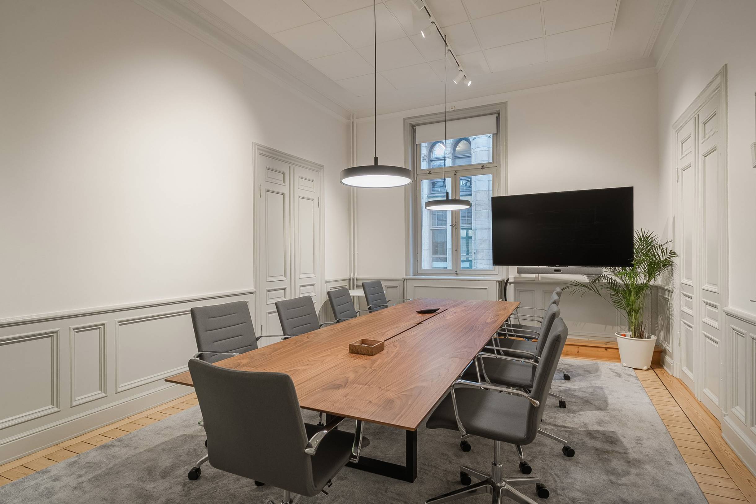 Lokalen präglas av högt i tak och vackra originaldetaljer som ger karaktär och en tidlös charm. Den genomtänkta planlösningen rymmer flera större arbetsrum samt ett antal konferensrum, vilket gör lokalen väl lämpad för företag som vill kombinera effektiva arbetsytor med plats för möten och kundbesök.