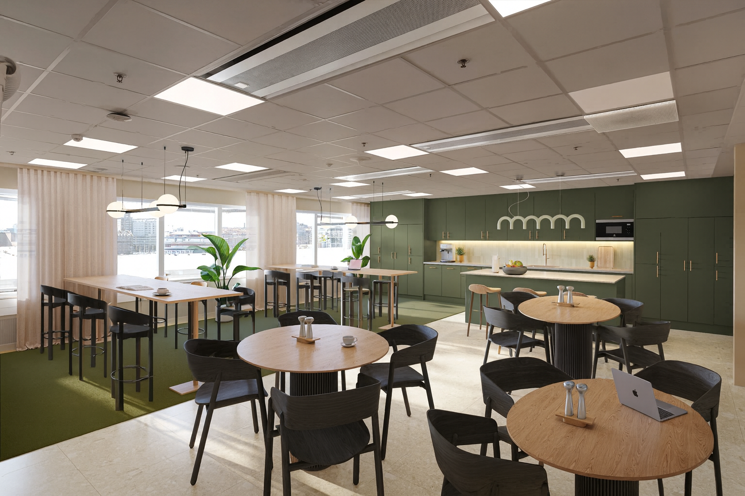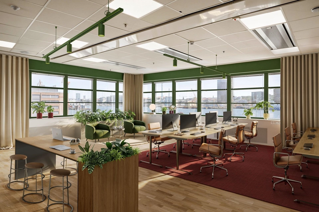 Luftig och välplanerad kontorslokal på ca 960 kvm med 70 arbetsplatser och generösa sociala ytor. Modernt kontor i bästa läge.