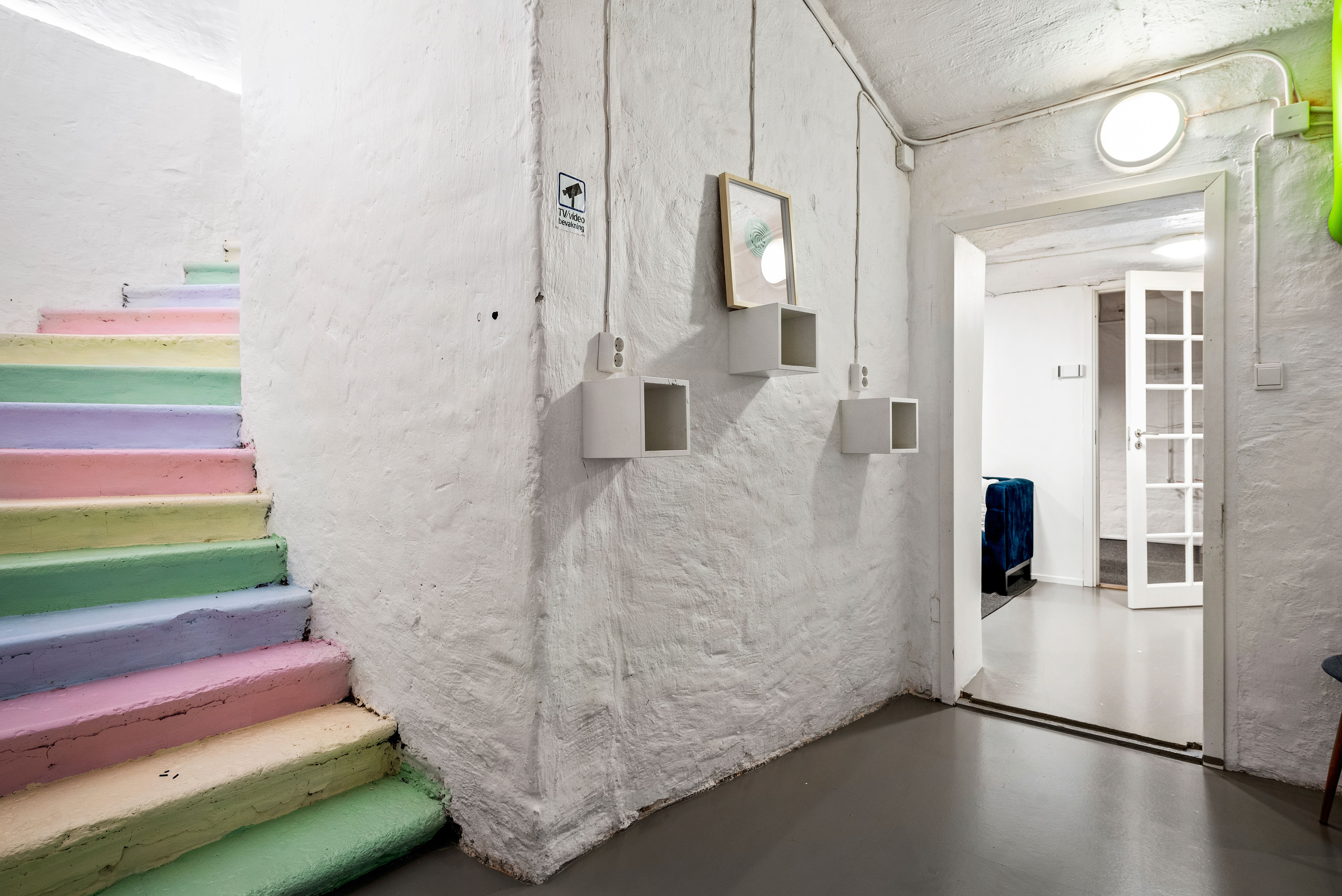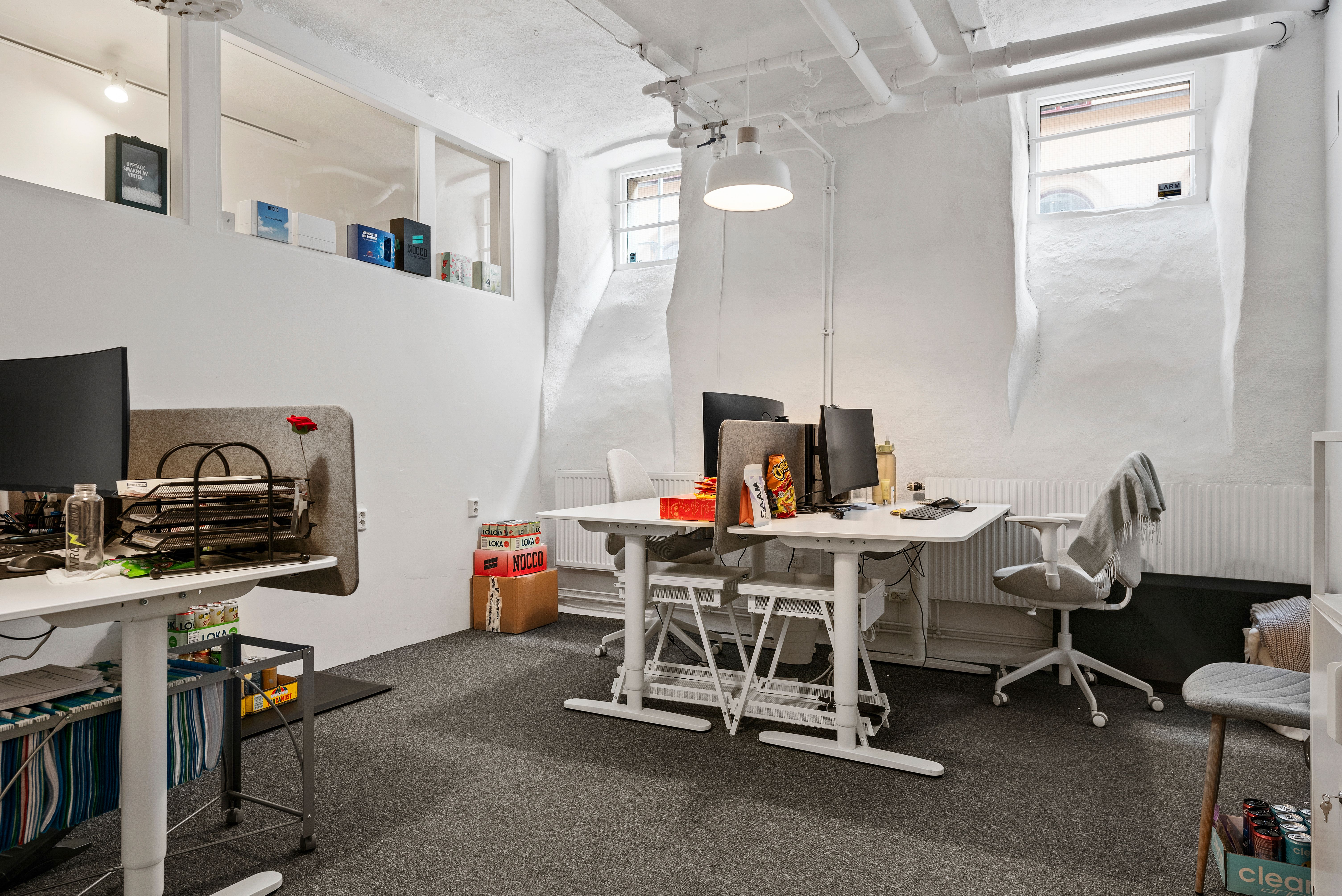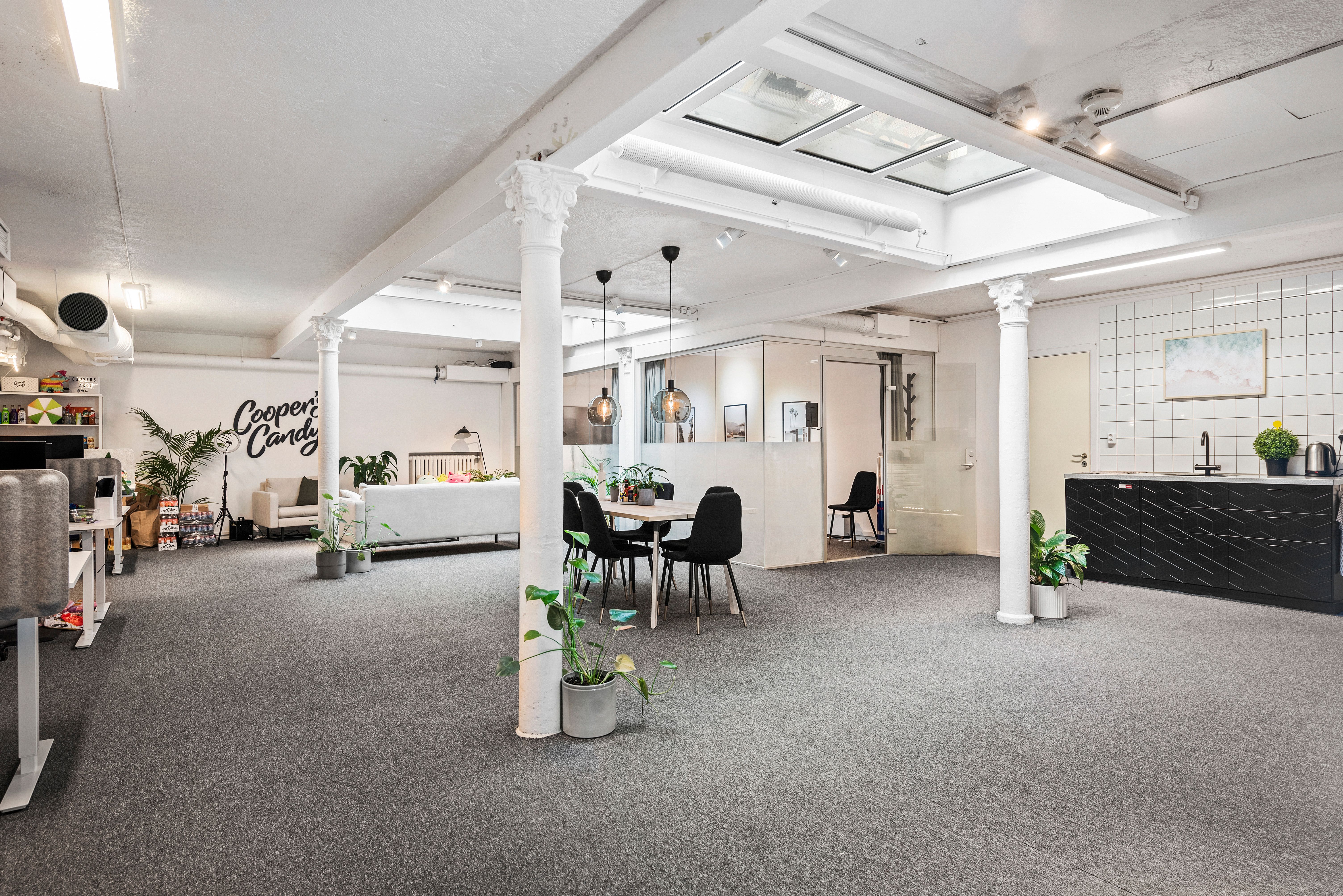 Egen entré direkt från gatan med en cool entré som går en halv trappa ner. Du kommer rakt ner till lokalens större utrymme med två stora takfönster mot fastighetens innergård. Här har du även ett litet pentry samt två toaletter. Det finns ytterligare en till WC samt ett större pentry i mitten av lokalen. Två större rum mot Markvardsgatan med fönster i överkant. Ett antal mindre rum för möte, samtalsrum eller liknande.