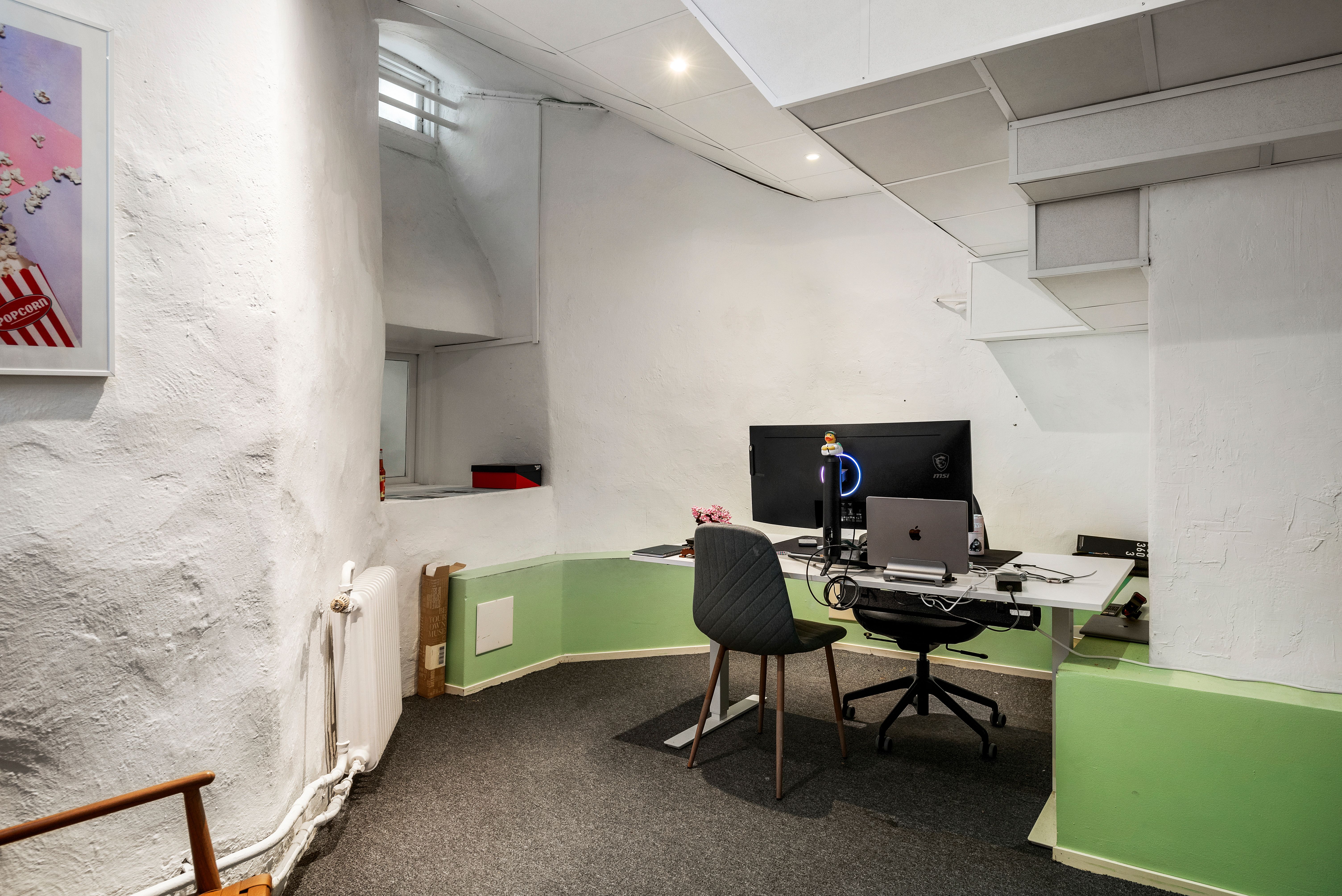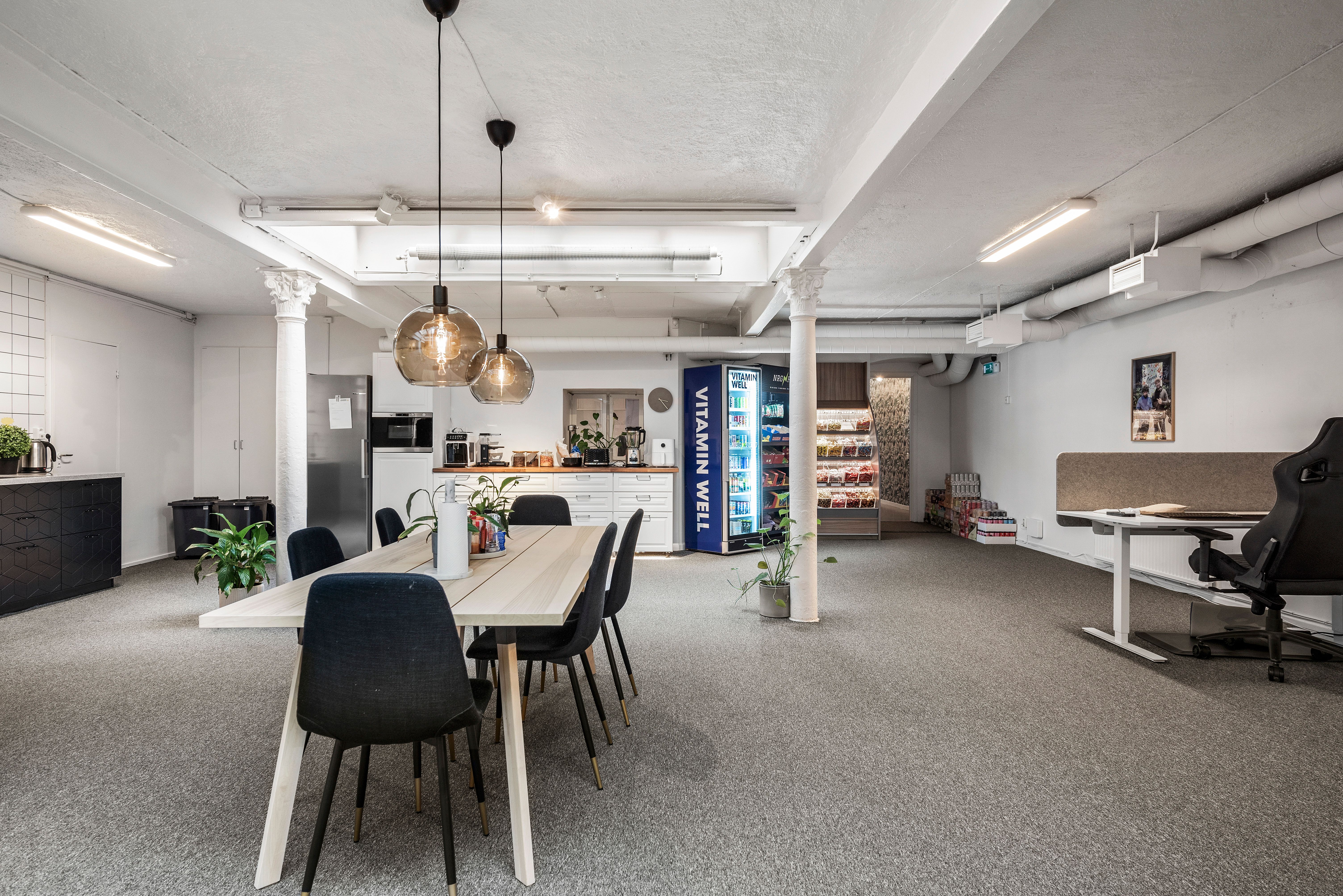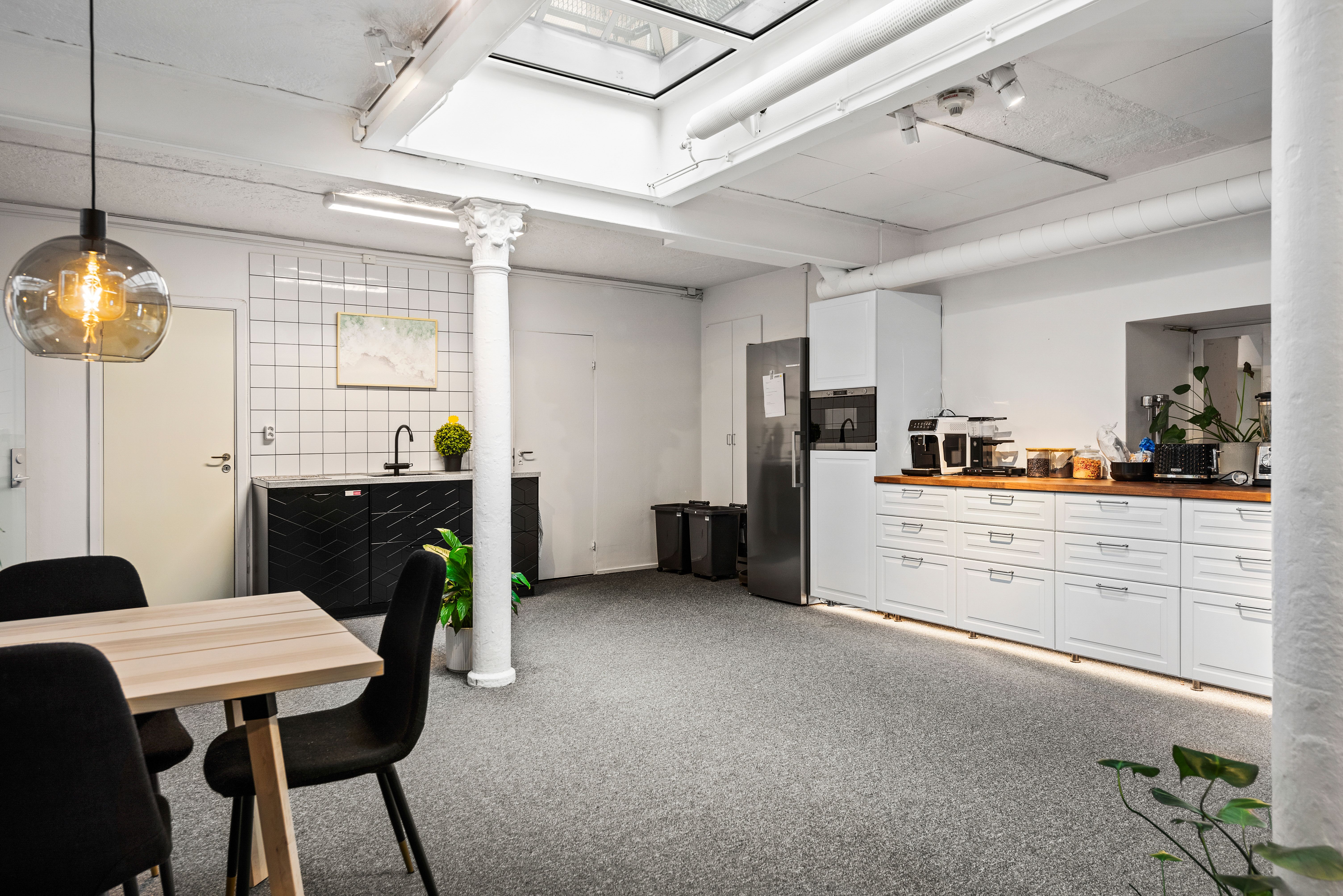 Egen entré direkt från gatan med en cool entré som går en halv trappa ner. Du kommer rakt ner till lokalens större utrymme med två stora takfönster mot fastighetens innergård. Här har du även ett litet pentry samt två toaletter. Det finns ytterligare en till WC samt ett större pentry i mitten av lokalen. Två större rum mot Markvardsgatan med fönster i överkant. Ett antal mindre rum för möte, samtalsrum eller liknande.