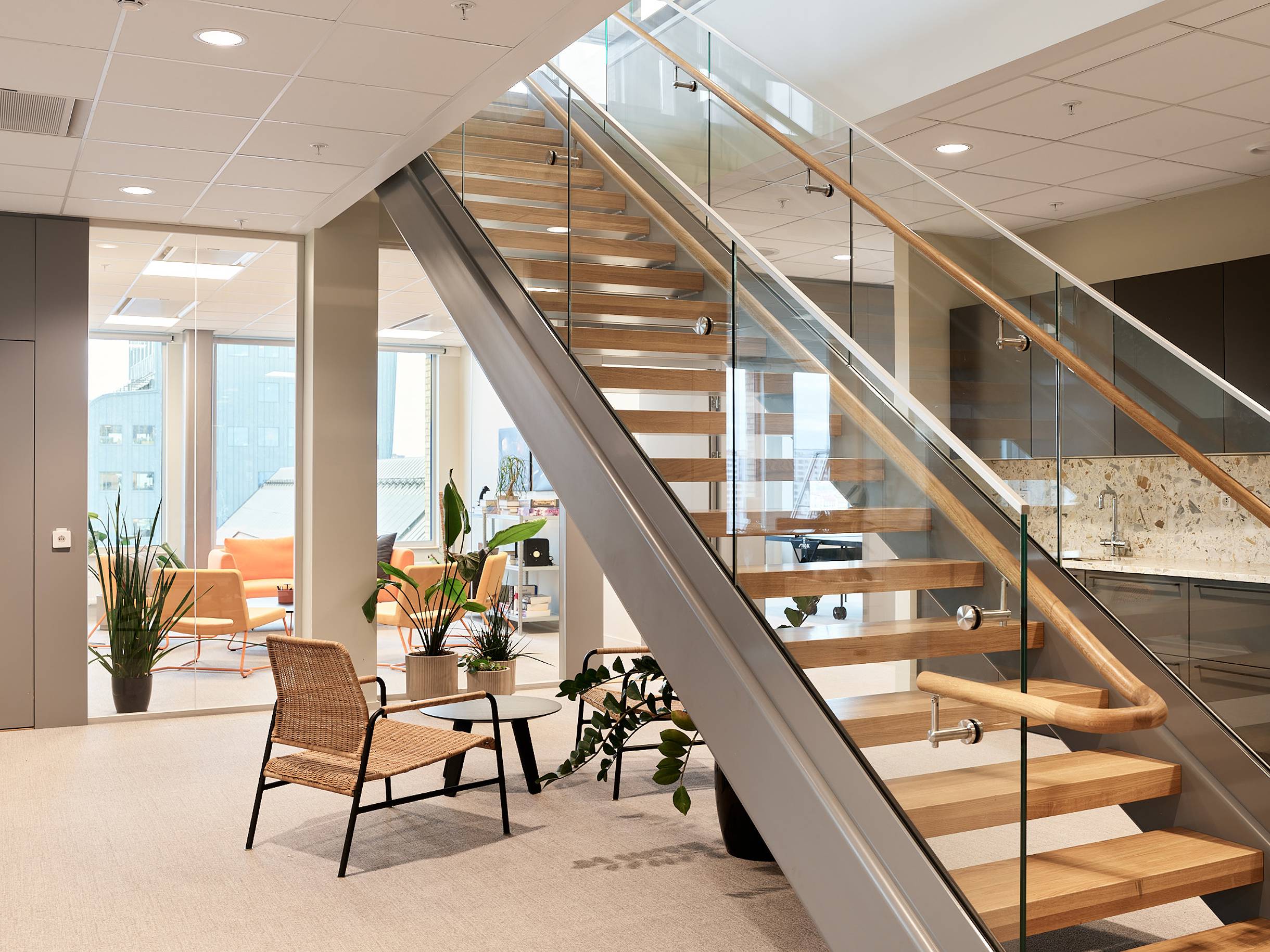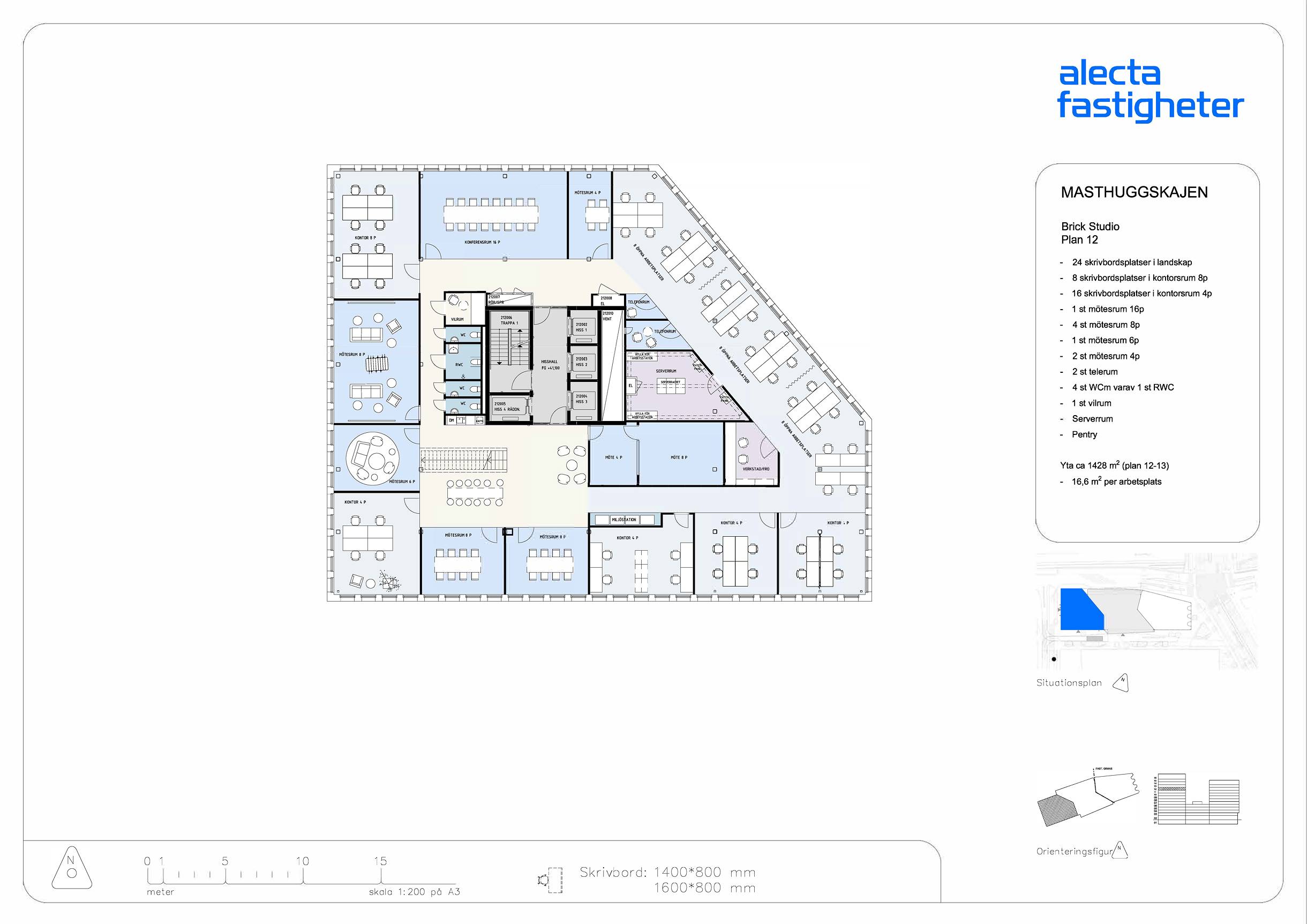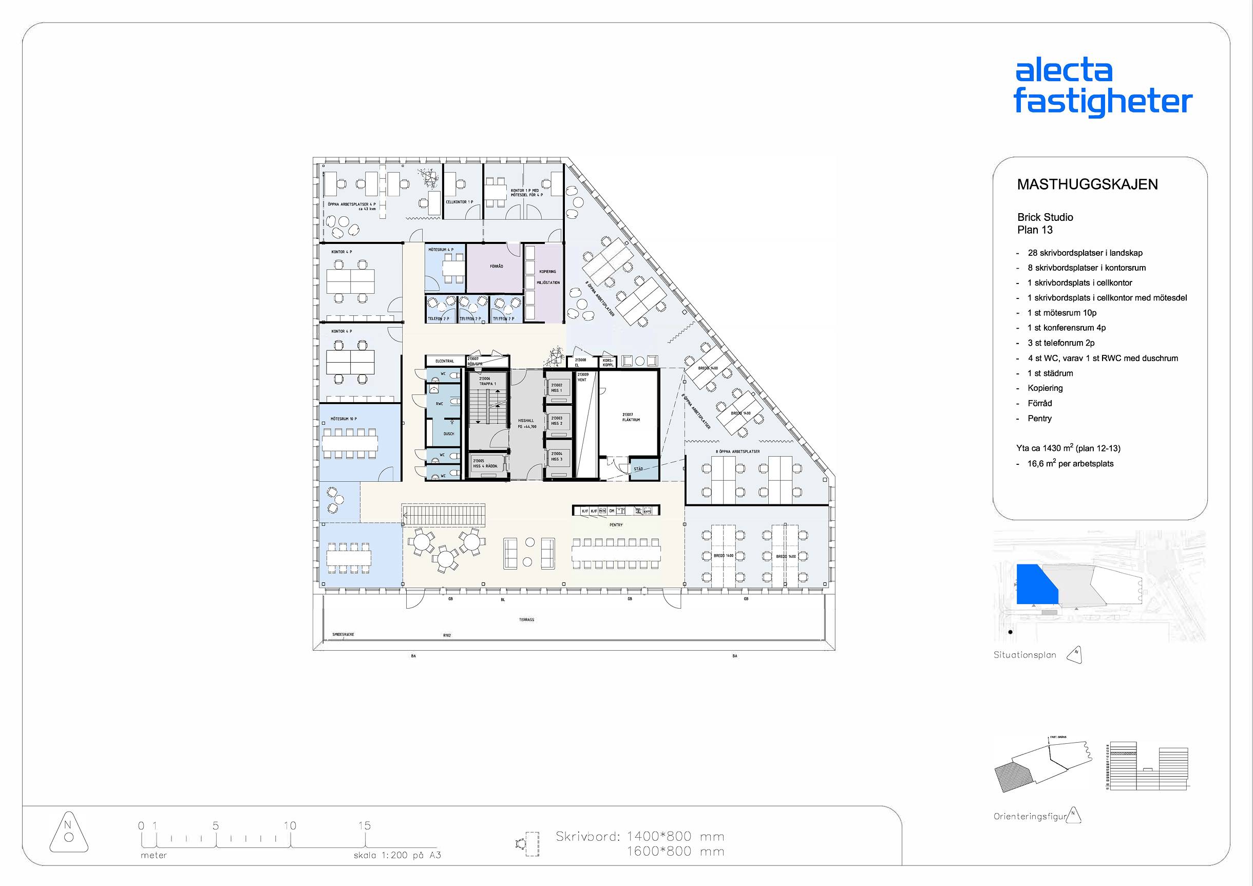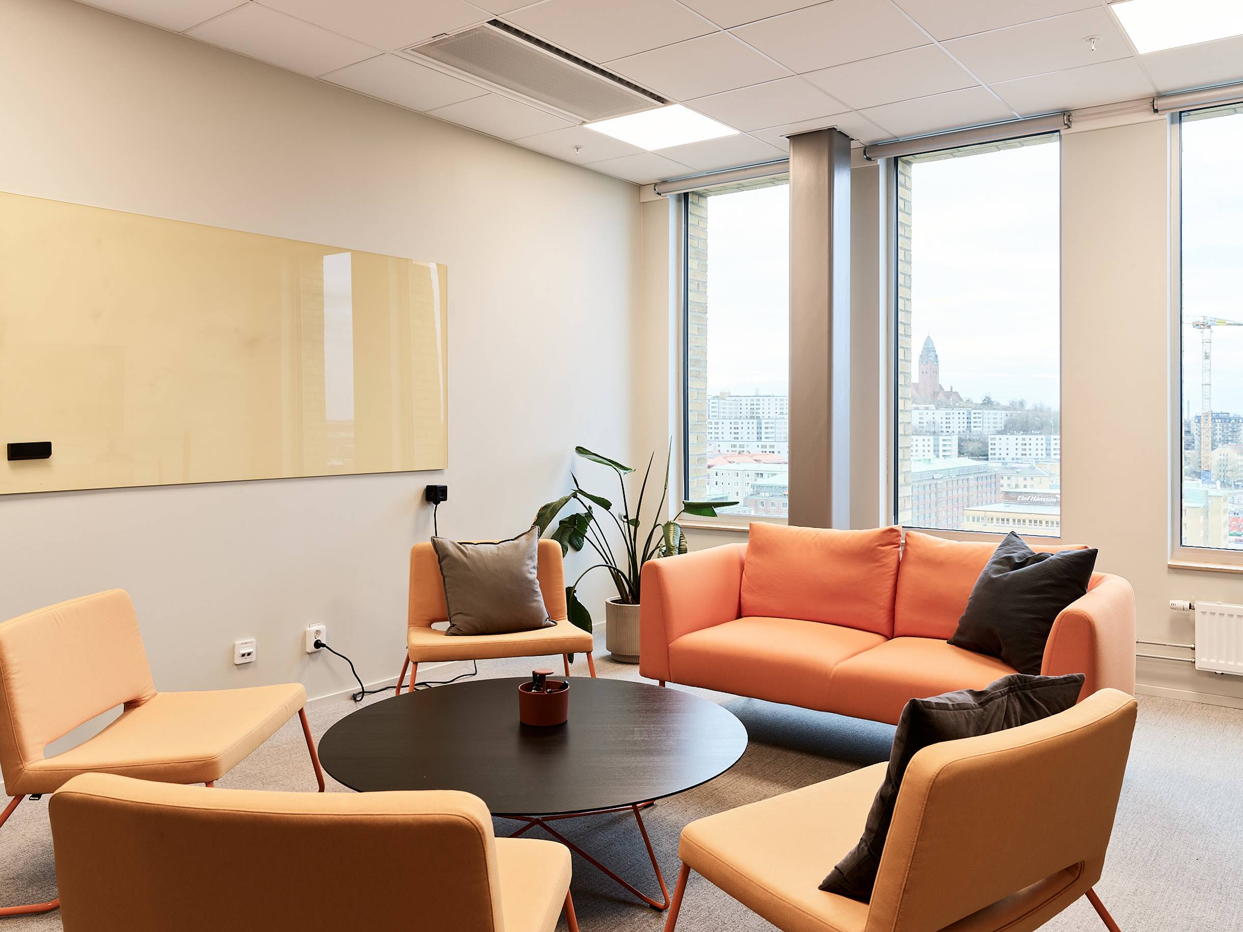 Planlösningen är väl genomtänkt med öppna arbetsytor, mötesrum i olika storlekar, samt ytor för sociala och kreativa möten. Här finns även pausutrymmen och funktionella serviceytor som skapar en trivsam och effektiv arbetsdag.
