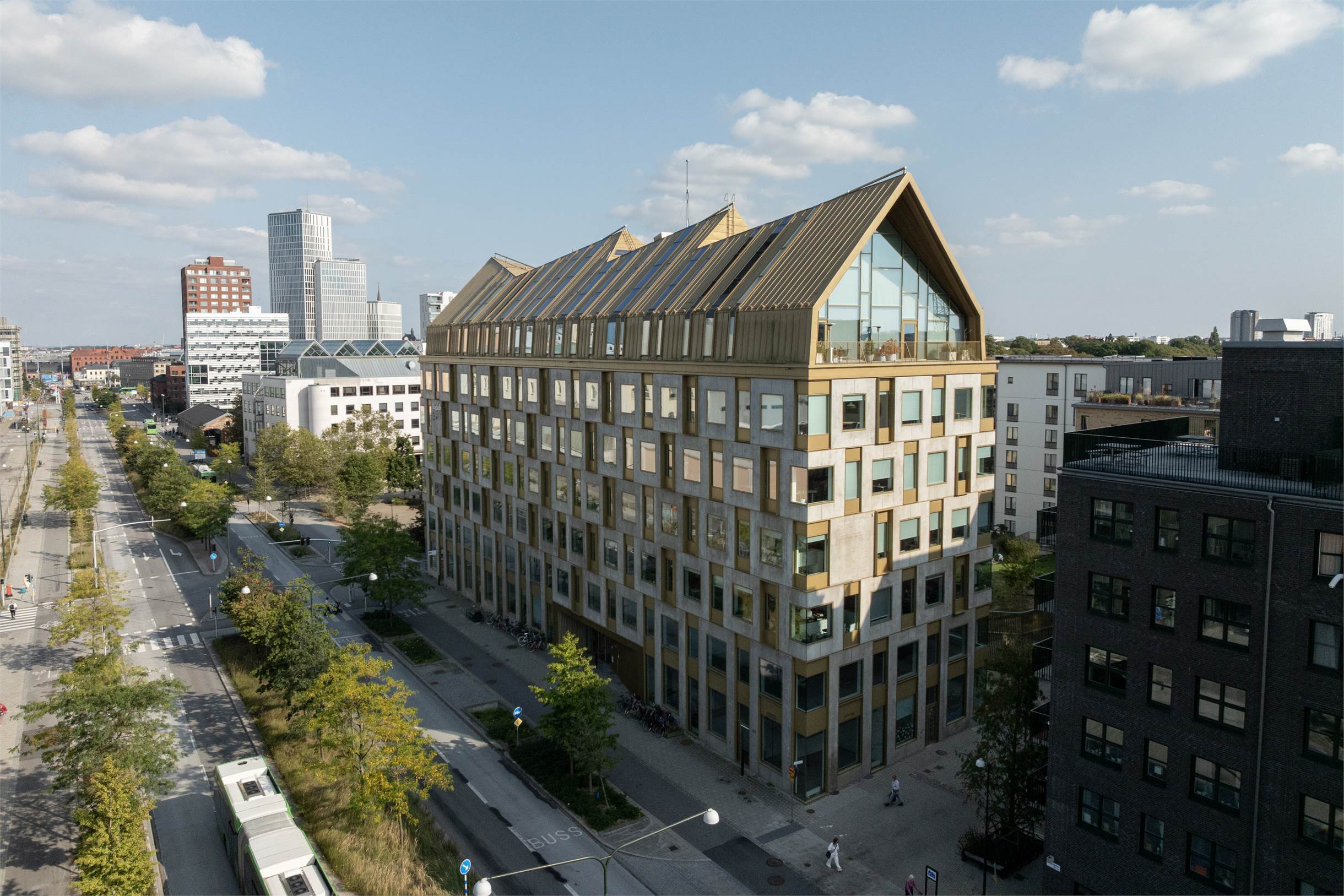 Ett ikoniskt kontorshus med gyllene tak och gångavstånd till Malmö Centralstation.