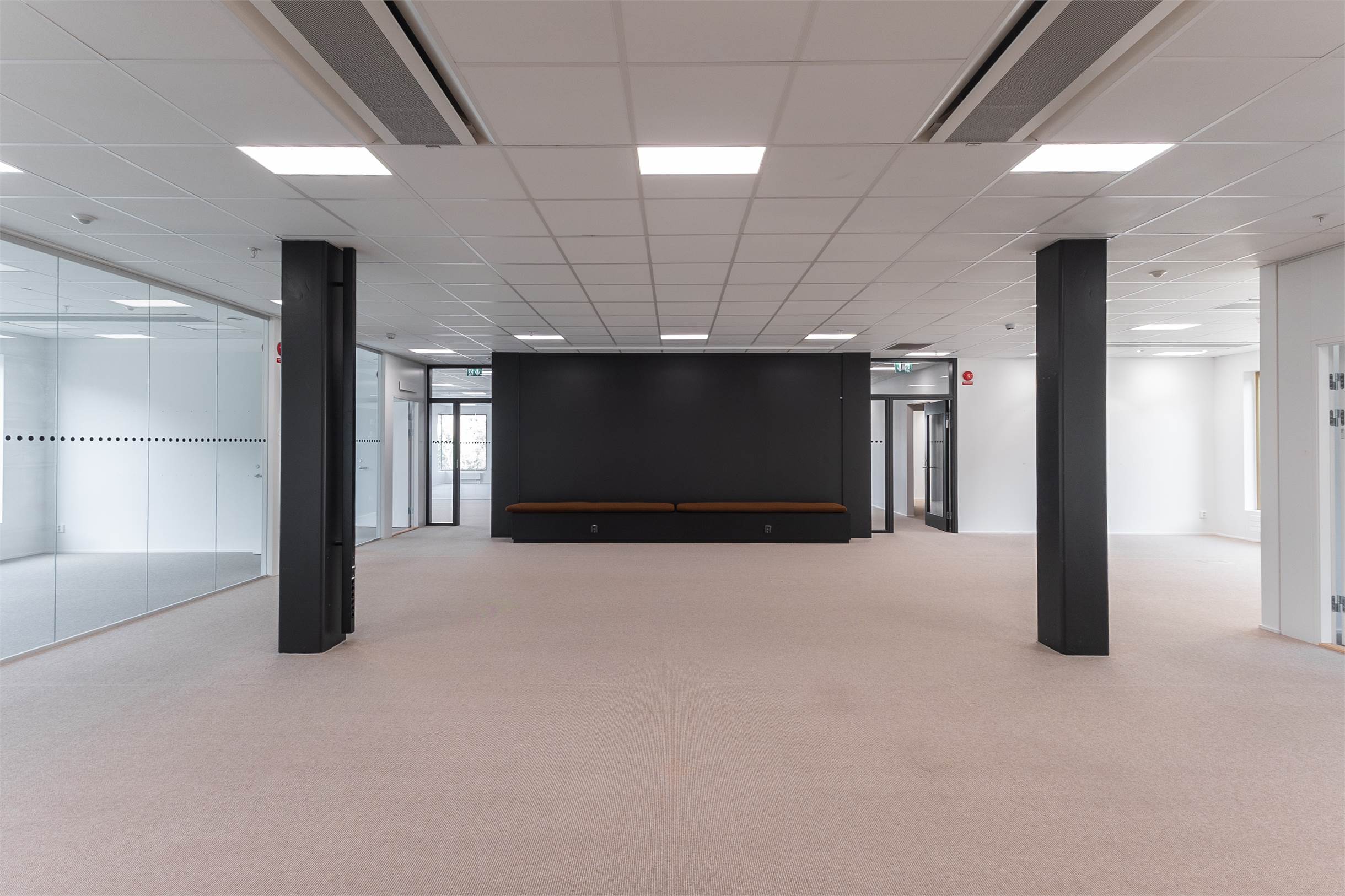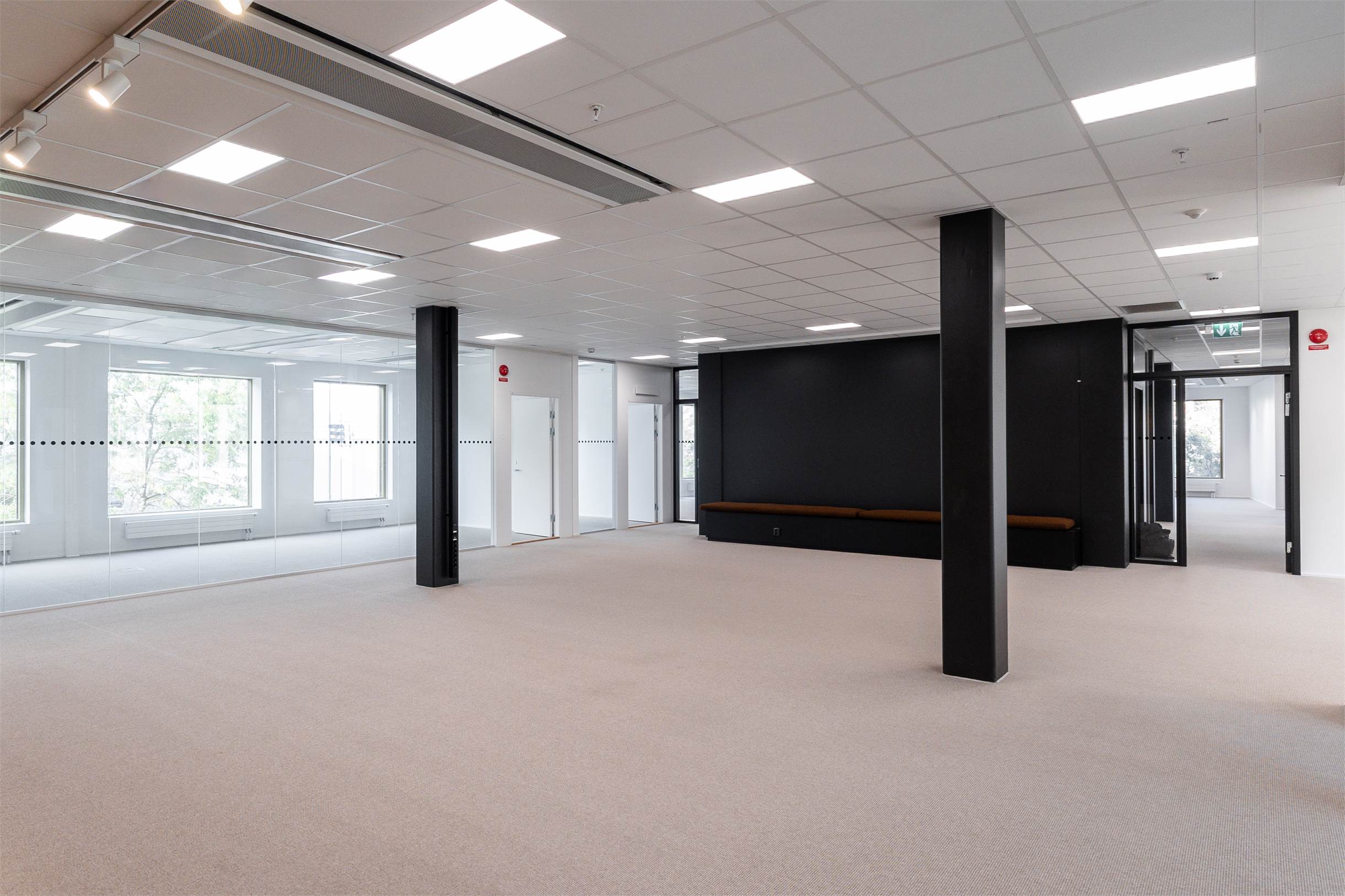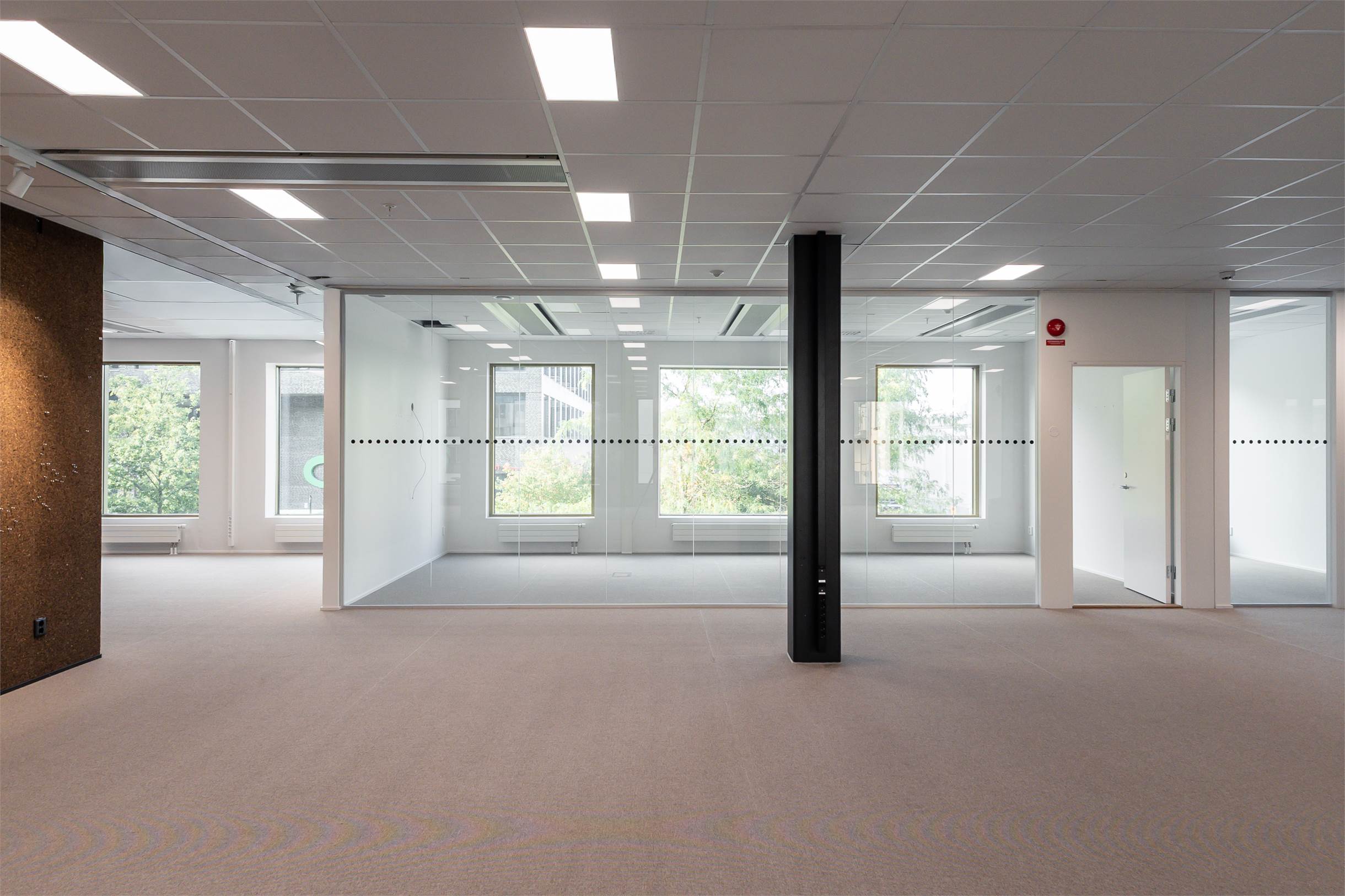 Planlösning: Öppet kontorslandskap, konferensrum och mindre arbets- eller mötesrum