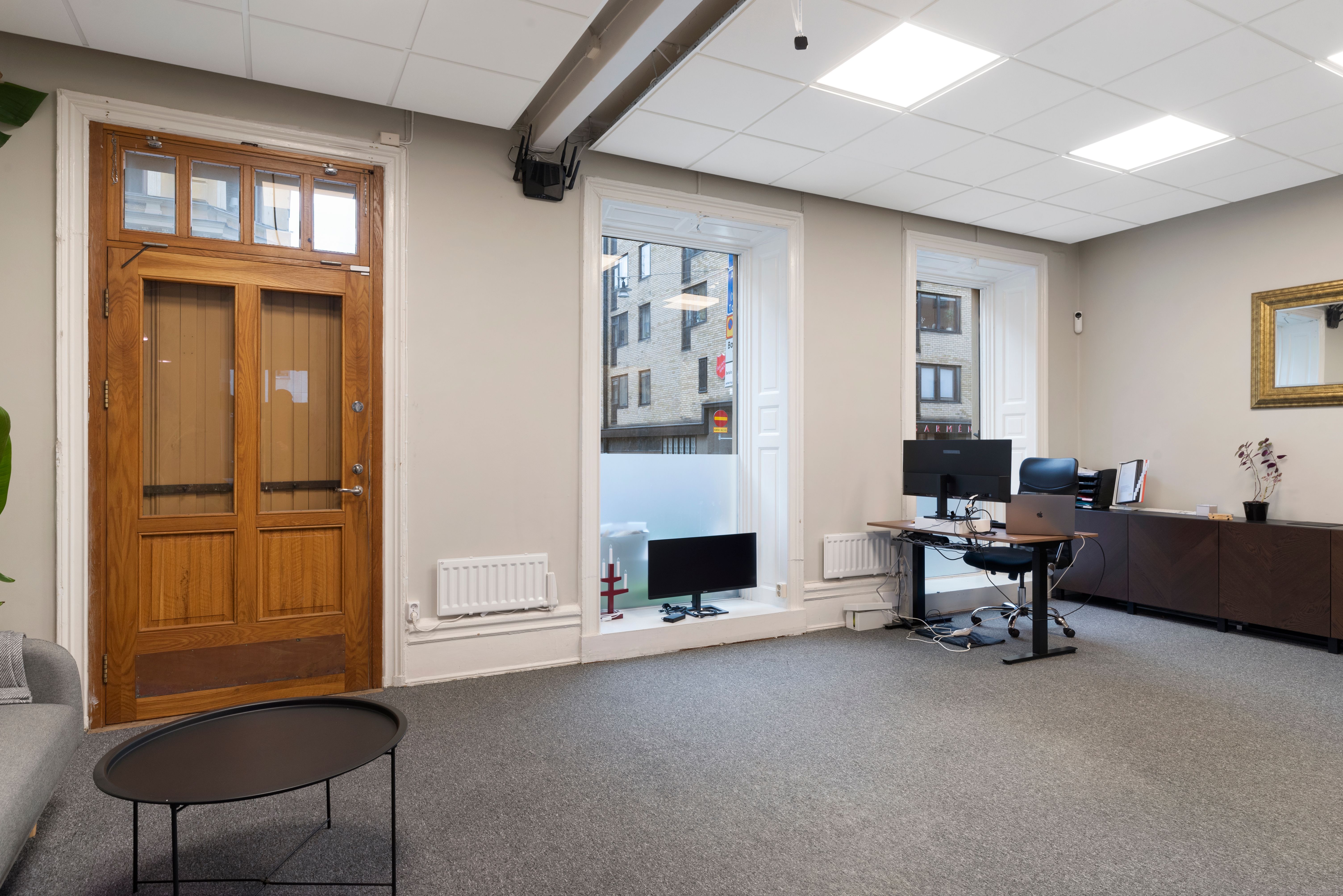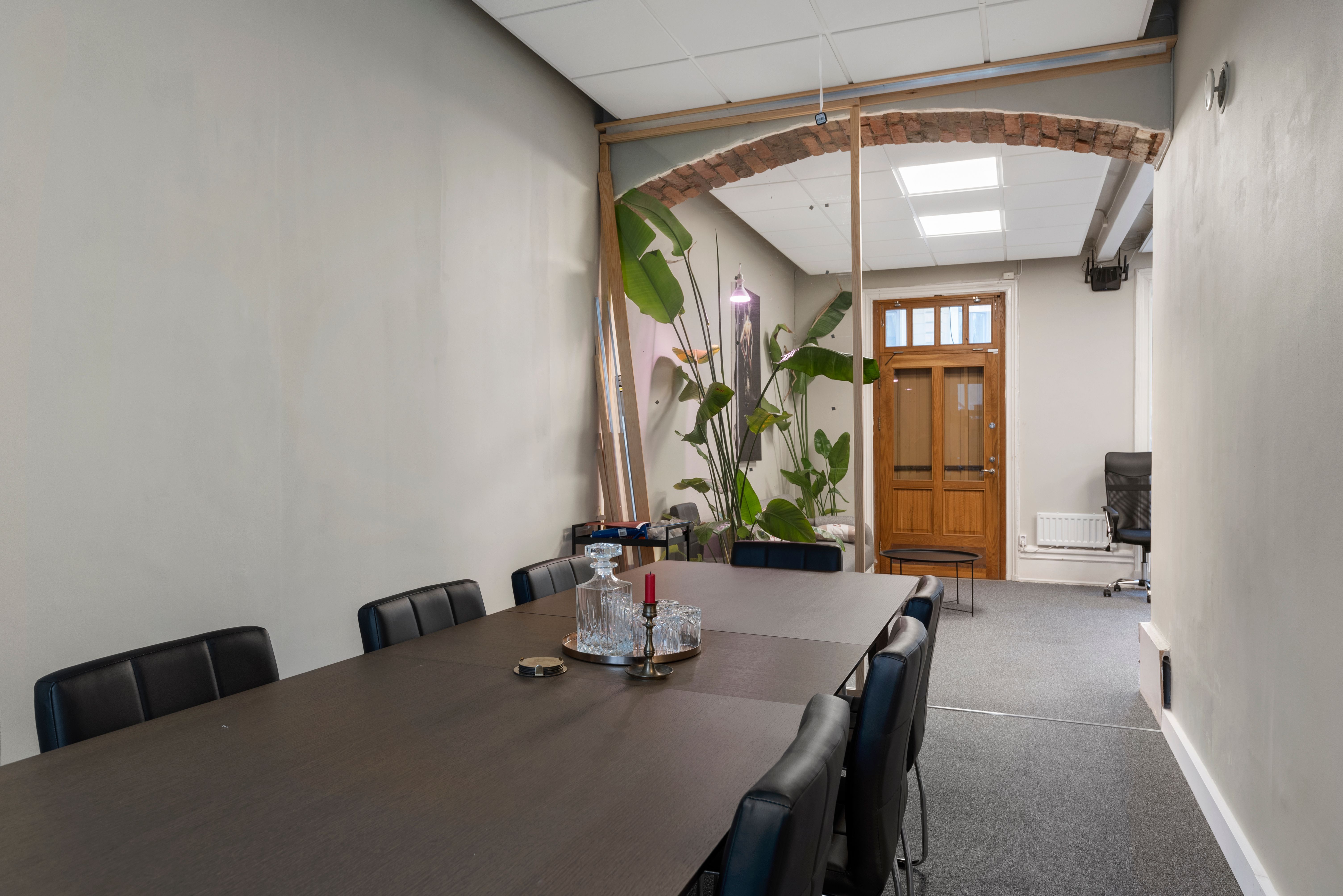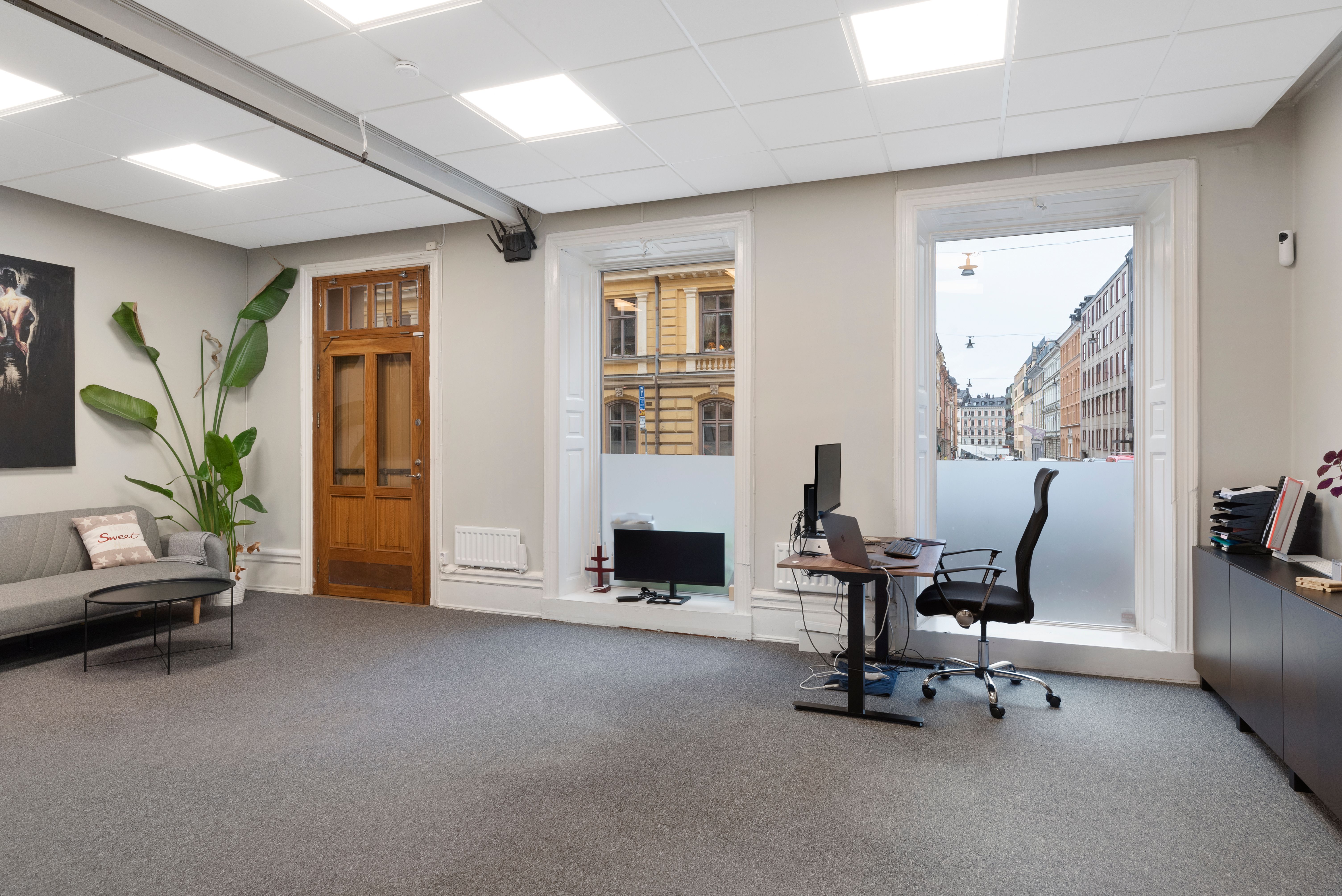 Med högt i tak och härligt ljusinsläpp erbjuder lokalen ett större rum samt två mindre, perfekt för mötesrum eller kontor. Dessutom finns ett litet pentry och wc, vilket gör det enkelt att skapa en trevlig arbetsmiljö.