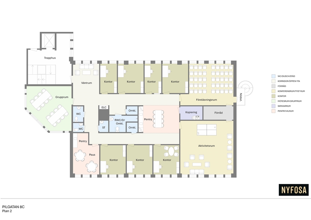 Planlösningen är flexibel och består i dagsläget av flera rum i olika storlekar, vilket gör den lätt att anpassa efter behov. Det finns goda möjligheter att skapa en kombination av öppna arbetsytor, mötesrum och sociala ytor eller att utforma ett helt öppet kontorslandskap. Lokalen kan anpassas i nära dialog med hyresvärden för att optimalt stödja verksamhetens arbetssätt.
