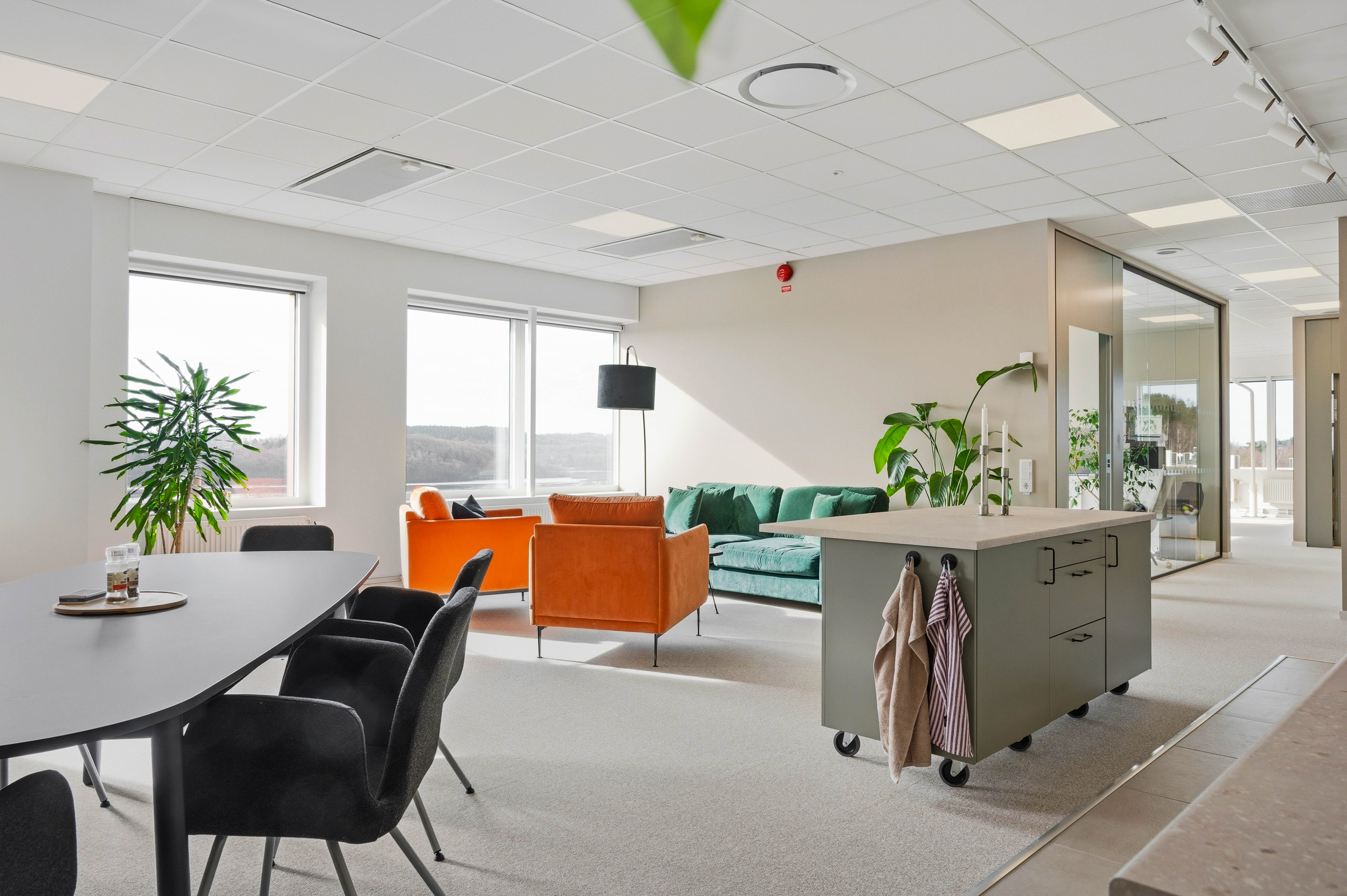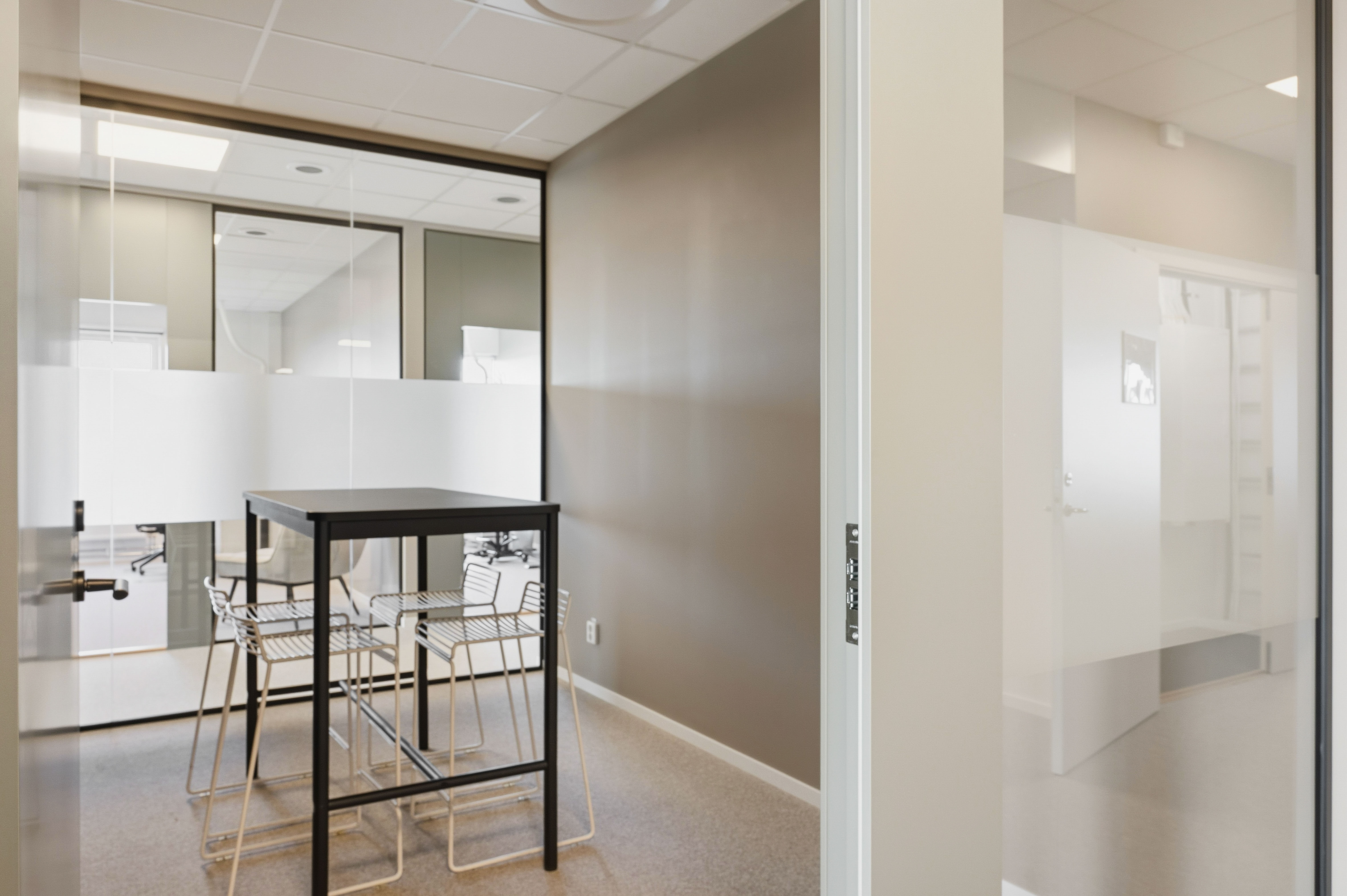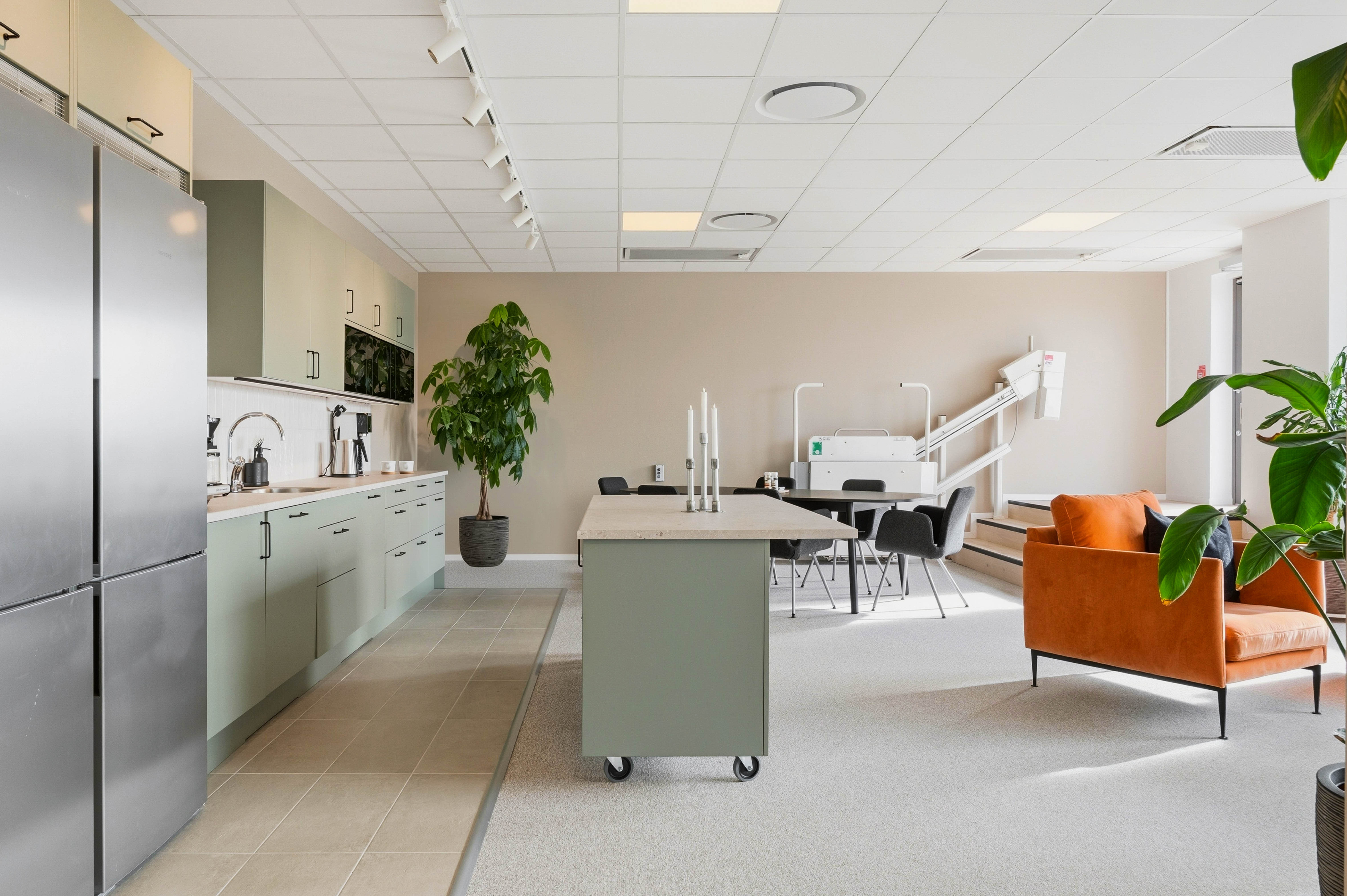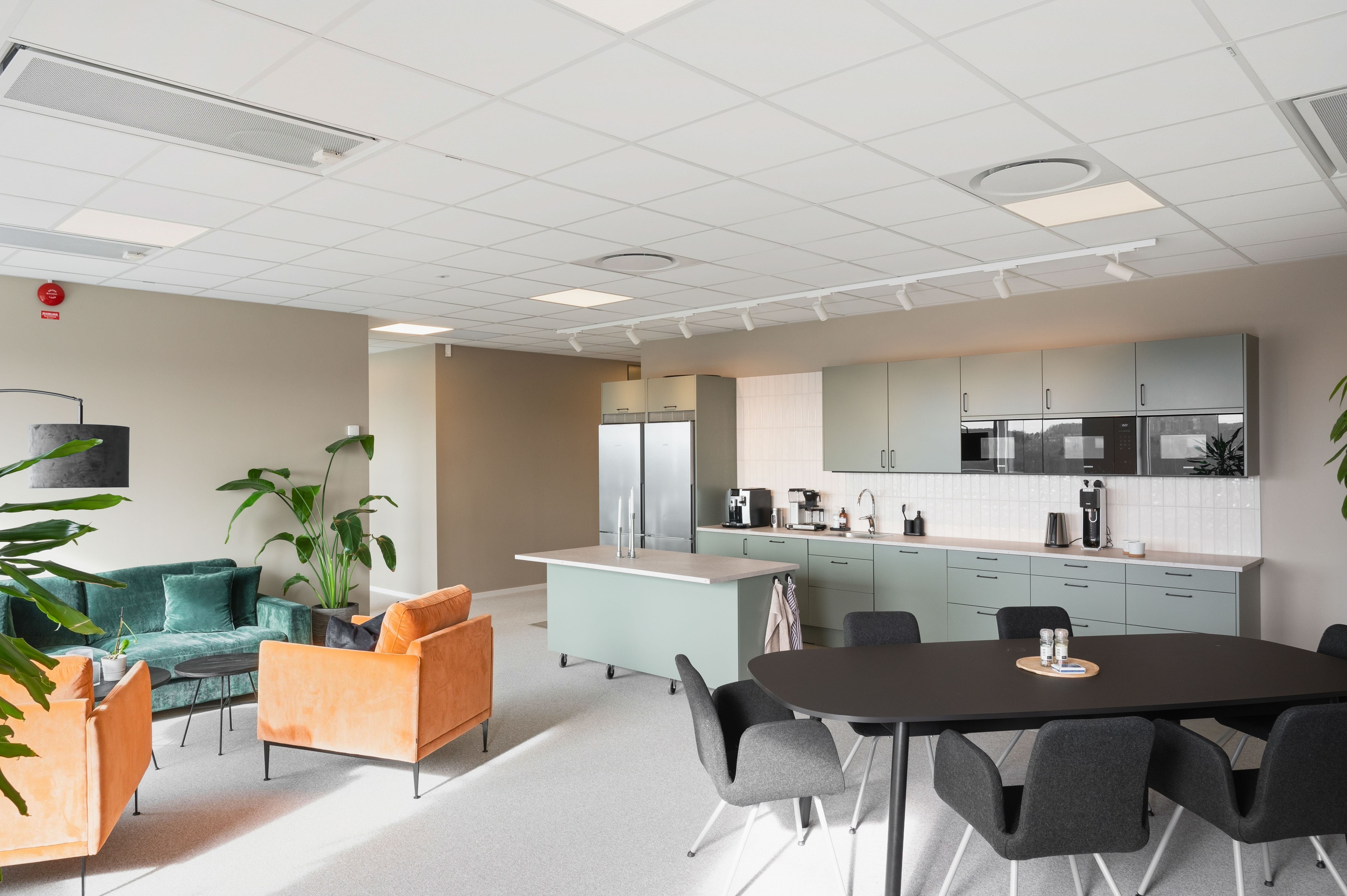 De gemensamma ytorna håller hög standard med ett stort, fullt utrustat kök med köksö, inbjudande loungeytor samt egen takterrass – idealiskt för både arbete och sociala sammanhang. Interiören präglas av moderna och naturnära materialval som skapar en trivsam och professionell arbetsmiljö.