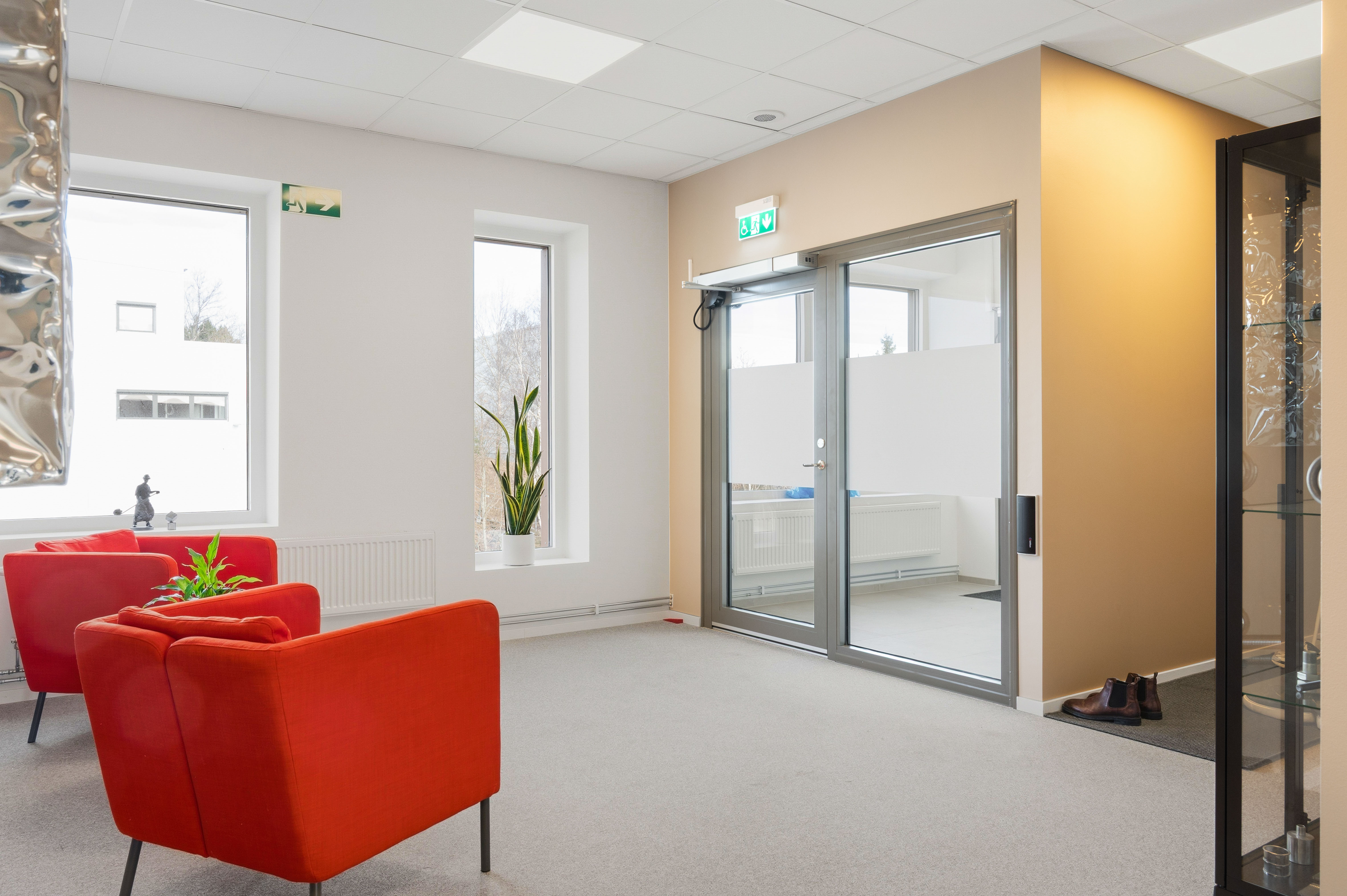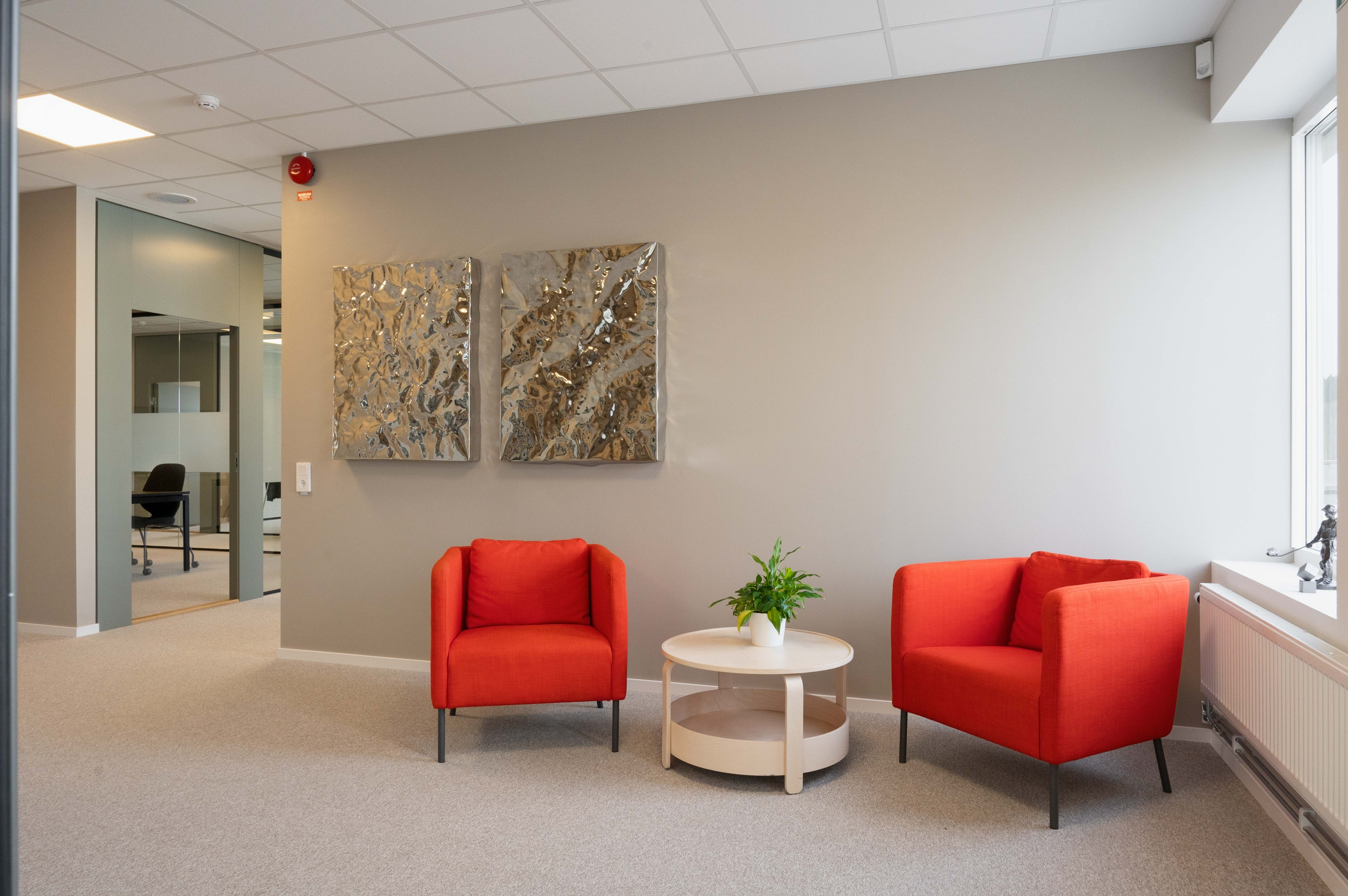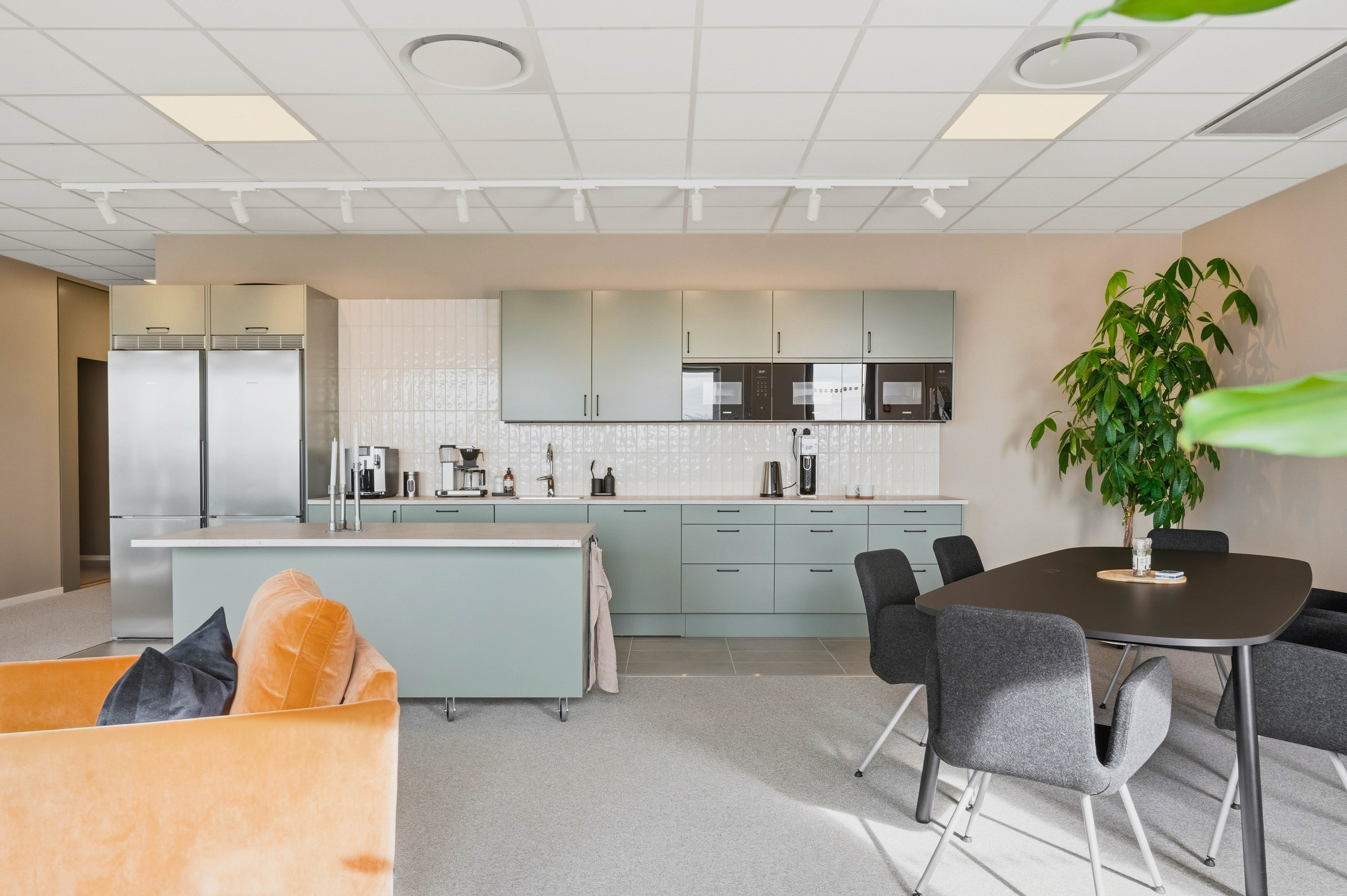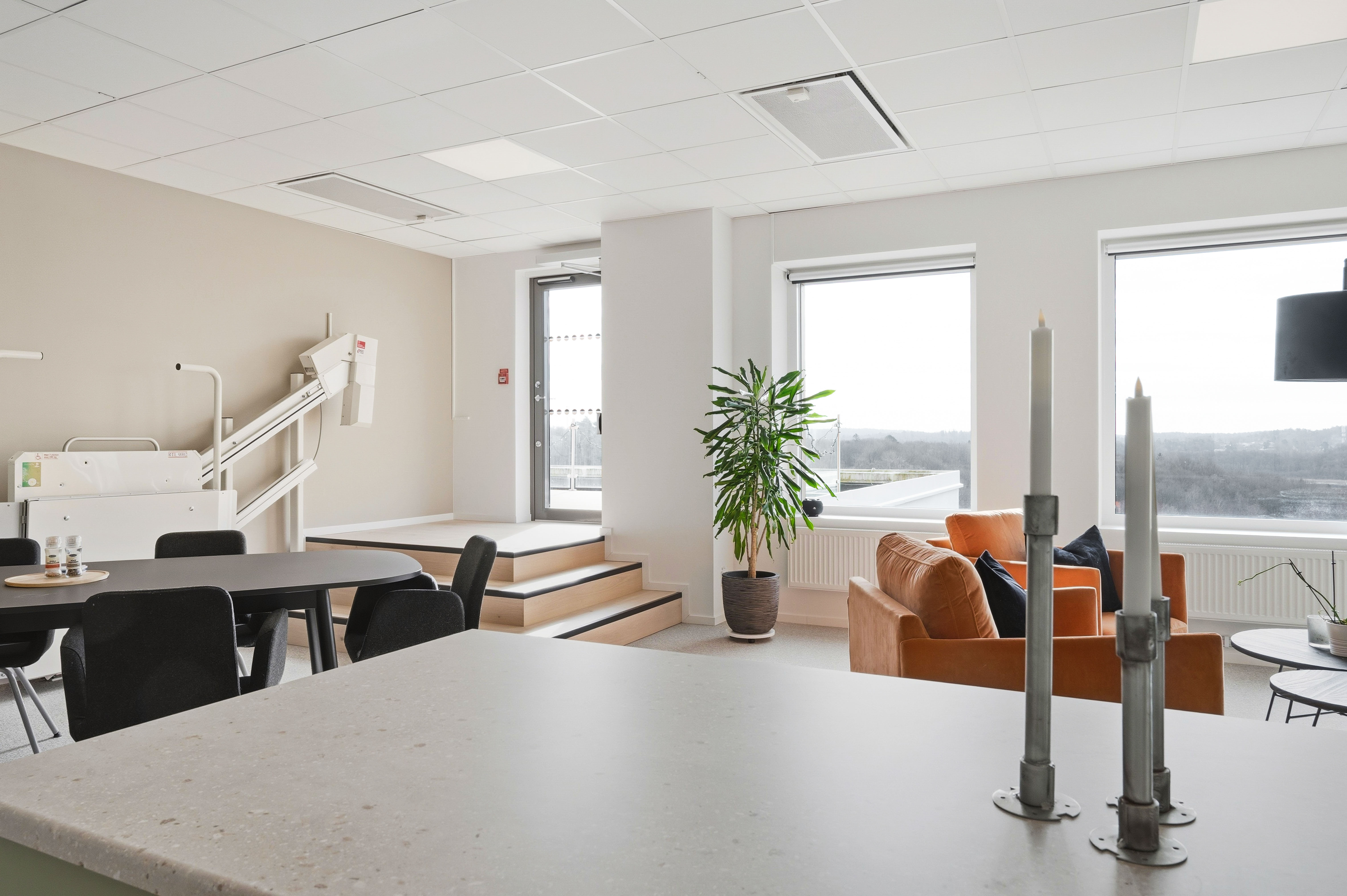 De gemensamma ytorna håller hög standard med ett stort, fullt utrustat kök med köksö, inbjudande loungeytor samt egen takterrass – idealiskt för både arbete och sociala sammanhang. Interiören präglas av moderna och naturnära materialval som skapar en trivsam och professionell arbetsmiljö.