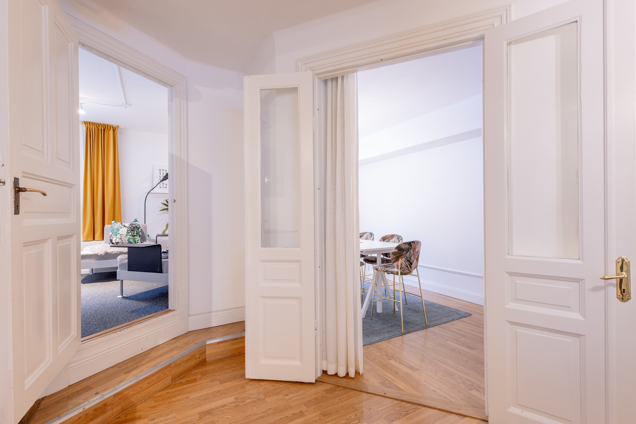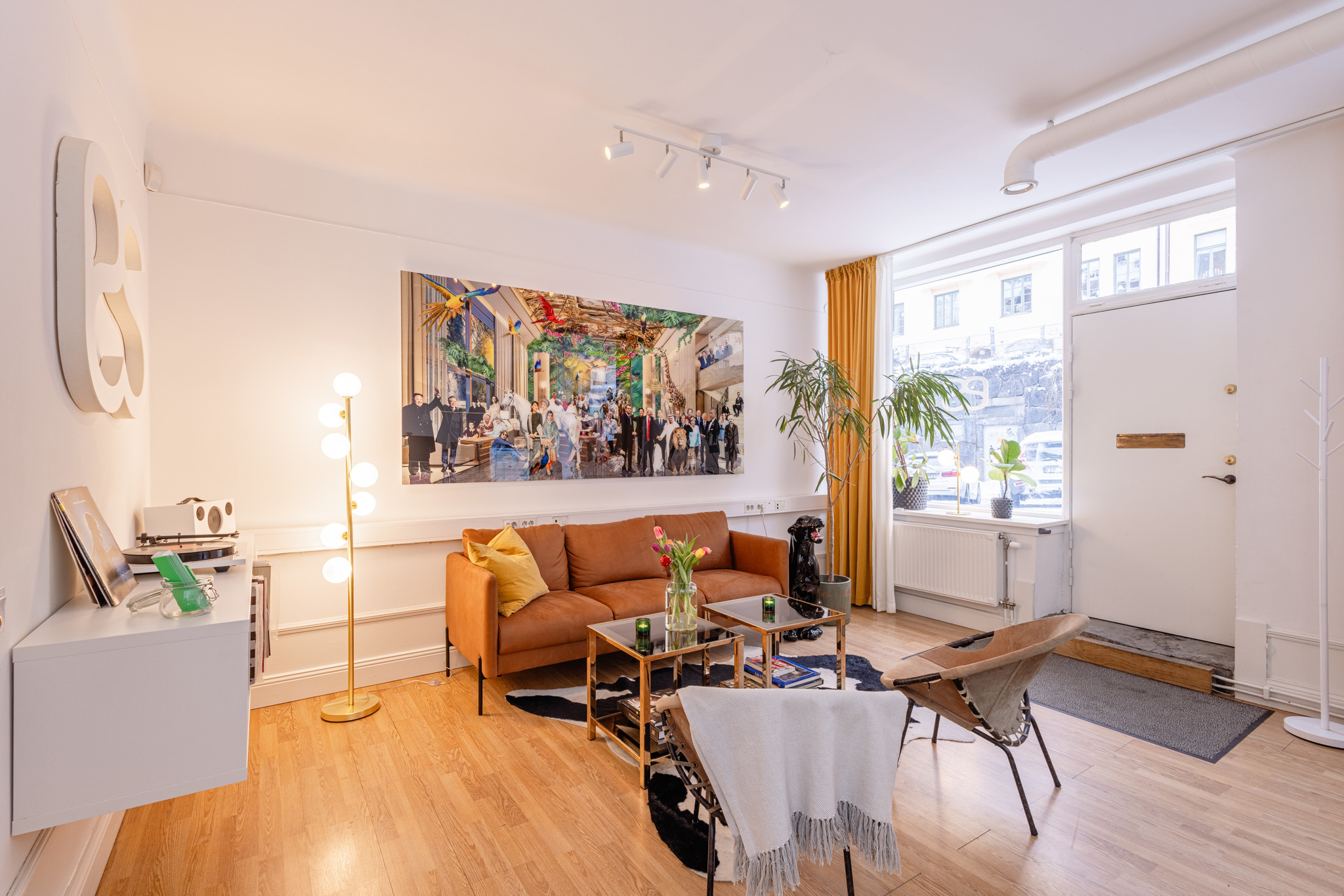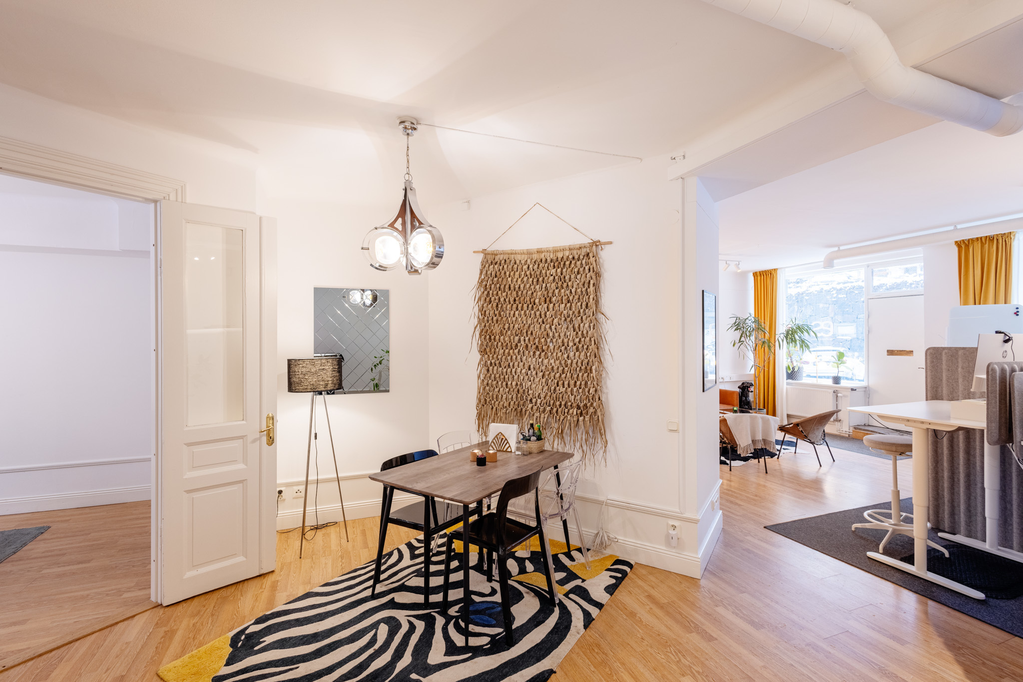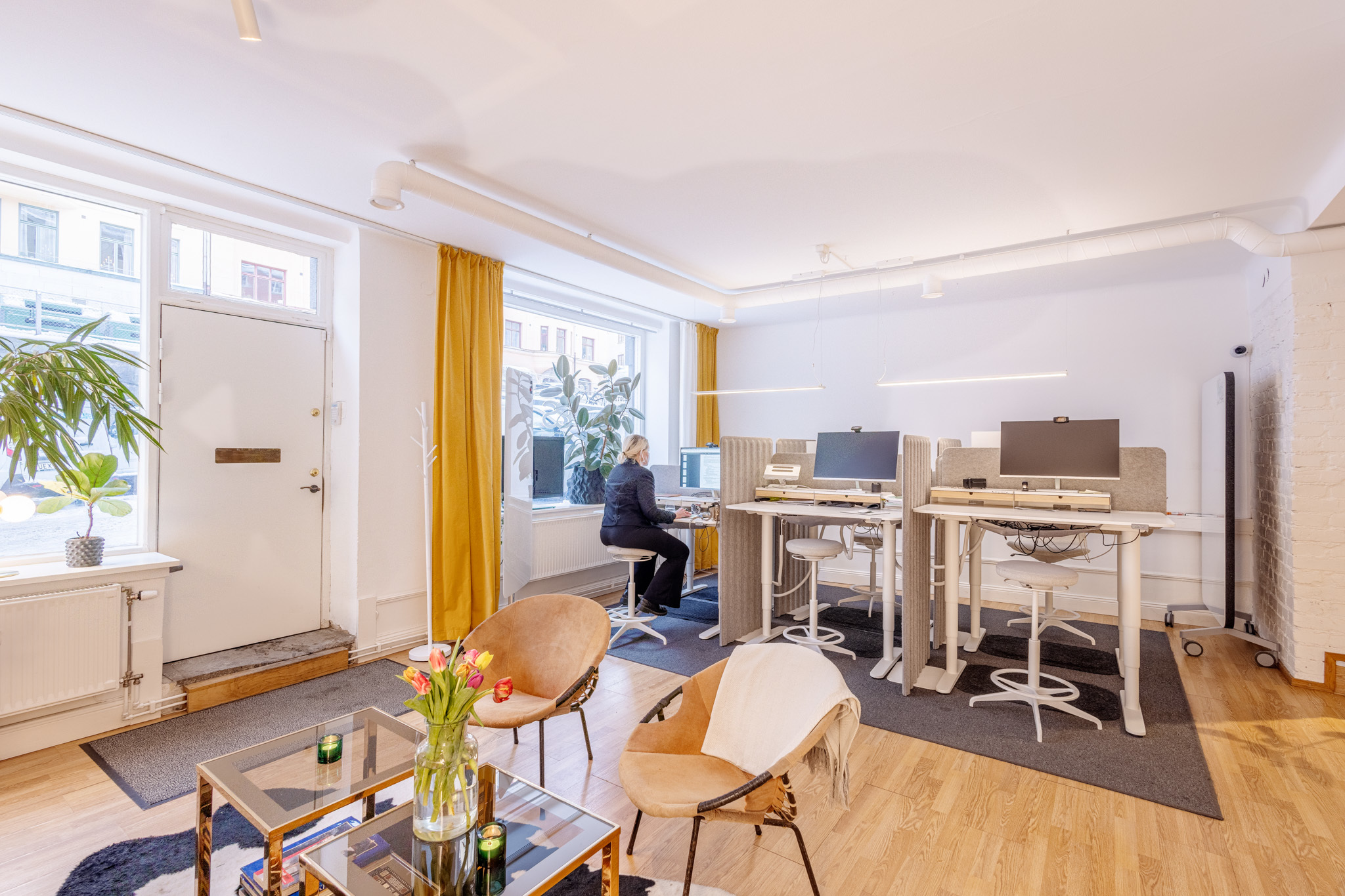 Lokalen nås via sin egen ingång direkt från gatan. Här välkomnar en öppen yta med ett fint ljusinsläpp från de stora skyltfönstren som vetter ut mot gatan. Denna yta lämpar sig väl som arbetsyta kombinerat med lounge eller "touchdown". Vidare in i lokalen finner vi två separata rum i bra storlekar, båda med ett trevligt ljusinsläpp från fönstren mot fastighetens trevliga innergård.