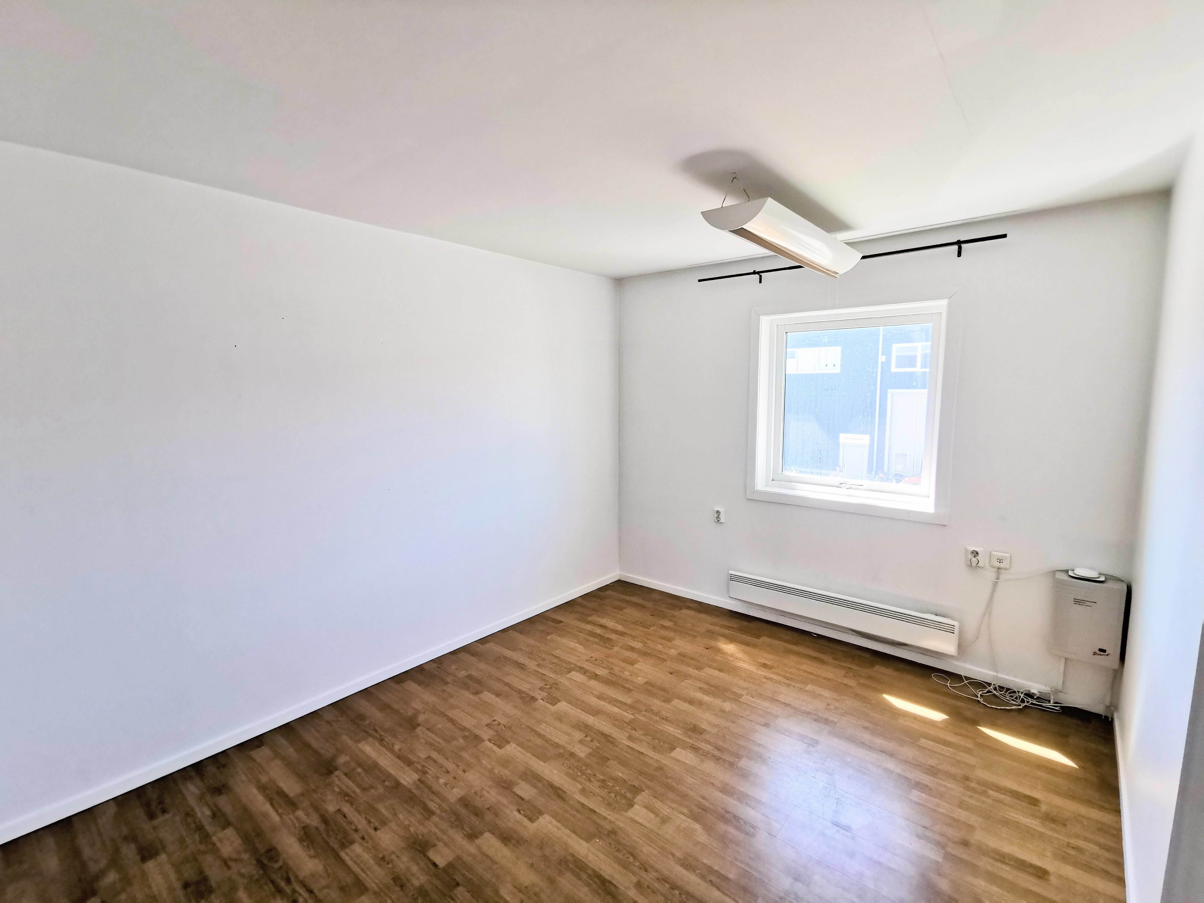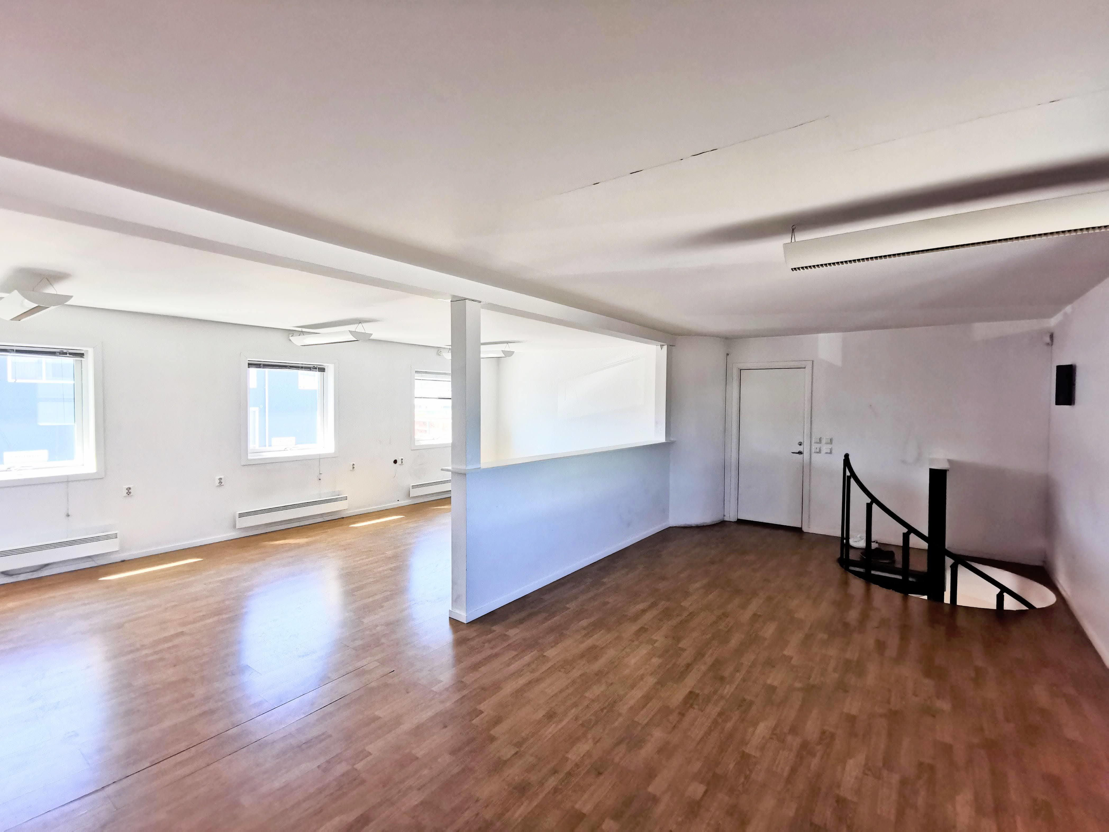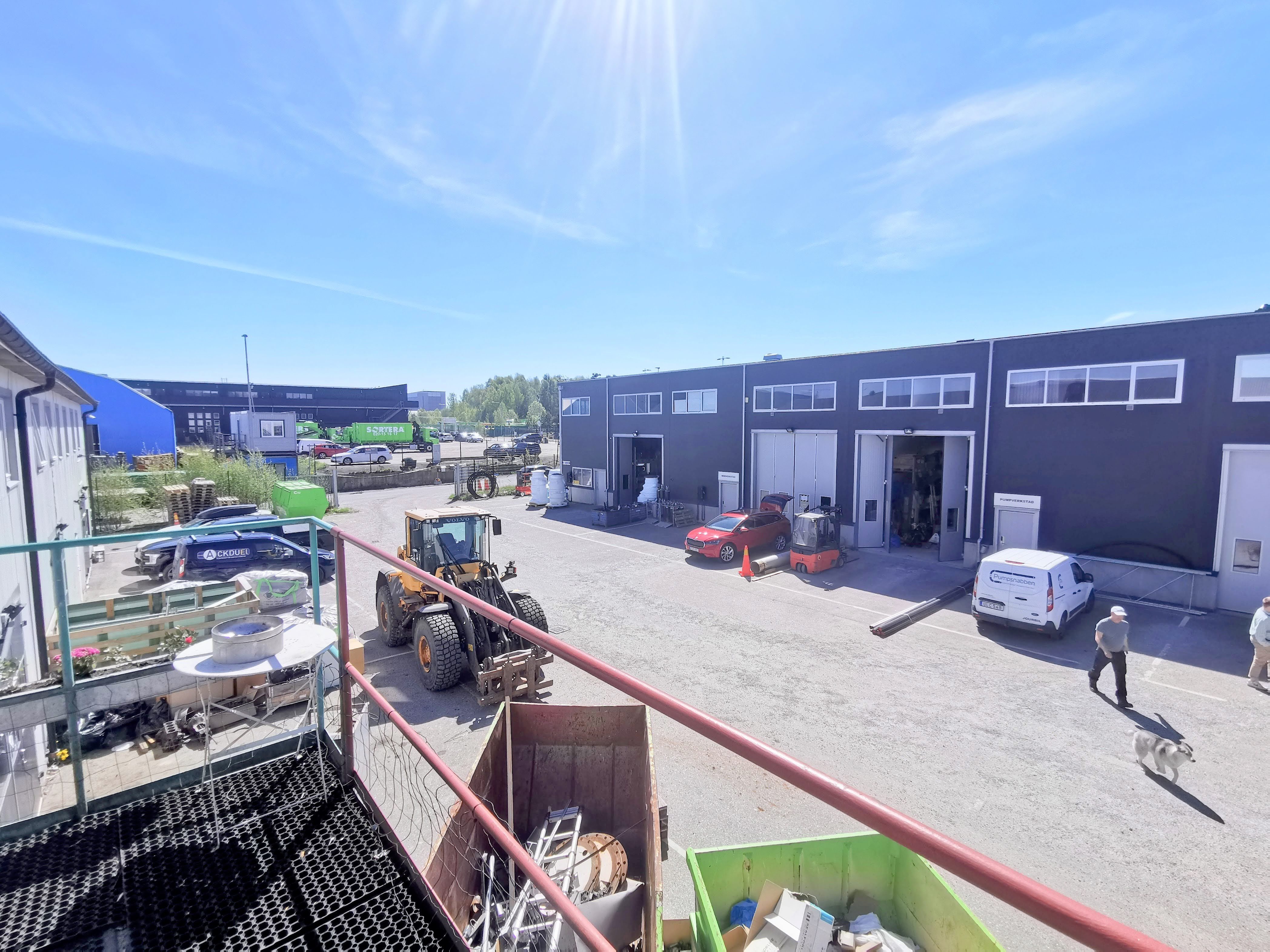 Fint ytskikt på övre plan för kontor, kök och WC som nås genom spiraltrappa.