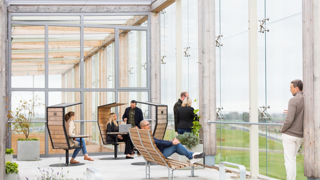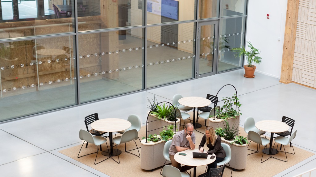 Space är ett hållbart hus som värnar om medarbetarna och byggnaden är trippelcertifierad, bland annat med WELL – vilket innebär att människans välmående står i fokus.