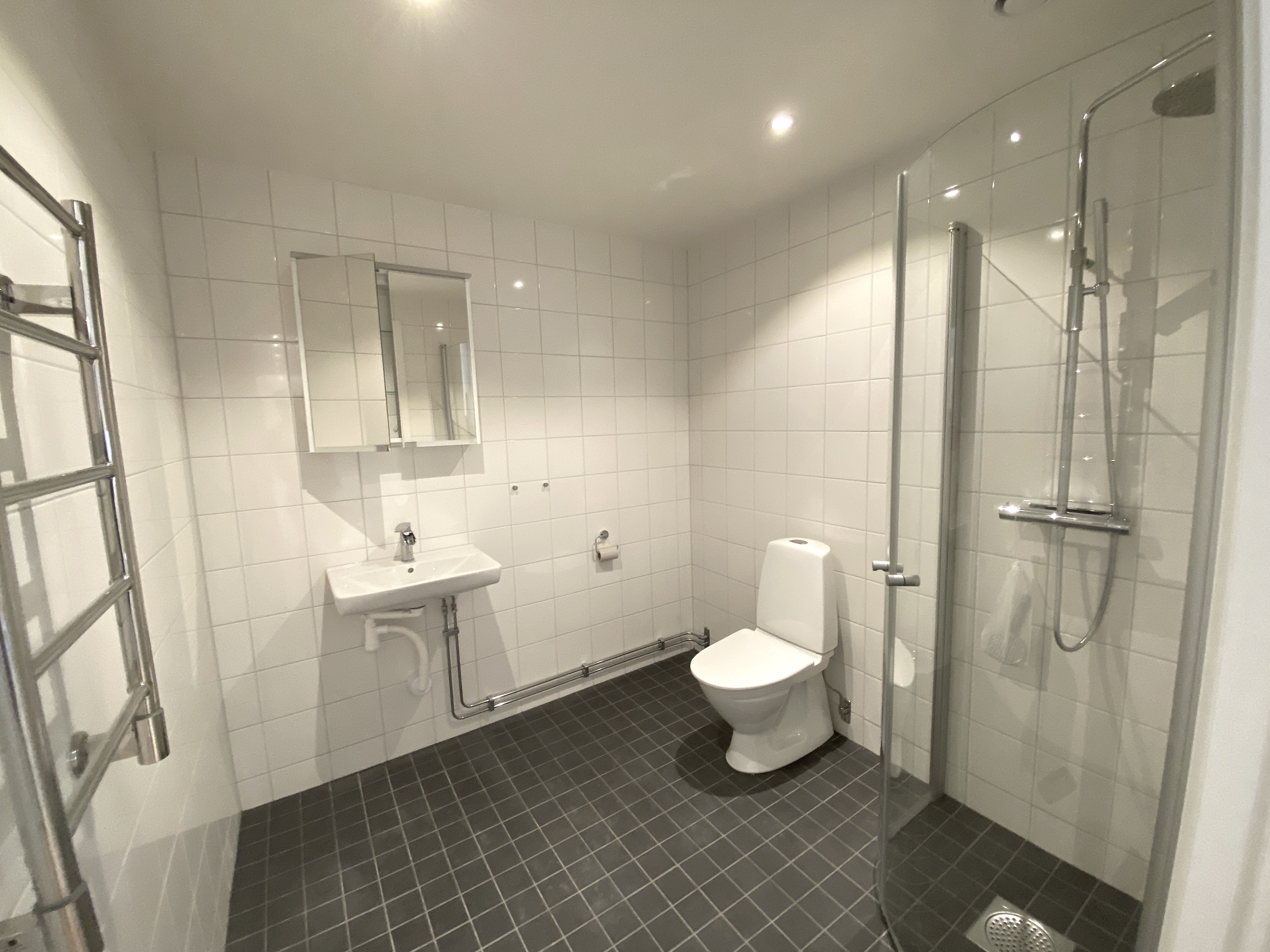 Här finns även ett smakfullt kök/pentry och ett helkaklat, tillgänglighetsanpassat badrum med dusch och wc.