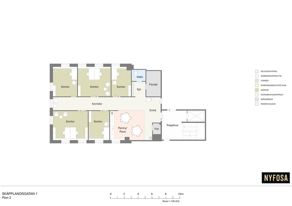 Den genomtänkta planlösningen gör det enkelt att skapa en arbetsmiljö som främjar både fokus och samarbete. För pauser under arbetsdagen finns ett pausrum där medarbetare kan koppla av, ta en kaffe eller äta lunch i en trevlig miljö.