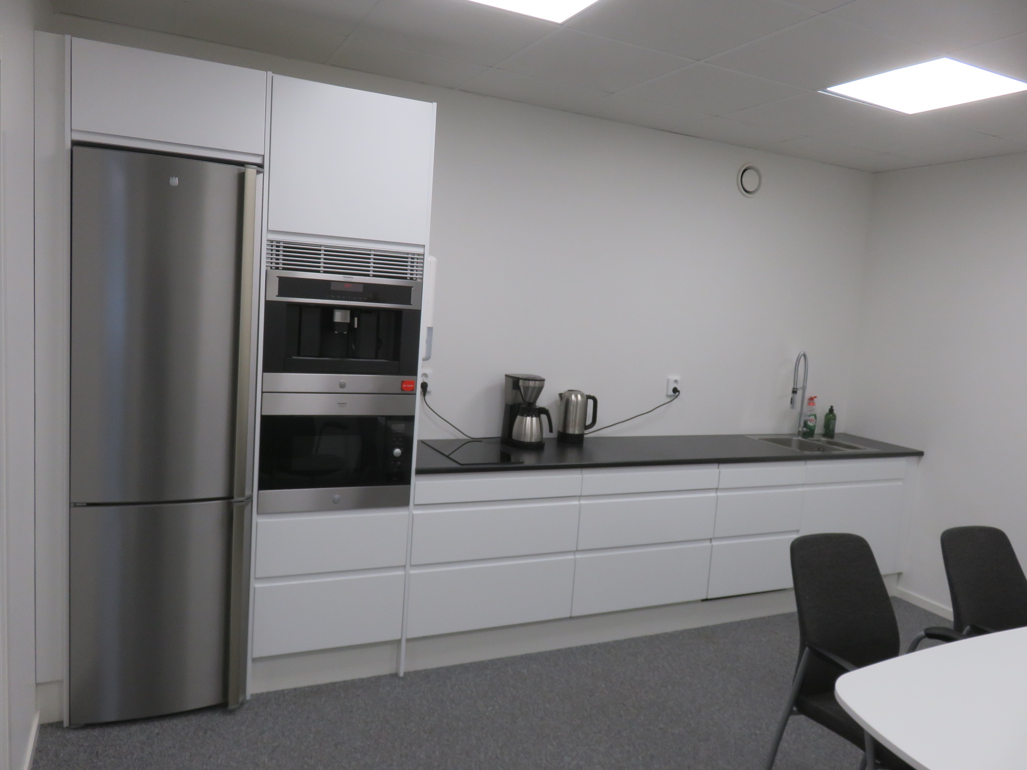 Lokalen har idag en öppen planlösning kombinerat med ett konferensrum, kök/personalrum, WC och omklädningsrum med bastu.