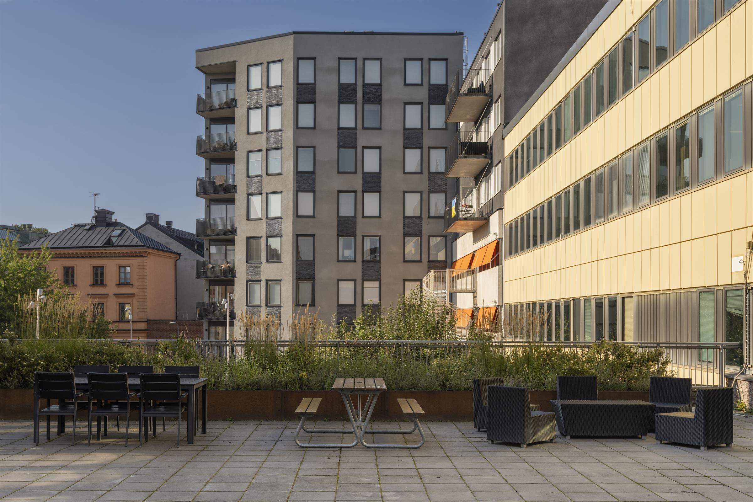 Utskikt från den gemensamma terrassen Mötesrum med utsikt St Persgatan 6 Pentryt centrerat i lokalen Många rum i olika storlekar för olika funktioner Välkommen Stort rumsindelat kontor blandat med öppet kontorslandskap Egen bastu och omklädningsrum! Stor gemensam terrass för aw:s och fikastunder Presentation med ritning