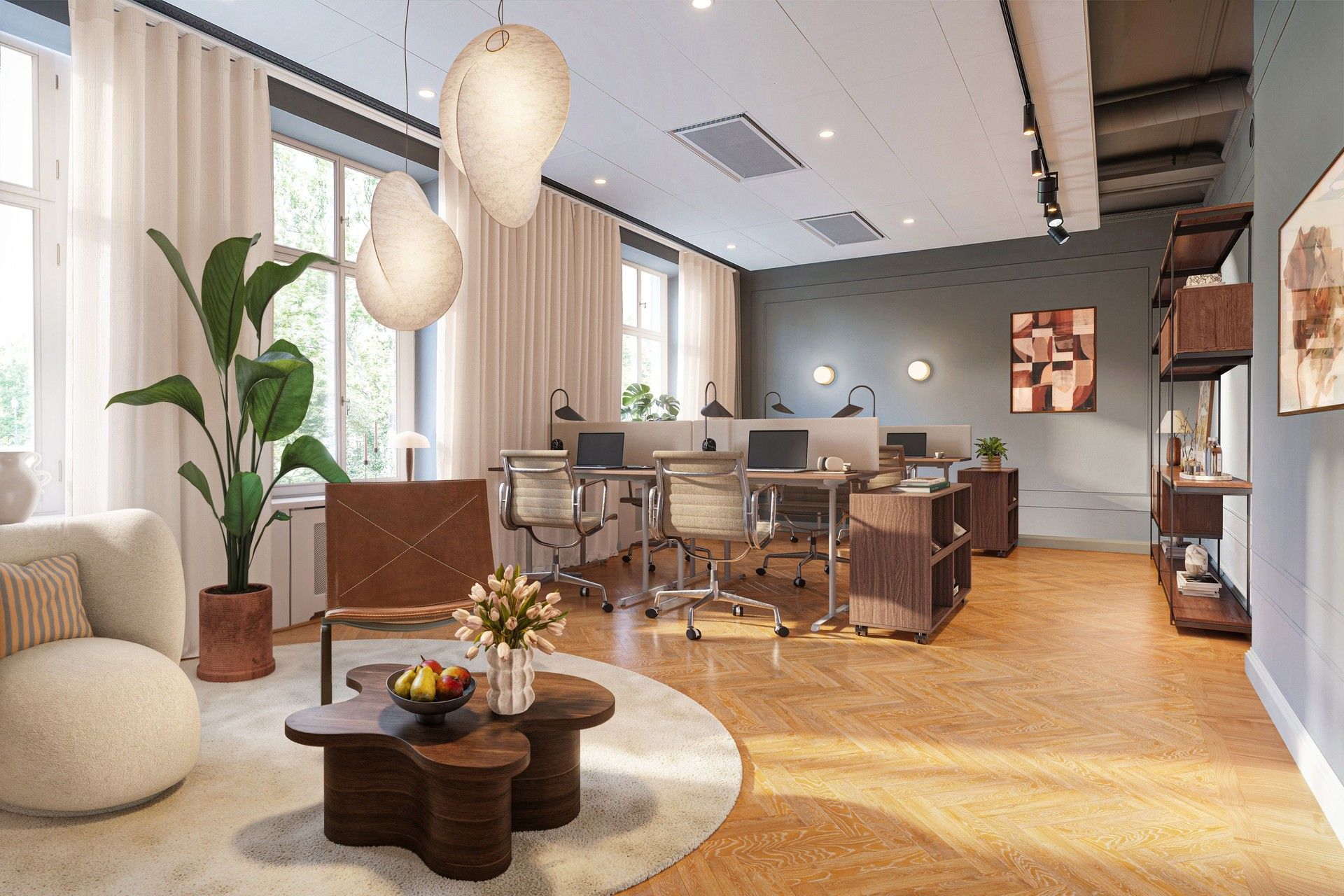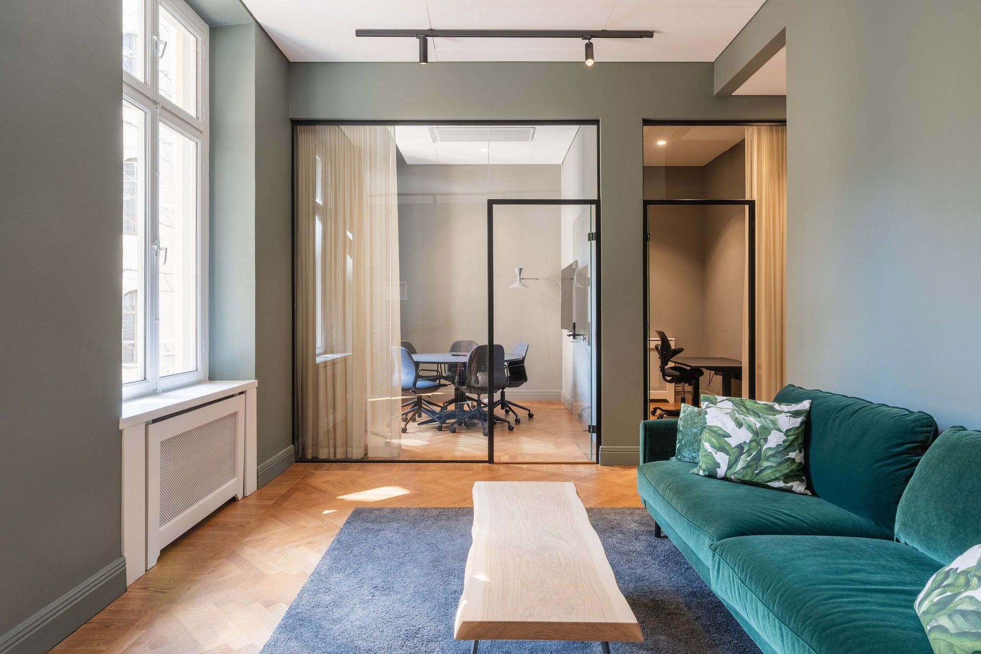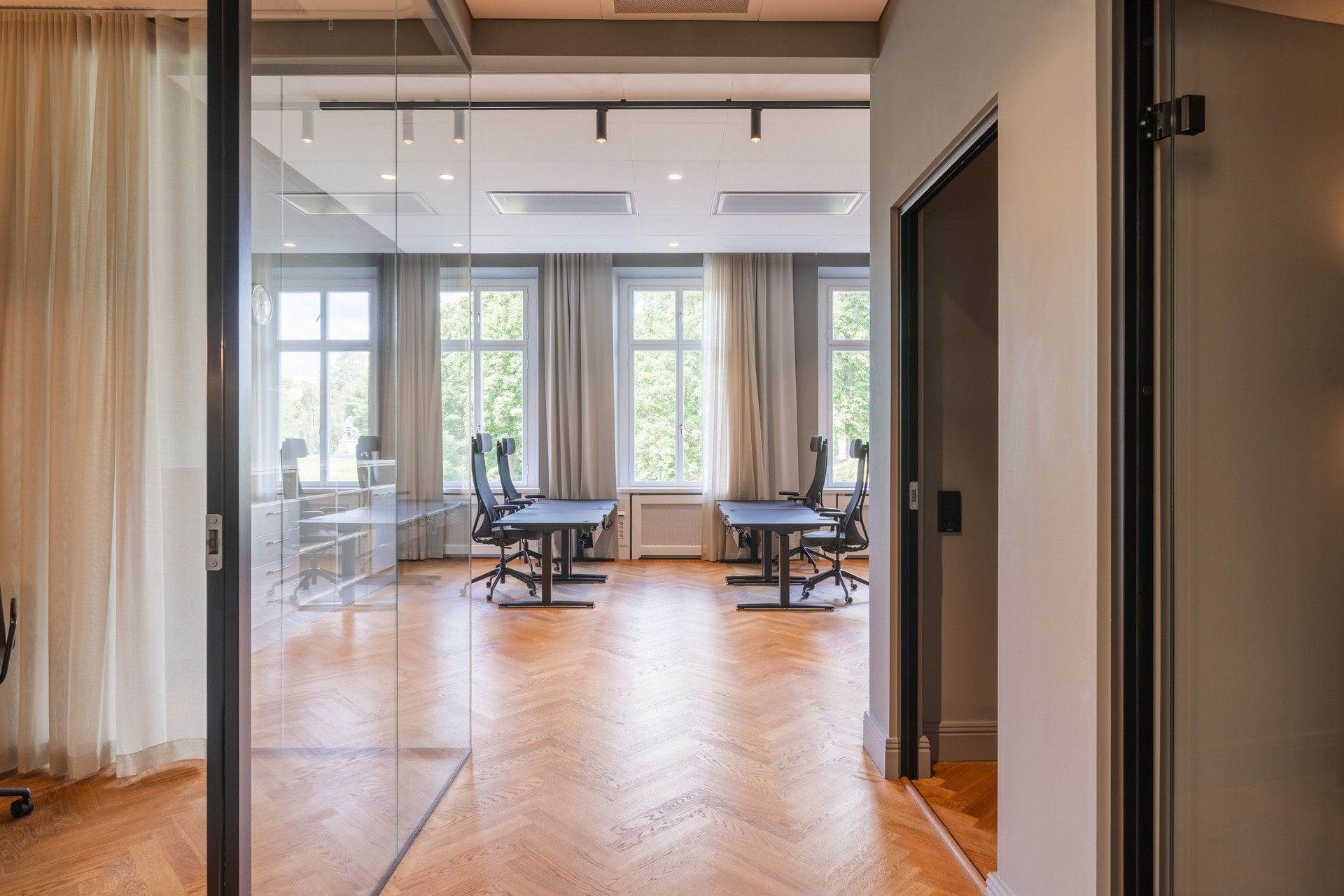 Ljusa och luftiga ytor: Högt i tak och stora fönster som ger rymd.