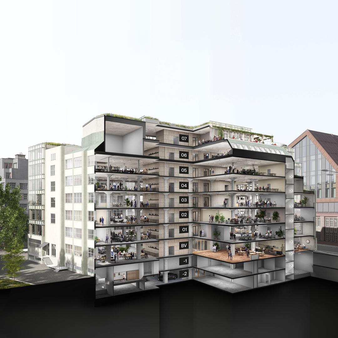 Byggnaden får en ny kostym med bevarad original karaktär, likt ett exklusivt vintage-plagg som skräddas om för att passa alla samtidens behov. De adderade byggdelarna och ytskikten har valts för att vara långsiktigt hållbara både i fråga om tillverkning, miljöpåverkan och för att kunna åldras med värdighet. Den rustika industri-karaktären spelar med det polerade, det nya spelar mot det gamla. Takterrassen och den magnifika utsikten ger huset Sjöstans finaste penthouse. I gatuplan finns plats för coworking. En oslipad diamant. Den nya lättillgängliga entrén mot Textilgatan och torget designas för att bli en spännande mötesplats som många har anledning att passera. Framför huset växer en ny torgmiljö fram med ett unikt gott mikroklimat och sol från morgon till kväll.