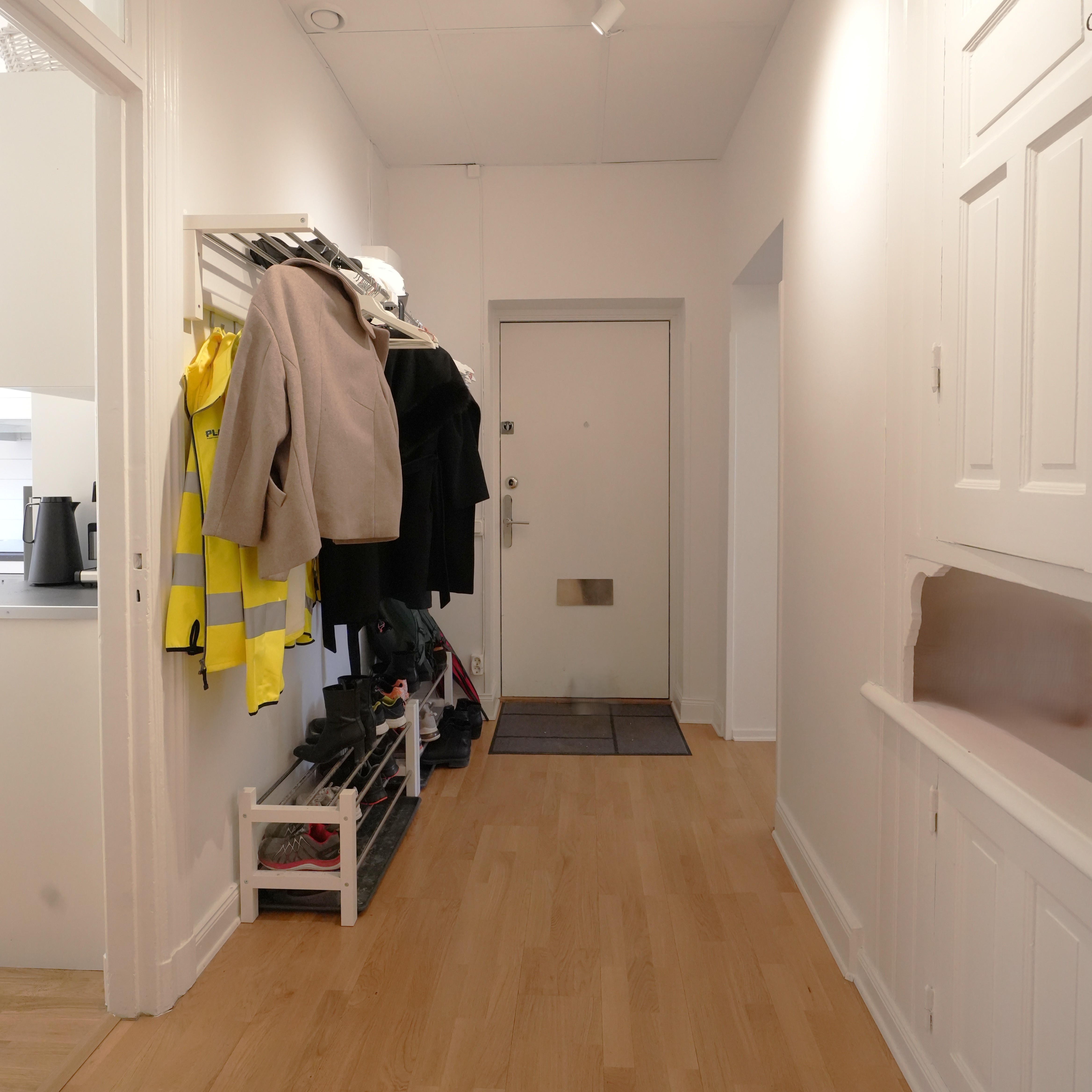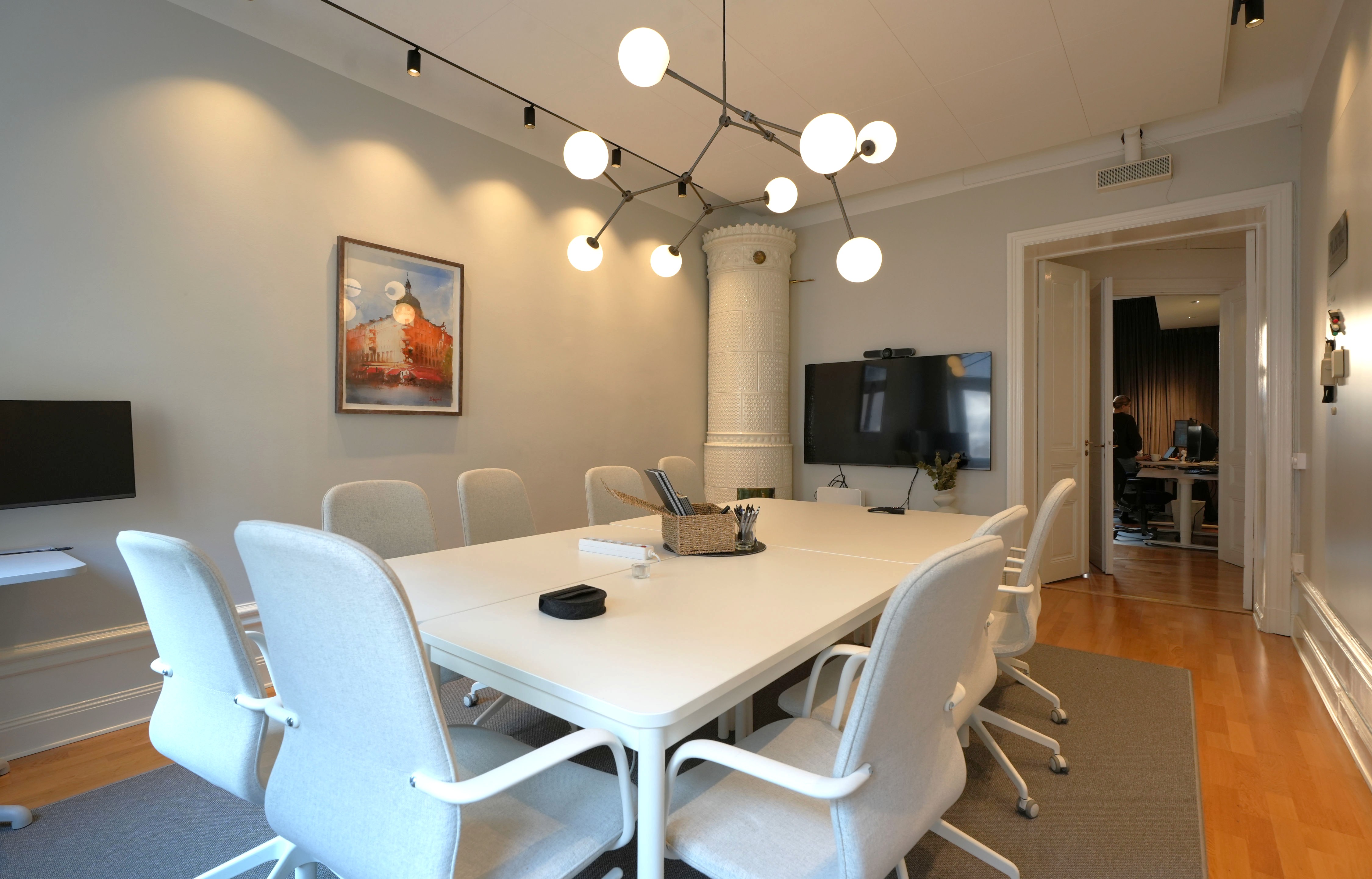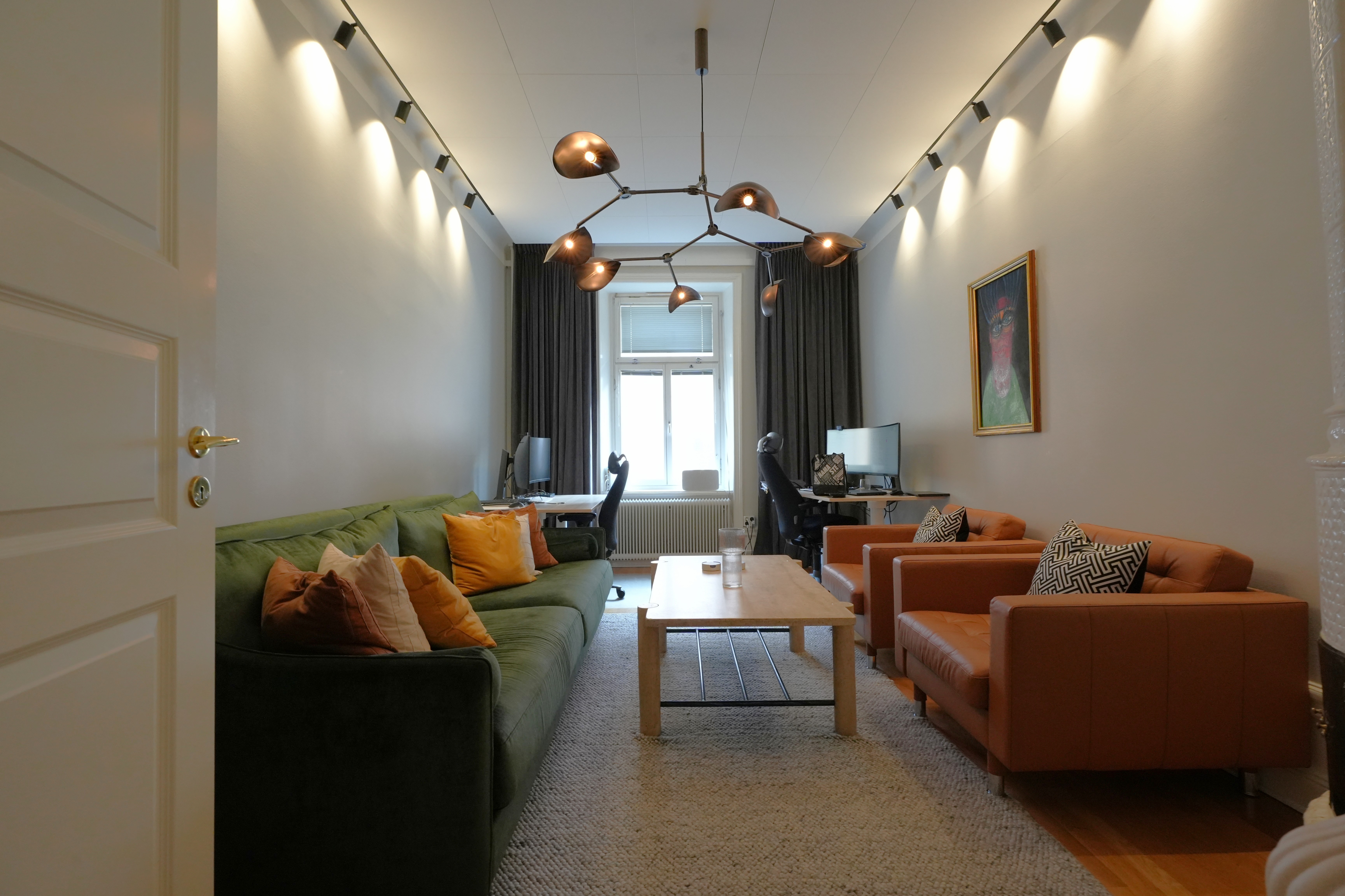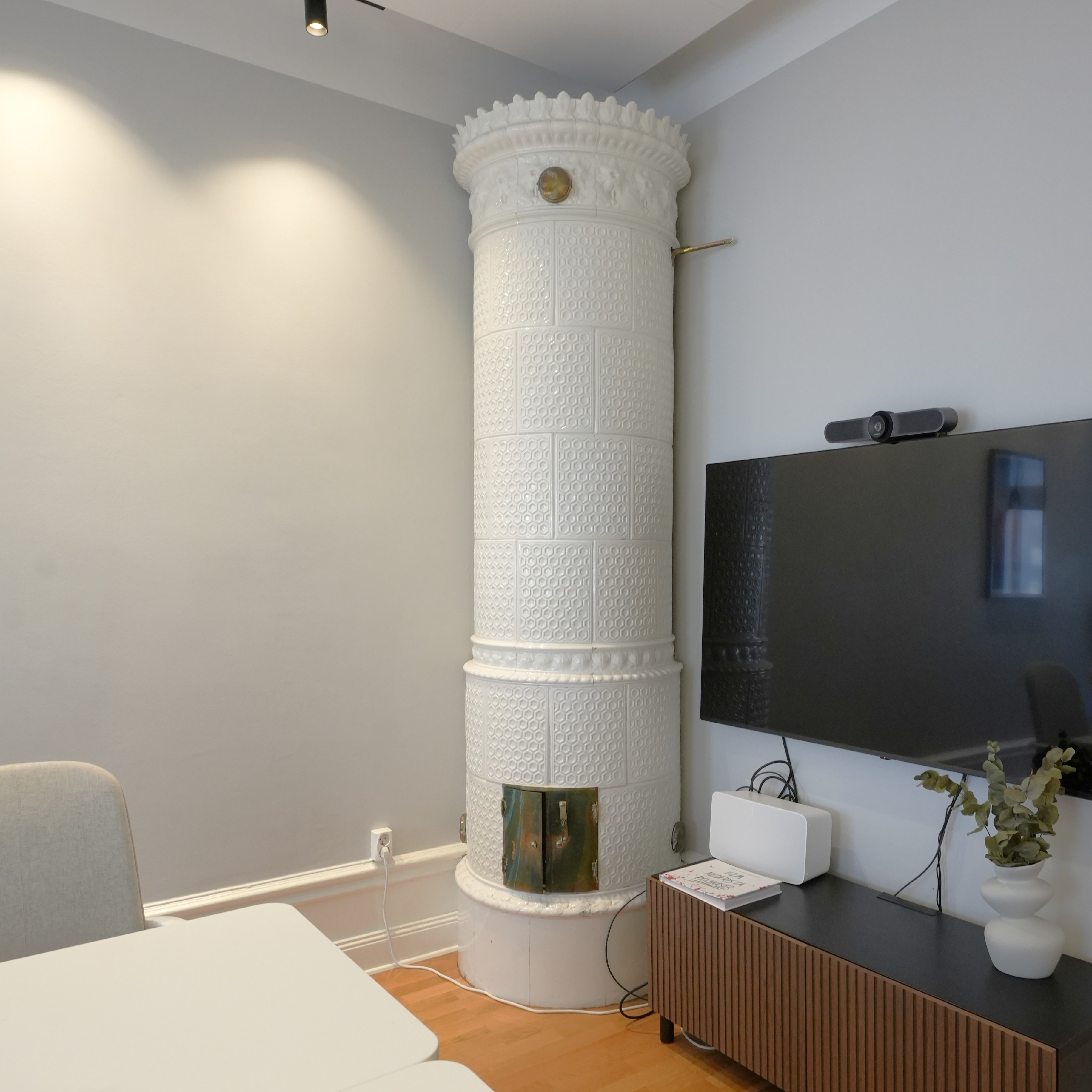 Trägolv och målade väggar, högt i tak och kakelugn. Lokalen ligger två trappor upp från gatan.